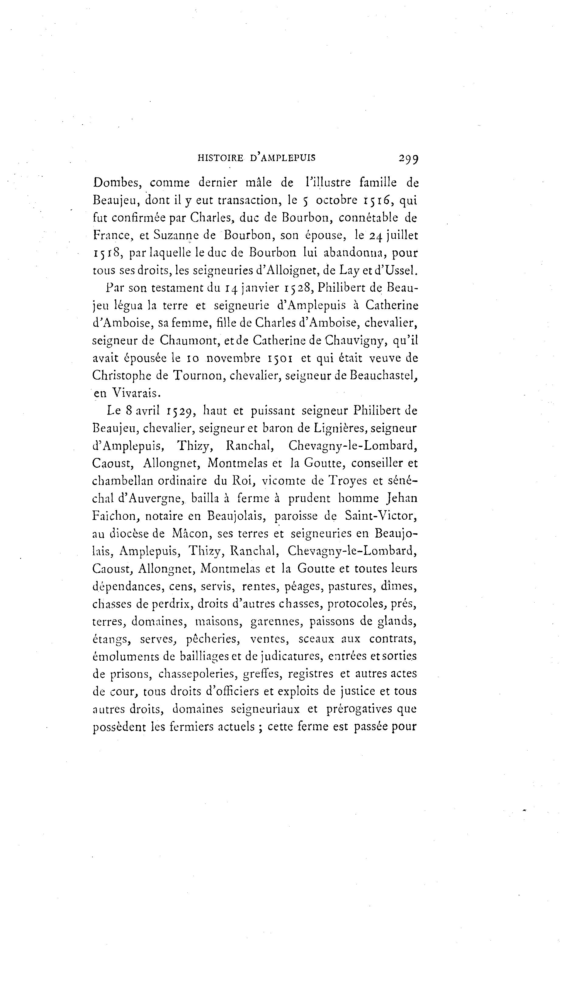 HISTOIRE D'AMPLEPUIS 299 Dombes, comme dernier mâle de l'illustre famille de Beaujeu, dont il y eut transaction, le 5 octobre 1516, qui fut confirmée par Charles, duc de Bourbon, connétable de France, et Suzanne de Bourbon, son épouse, le 24 juillet 1518, par laquelle le duc de Bourbon lui abandonna, pour tous ses droits, les seigneuries d'Alloignet, de Lay et d'Ussel. Par son testament du 14 janvier 1528, Philibert de Beau- jeu légua la terre et seigneurie d'Amplepuis à Catherine d'Amboise, sa femme, fille de Charles d'Amboise, chevalier, seigneur de Chaumont, et de Catherine de Chauvigny, qu'il avait épousée le 10 novembre 1501 et qui était veuve de Christophe de Tournon, chevalier, seigneur de Beauchastel, en Vivarais. Le 8 avril 1529, haut et puissant seigneur Philibert de Beaujeu, chevalier, seigneur et baron de Lignières, seigneur d'Amplepuis, Thizy, Ranchal, Chevagny-le-Lombard, Caoust, Allongnet, Montmelas et la Goutte, conseiller et chambellan ordinaire du Roi, vicomte de Troyes et séné- chal d'Auvergne, bailla à ferme à prudent homme Jehan Faichon, notaire en Beaujolais, paroisse de Saint-Victor, au diocèse de Mâcon, ses terres et seigneuries en Beaujo- lais, Amplepuis, Thizy, Ranchal, Chevagny-le-Lombard, Caoust, Allongnet, Montmelas et la Goutte et toutes leurs dépendances, cens, servis, rentes, péages, pastures, dîmes, chasses de perdrix, droits d'autres chasses, protocoles, prés, terres, domaines, maisons, garennes, paissons de glands, étangs, serves, pêcheries, ventes, sceaux aux contrats, émoluments de bailliages et de judicatures, entrées et sorties de prisons, chassepoleries, greffes, registres et autres actes de cour, tous droits d'officiers et exploits de justice et tous autres droits, domaines seigneuriaux et prérogatives que possèdent les fermiers actuels ; cette ferme est passée pour