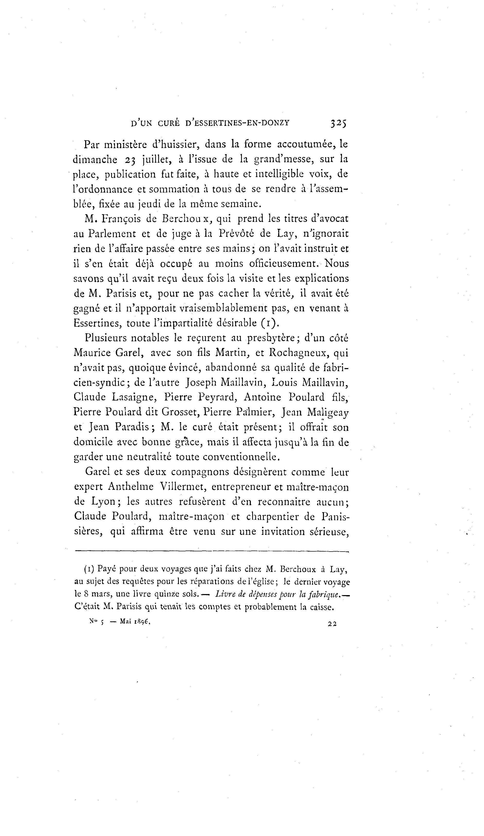 D'UN CURÉ D'ESSERTINES-EN-DONZY 325 Par ministère d'huissier, dans la forme accoutumée, le dimanche 23 juillet, à l'issue de la grand'messe, sur la place, publication fut faite, à haute et intelligible voix, de l'ordonnance et sommation à tous de se rendre à l'assem- blée, fixée au jeudi de la même semaine. M. François de Berchoux, qui prend les titres d'avocat au Parlement et de juge à la Prévôté de Lay, n'ignorait rien de l'affaire passée entre ses mains; on l'avait instruit et il s'en était déjà occupé au moins officieusement. Nous savons qu'il avait reçu deux fois la visite et les explications de M. Parisis et, pour ne pas cacher la vérité, il avait été gagné et il n'apportait vraisemblablement pas, en venant à Essertines, toute l'impartialité désirable ( r ) . Plusieurs notables le reçurent au presbytère; d'un côté Maurice Garel, avec son fils Martin, et Rochagneux, qui n'avait pas, quoique évincé, abandonné sa qualité de fabri- cien-syndic; de l'autre Joseph Maillavin, Louis Maillavin, Claude Lasaigne, Pierre Peyrard, Antoine Pouiard fils, Pierre Pouiard dit Grosset, Pierre Palmier, Jean Maligeay et Jean Paradis; M. le curé était présent; il offrait son domicile avec bonne grâce, mais il affecta jusqu'à la fin de garder une neutralité toute conventionnelle. Garel et ses deux compagnons désignèrent comme leur expert Anthelme Villermet, entrepreneur et maître-maçon de Lyon; les autres refusèrent d'en reconnaître aucun; Claude Pouiard, maître-maçon et charpentier de Panis- sières, qui affirma être venu sur une invitation sérieuse, (1) Payé pour deux voyages que j'ai faits chez M. Berchoux à Lay, au sujet des requêtes pour les réparations de l'église; le dernier voyage le 8 mars, une livre quinze sols.— Livre de dépenses pour la fabrique C'était M. Parisis qui tenait les comptes et probablement la caisse. N» s — Mai 1896, 22