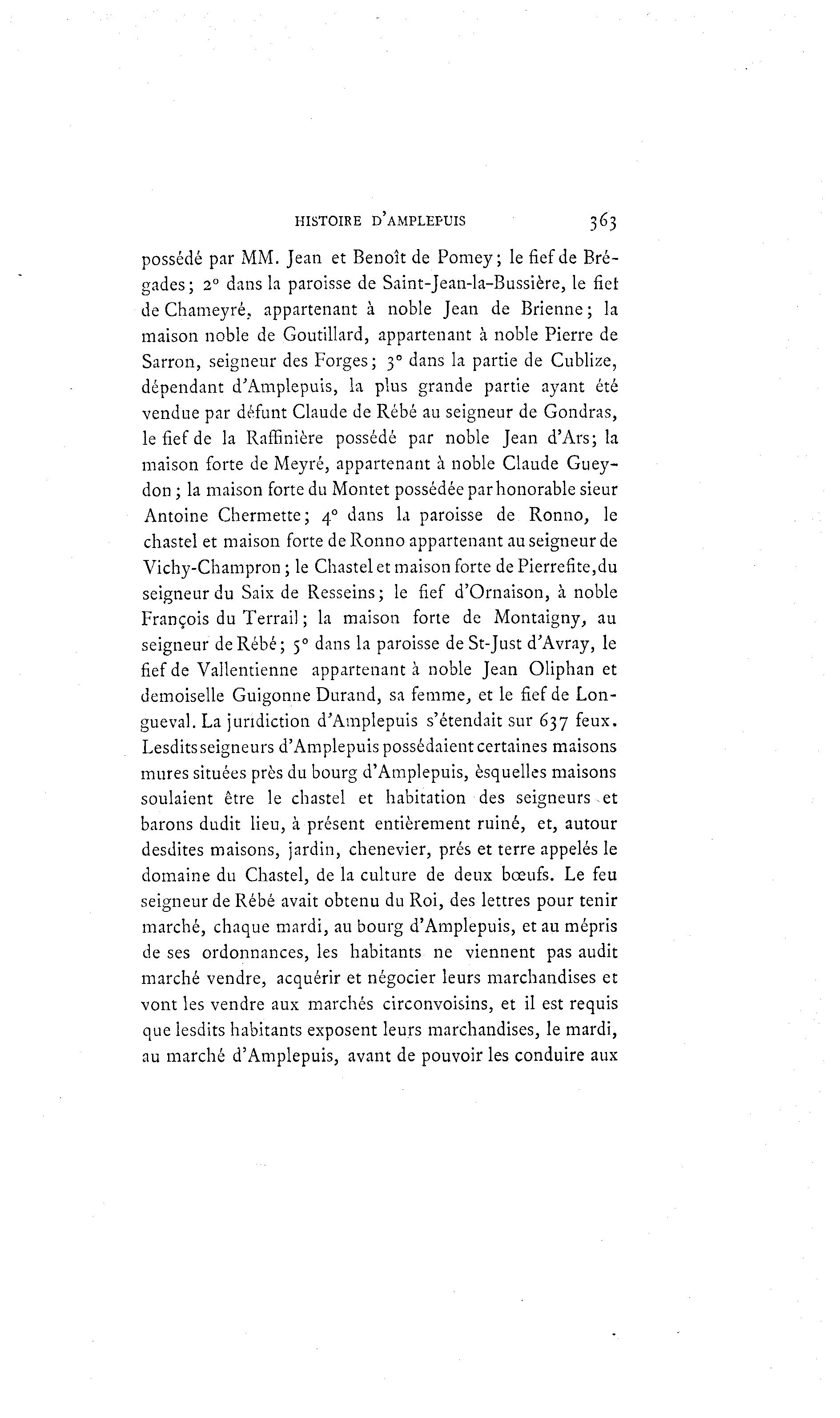 HISTOIRE D'AMPLEFUIS 363 possédé par MM. Jean et Benoît de Pomey; le fief de Bré- gades; 2° dans la paroisse de Saint-Jean-la-Bussière, le fief de Chameyré. appartenant à noble Jean de Brienne ; la maison noble de Goutillard, appartenant à noble Pierre de Sarron, seigneur des Forges; 3 0 dans la partie de Cublize, dépendant d'Amplepuis, la plus grande partie ayant été vendue par défunt Claude de Rébé au seigneur de Gondras, le fief de la Raffinière possédé par noble Jean d'Ars; la maison forte de Meyré, appartenant à noble Claude Guey- don ; la maison forte du Montet possédée par honorable sieur Antoine Chermette; 4 0 dans la paroisse de Ronno, le chastel et maison forte deRonno appartenant au seigneur de Vichy-Champron ; le Chastel et maison forte de Pierrefite,du seigneur du Saix de Resseins; le fief d'Ornaison, à noble François du Terrai! ; la maison forte de Montaigny, au seigneur de Rébé; 50 dans la paroisse de St-Just d'Avray, le fief de Vallentienne appartenant à noble Jean Oliphan et demoiselle Guigonne Durand, sa femme, et le fief de Lon- gue val. La juridiction d'Amplepuis s'étendait sur 637 feux. Lesdits seigneurs d'Amplepuis possédaient certaines maisons mures situées près du bourg d'Amplepuis, èsquelles maisons soûlaient être le chastel et habitation des seigneurs et barons dudit lieu, à présent entièrement ruiné, et, autour desdites maisons, jardin, chenevier, prés et terre appelés le domaine du Chastel, de la culture de deux bœufs. Le feu seigneur de Rébé avait obtenu du Roi, des lettres pour tenir marché, chaque mardi, au bourg d'Amplepuis, et au mépris de ses ordonnances, les habitants ne viennent pas audit marché vendre, acquérir et négocier leurs marchandises et vont les vendre aux marchés circonvoisins, et il est requis que lesdits habitants exposent leurs marchandises, le mardi, au marché d'Amplepuis, avant de pouvoir les conduire aux