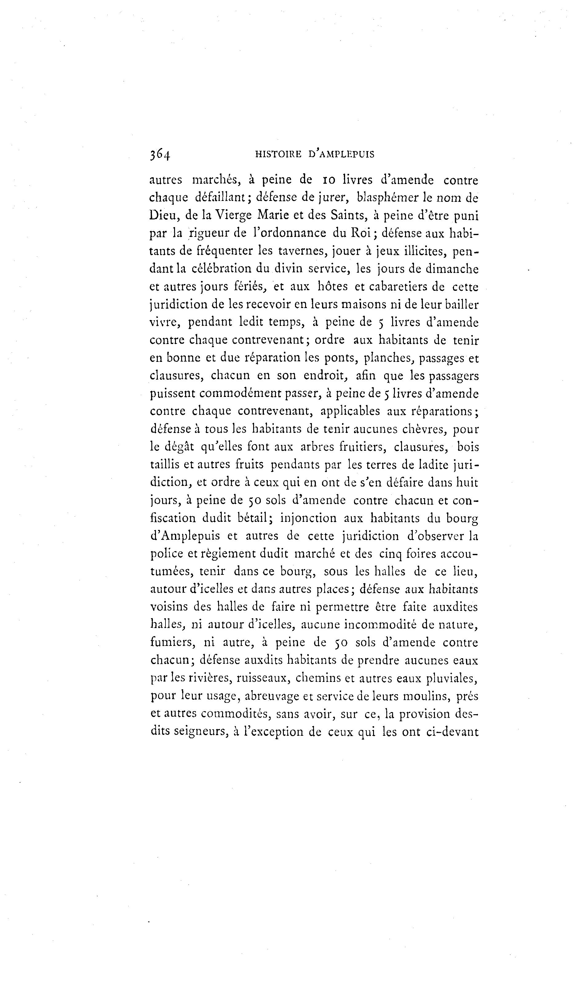364 HISTOIRE D'AMPLEPUIS autres marchés, à peine de 10 livres d'amende contre chaque défaillant; défense de jurer, blasphémer le nom de Dieu, de la Vierge Marie et des Saints, à peine d'être puni par la rigueur de l'ordonnance du Roi ; défense aux habi- tants de fréquenter les tavernes, jouer à jeux illicites, pen- dant la célébration du divin service, les jours de dimanche et autres jours fériés, et aux hôtes et cabaretiers de cette juridiction de les recevoir en leurs maisons ni de leur bailler vivre, pendant ledit temps, à peine de 5 livres d'amende contre chaque contrevenant; ordre aux habitants de tenir en bonne et due réparation les ponts, planches, passages et clausures, chacun en son endroit, afin que les passagers puissent commodément passer, à peine de 5 livres d'amende contre chaque contrevenant, applicables aux réparations ; défense à tous les habitants de tenir aucunes chèvres, pour le dégât qu'elles font aux arbres fruitiers, clausures, bois taillis et autres fruits pendants par les terres de ladite juri- diction, et ordre à ceux qui en ont de s'en défaire dans huit jours, à peine de 50 sols d'amende contre chacun et con- fiscation dudit bétail; injonction aux habitants du bourg d'Amplepuis et autres de cette juridiction d'observer la police et règlement dudit marché et des cinq foires accou- tumées, tenir dans ce bourg, sous les halles de ce lieu, autour d'icelles et dans autres places; défense aux habitants voisins des halles de faire ni permettre être faite auxdites halles, ni autour d'icelles, aucune incommodité de nature, fumiers, ni autre, à peine de 50 sols d'amende contre chacun; défense auxdits habitants de prendre aucunes eaux par les rivières, ruisseaux, chemins et autres eaux pluviales, pour leur usage, abreuvage et service de leurs moulins, prés et autres commodités, sans avoir, sur ce, la provision des- dits seigneurs, à l'exception de ceux qui les ont ci-devant