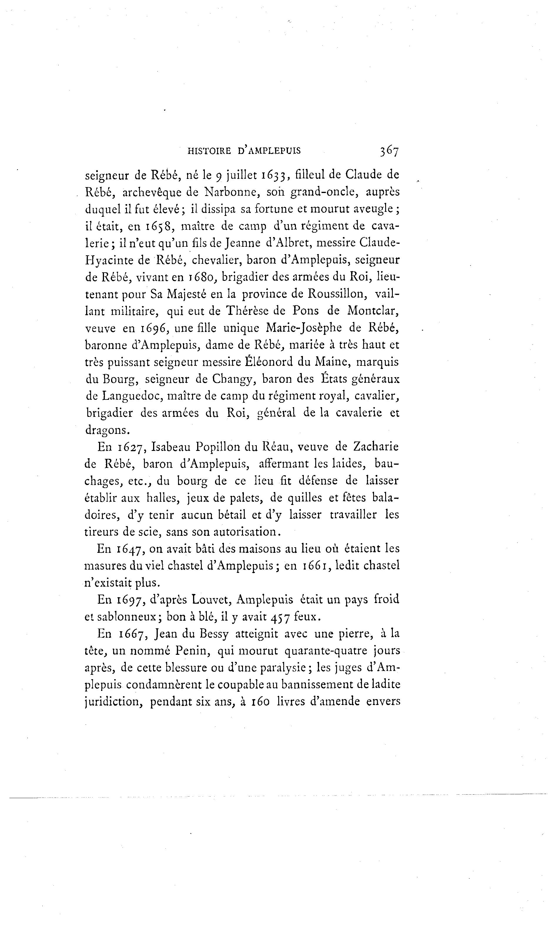 HISTOIRE D'AMPLEPUIS 367 seigneur de Rébé, né le 9 juillet 1633, filleul de Claude de Rébé, archevêque de Narbonne, son grand-oncle, auprès duquel il fut élevé ; il dissipa sa fortune et mourut aveugle ; il était, en 1658, maître de camp d'un régiment de cava- lerie; il n'eut qu'un fils de Jeanne d'Albret, messire Claude- Hyacinte de Rébé, chevalier, baron d'Amplepuis, seigneur de Rébé, vivant en 1680, brigadier des armées du Roi, lieu- tenant pour Sa Majesté en la province de Roussillon, vail- lant militaire, qui eut de Thérèse de Pons de Montclar, veuve en 1696, une fille unique Marie-Josèphe de Rébé, baronne d'Amplepuis, dame de Rébé, mariée à très haut et très puissant seigneur messire Éléonord du Maine, marquis du Bourg, seigneur de Changy, baron des États généraux de Languedoc, maître de camp du régiment royal, cavalier, brigadier des armées du Roi, général de la cavalerie et dragons. En 1627, Isabeau Popillon du Réau, veuve de Zacharie de Rébé, baron d'Amplepuis, affermant les laides, bau- chages, etc., du bourg de ce lieu fit défense de laisser établir aux halles, jeux de palets, de quilles et fêtes bala- doires, d'y tenir aucun bétail et d'y laisser travailler les tireurs de scie, sans son autorisation. En 1647, on avait bâti des maisons au lieu où étaient les masures duviel chastel d'Amplepuis; en 1661, ledit chastel n'existait plus. En 1697, d'après Louvet, Amplepuis était un pays froid et sablonneux; bon à blé, il y avait 457 feux. En 1667, Jean du Bessy atteignit avec une pierre, à la tête, un nommé Penin, qui mourut quarante-quatre jours après, de cette blessure ou d'une paralysie; les juges d'Am- plepuis condamnèrent le coupable au bannissement de ladite juridiction, pendant six ans, à 160 livres d'amende envers