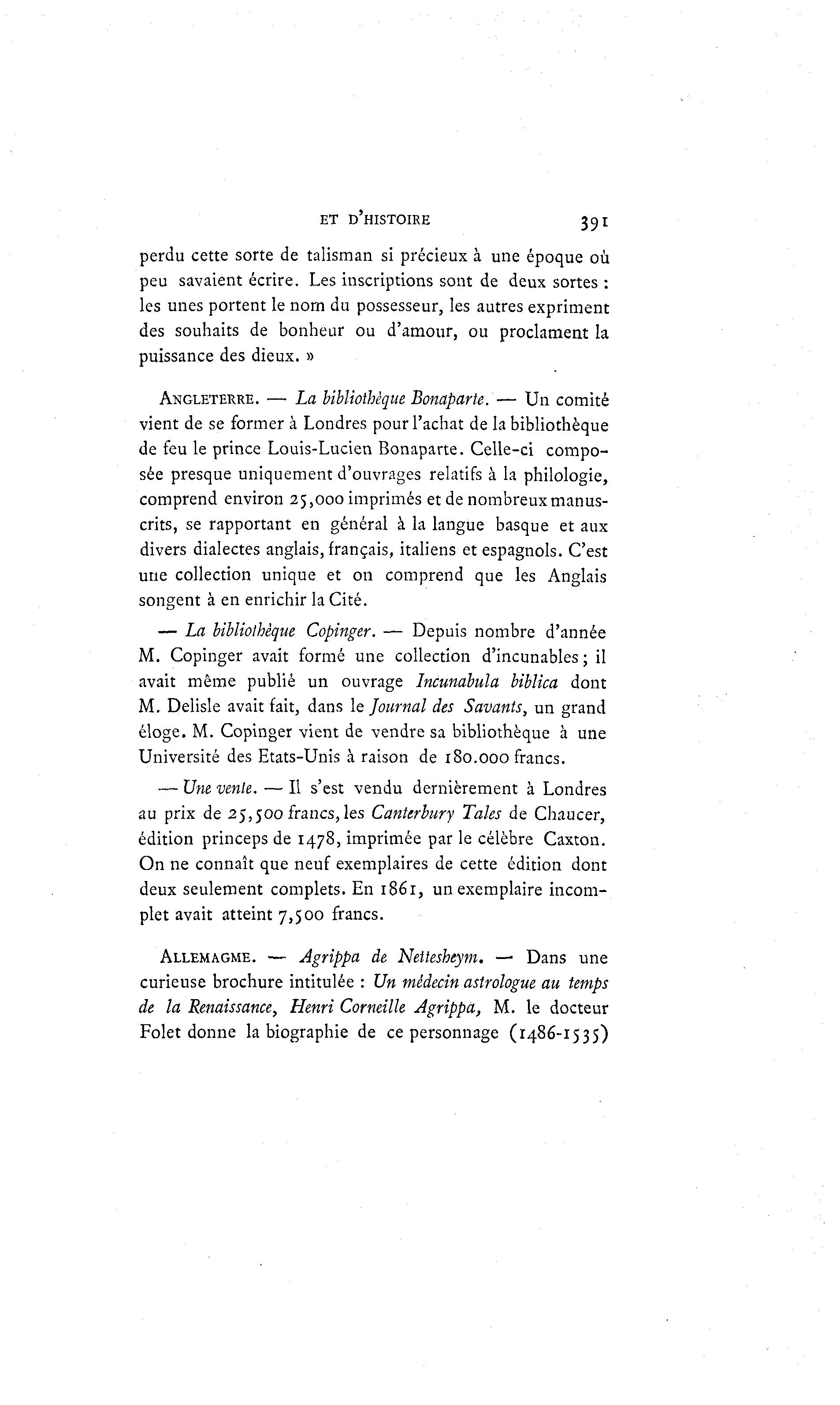 ET D'HISTOIRE 391 perdu cette sorte de talisman si précieux à une époque où peu savaient écrire. Les inscriptions sont de deux sortes : les unes portent le nom du possesseur, les autres expriment des souhaits de bonheur ou d'amour, ou proclament la puissance des dieux. » ANGLETERRE. — La bibliothèque Bonaparte. — Un comité vient de se former à Londres pour l'achat de la bibliothèque de feu le prince Louis-Lucien Bonaparte. Celle-ci compo- sée presque uniquement d'ouvrages relatifs à la philologie, comprend environ 25,000 imprimés et de nombreux manus- crits, se rapportant en général à la langue basque et aux divers dialectes anglais, français, italiens et espagnols. C'est une collection unique et on comprend que les Anglais songent à en enrichir la Cité. — La bibliothèque Copinger. — Depuis nombre d'année M. Copinger avait formé une collection d'incunables ; il avait même publié un ouvrage Incunabula biblica dont M. Delisle avait fait, dans le Journal des Savants, un grand éloge. M. Copinger vient de vendre sa bibliothèque à une Université des Etats-Unis à raison de 180.000 francs. — Une vente. — Il s'est vendu dernièrement à Londres au prix de 25,500 francs,les Canterbury Taies de Chaucer, édition princeps de 1478, imprimée par le célèbre Caxton. On ne connaît que neuf exemplaires de cette édition dont deux seulement complets. En 1861, un exemplaire incom- plet avait atteint 7,500 francs. ALLEMAGME. — Agrippa de Neitesheym. — Dans une curieuse brochure intitulée : Un médecin astrologue au temps de la Renaissance, Henri Corneille Agrippa, M. le docteur Folet donne la biographie de ce personnage (1486-1535)