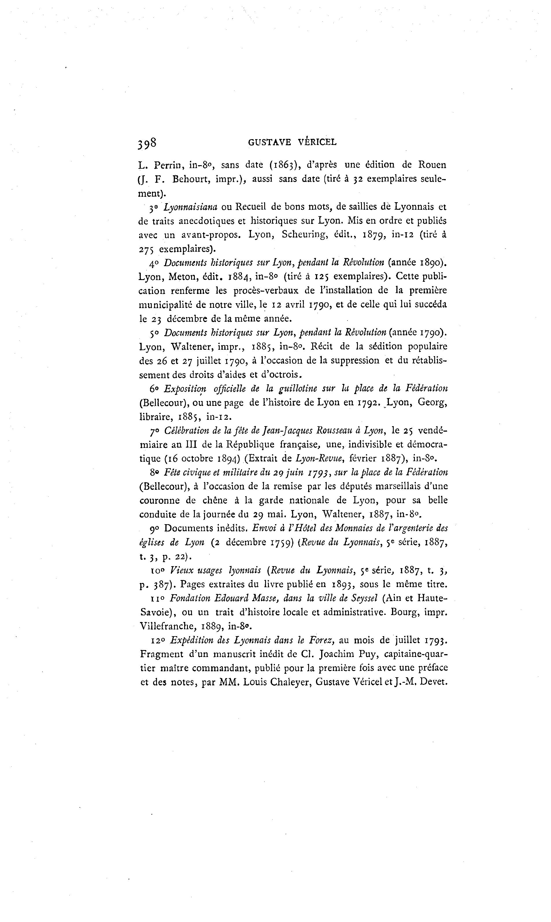 398 GUSTAVE VÉRICEL L. Perrin, in-8°, sans date (1863), d'après une édition de Rouen (J. F. Behourt, impr.), aussi sans date (tiré à 32 exemplaires seule- ment). 3" Lyonnaisiana ou Recueil de bons mots, de saillies de Lyonnais et de traits anecdotiques et historiques sur Lyon. Mis en ordre et publiés avec un avant-propos. Lyon, Scheuring, édit., 1879, in-12 (tiré à 275 exemplaires). 40 Documents historiques sur Lyon, pendant la Révolution (année 1890). Lyon, Meton, édit. 1884, in-8° (tiré à 125 exemplaires). Cette publi- cation renferme les procès-verbaux de l'installation de la première municipalité de notre ville, le 12 avril 1790, et de celle qui lui succéda le 23 décembre de la même année. 50 Documents historiques sur Lyon, pendant la Révolution (année 1790). Lyon, Waltener, impr., 1885, in-8°. Récit de la sédition populaire des 26 et 27 juillet 1790, à l'occasion de la suppression et du rétablis- sement des droits d'aides et d'octrois. 6° Exposition officielle de la guillotine sur la place de la Fédération (Bellecour), ou une page de l'histoire de Lyon en 1792. Lyon, Georg, libraire, 1885, in-12. 70 Célébration de la fête de Jean-Jacques Rousseau à Lyon, le 25 vendé- miaire an III de la République française, une, indivisible et démocra- tique (16 octobre 1894) (Extrait de Lyon-Revue, février 1887), in-8°. 8° Fête civique et militaire du 2g juin 1793, sur la place de la Fédération (Bellecour), à l'occasion de la remise par les députés marseillais d'une couronne de chêne à la garde nationale de Lyon, pour sa belle conduite de la journée du 29 mai. Lyon, Waltener, 1887, in-8°. 9 0 Documents inédits. Envoi à l'Hôtel des Monnaies de Targenterie des églises de Lyon (2 décembre 1759) (Revue du Lyonnais, 5e série, 1887, t. 3, p. 22). to° Vieux usages lyonnais (Revue du Lyonnais, j« série, 1887, t. 3, p. 387). Pages extraites du livre publié en 1893, sous le même titre. 11° Fondation Edouard Masse, dans la ville de Seyssel (Ain et Haute- Savoie) , ou un trait d'histoire locale et administrative. Bourg, impr. Villefranche, 1889, in-8". 12° Expédition dts Lyonnais dans le Forez, au mois de juillet 1793. Fragment d'un manuscrit inédit de Cl. Joachim Puy, capitaine-quar- tier maître commandant, publié pour la première fois avec une préface et des notes, par MM. Louis Chaleyer, Gustave Véricelet J.-M. Devet.