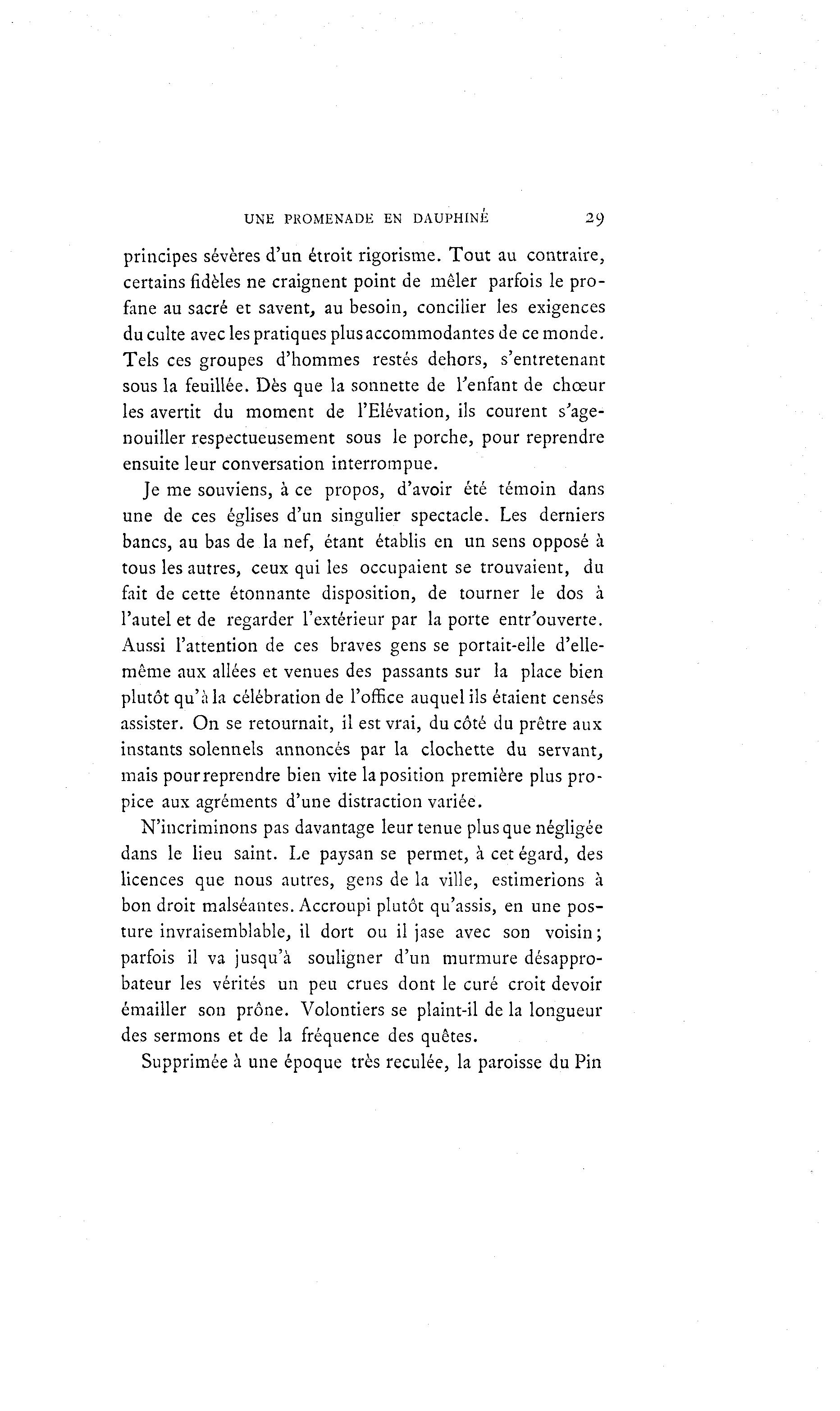 UNE PROMENADE EN DAUPHINE 29 principes sévères d'un étroit rigorisme. Tout au contraire, certains fidèles ne craignent point de mêler parfois le pro- fane au sacré et savent, au besoin, concilier les exigences du culte avec les pratiques plus accommodantes de ce monde. Tels ces groupes d'hommes restés dehors, s'entretenant sous la feuillée. Dès que la sonnette de l'enfant de chœur les avertit du moment de l'Elévation, ils courent s'age- nouiller respectueusement sous le porche, pour reprendre ensuite leur conversation interrompue. Je me souviens, à ce propos, d'avoir été témoin dans une de ces églises d'un singulier spectacle. Les derniers bancs, au bas de la nef, étant établis en un sens opposé à tous les autres, ceux qui les occupaient se trouvaient, du fait de cette étonnante disposition, de tourner le dos à l'autel et de regarder l'extérieur par la porte entr'ouverte. Aussi l'attention de ces braves gens se portait-elle d'elle- même aux allées et venues des passants sur la place bien plutôt qu'à la célébration de l'office auquel ils étaient censés assister. On se retournait, il est vrai, du côté du prêtre aux instants solennels annoncés par la clochette du servant, mais pour reprendre bien vite la position première plus pro- pice aux agréments d'une distraction variée. N'incriminons pas davantage leur tenue plus que négligée dans le lieu saint. Le paysan se permet, à cet égard, des licences que nous autres, gens de la ville, estimerions à bon droit malséantes. Accroupi plutôt qu'assis, en une pos- ture invraisemblable, il dort ou il jase avec son voisin ; parfois il va jusqu'à souligner d'un murmure désappro- bateur les vérités un peu crues dont le curé croit devoir émailler son prône. Volontiers se plaint-il de la longueur des sermons et de la fréquence des quêtes. Supprimée à une époque très reculée, la paroisse du Pin