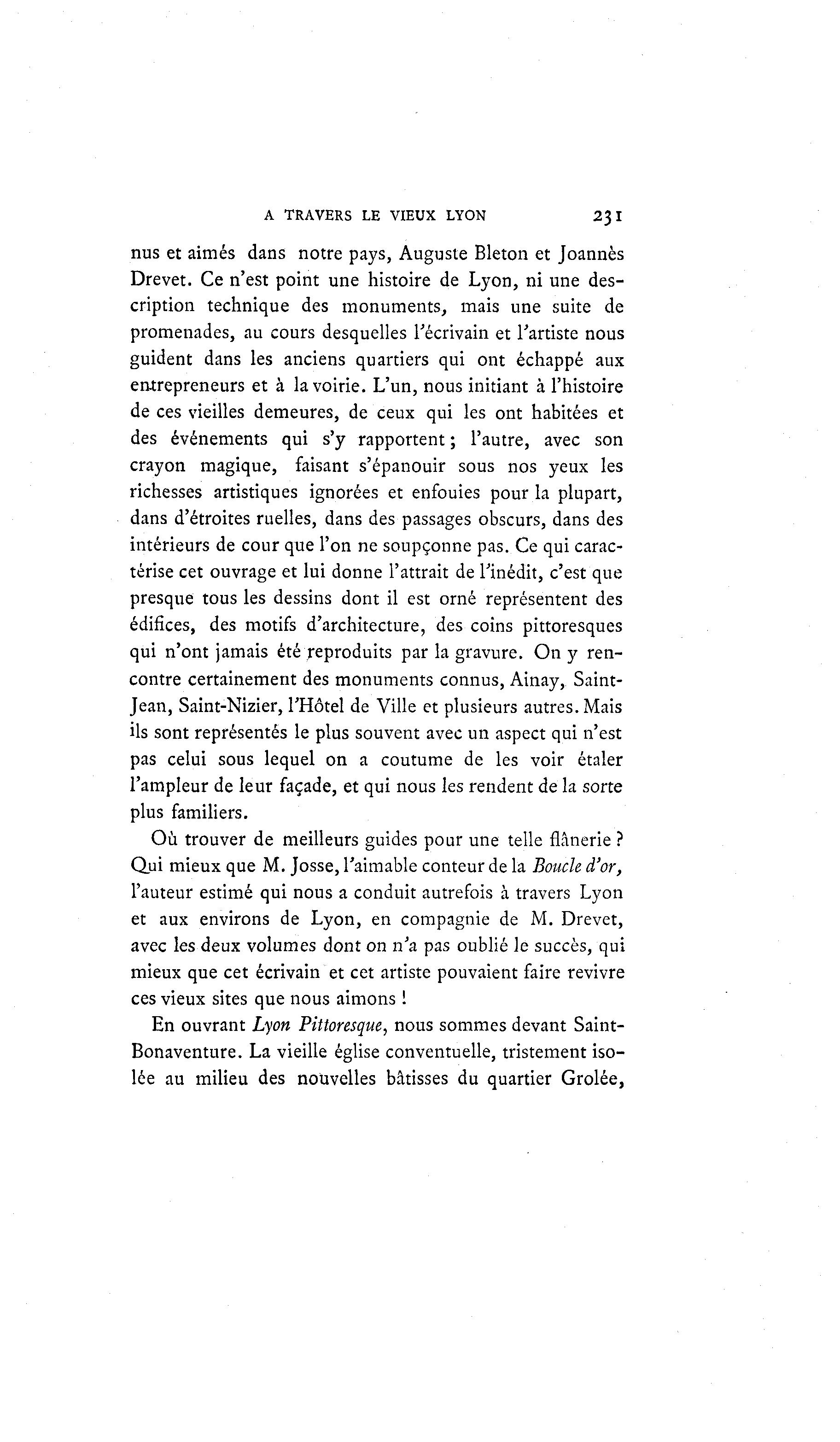 A TRAVERS LE VIEUX LYON 23 I nus et aimés dans notre pays, Auguste Bleton et Joannès Drevet. Ce n'est point une histoire de Lyon, ni une des- cription technique des monuments, mais une suite de promenades, au cours desquelles l'écrivain et l'artiste nous guident dans les anciens quartiers qui ont échappé aux entrepreneurs et à la voirie. L'un, nous initiant à l'histoire de ces vieilles demeures, de ceux qui les ont habitées et des événements qui s'y rapportent ; l'autre, avec son crayon magique, faisant s'épanouir sous nos yeux les richesses artistiques ignorées et enfouies pour la plupart, dans d'étroites ruelles, dans des passages obscurs, dans des intérieurs de cour que l'on ne soupçonne pas. Ce qui carac- térise cet ouvrage et lui donne l'attrait de l'inédit, c'est que presque tous les dessins dont il est orné représentent des édifices, des motifs d'architecture, des coins pittoresques qui n'ont jamais été reproduits par la gravure. On y ren- contre certainement des monuments connus, Ainay, Saint- Jean, Saint-Nizier, l'Hôtel de Ville et plusieurs autres. Mais ils sont représentés le plus souvent avec un aspect qui n'est pas celui sous lequel on a coutume de les voir étaler l'ampleur de leur façade, et qui nous les rendent de la sorte plus familiers. Où trouver de meilleurs guides pour une telle flânerie ? Qui mieux que M. Josse, l'aimable conteur de la Boucle d'or, l'auteur estimé qui nous a conduit autrefois à travers Lyon et aux environs de Lyon, en compagnie de M. Drevet, avec les deux volumes dont on n'a pas oublié le succès, qui mieux que cet écrivain et cet artiste pouvaient faire revivre ces vieux sites que nous aimons ! En ouvrant Lyon Pittoresque, nous sommes devant Saint- Bonaventure. La vieille église conventuelle, tristement iso- lée au milieu des nouvelles bâtisses du quartier Grolée,