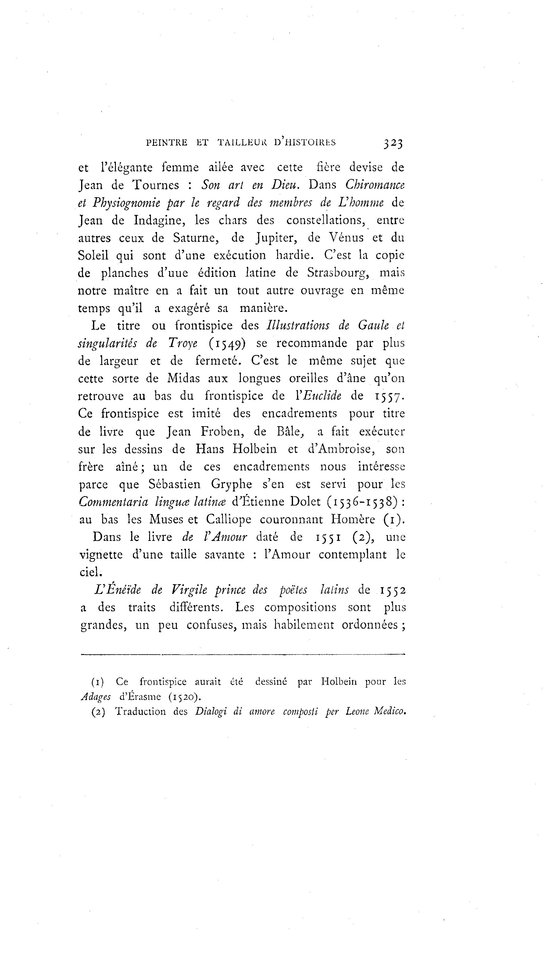 PEINTRE ET TAILLEUR D'HISTOIRES 323 et l'élégante femme ailée avec cette flère devise de Jean de Tournes : Son art en Dieu. Dans Chiromance et Physiognomie par le regard des membres de L'homme de Jean de Indagine, les chars des constellations, entre autres ceux de Saturne, de Jupiter, de Vénus et du Soleil qui sont d'une exécution hardie. C'est la copie de planches d'uue édition latine de Strasbourg, mais notre maître en a fait un tout autre ouvrage en même temps qu'il a exagéré sa manière. Le titre ou frontispice des Illustrations de Gaule et singularités de Troye (1549) se recommande par plus de largeur et de fermeté. C'est le même sujet que cette sorte de Midas aux longues oreilles d'âne qu'on retrouve au bas du frontispice de YEuclide de 1557. Ce frontispice est imité des encadrements pour titre de livre que Jean Froben, de Bâle, a fait exécuter sur les dessins de Hans Holbein et d'Ambroise, son frère aîné ; un de ces encadrements nous intéresse parce que Sébastien Gryphe s'en est servi pour les Commentaria linguœ latinœ d'Etienne Dolet (1536-1538) : au bas les Muses et Calliope couronnant Homère (1). Dans le livre de l'Amour daté de 1551 (2), une vignette d'une taille savante : l'Amour contemplant le ciel. L'Enéide de Virgile prince des poètes latins de 1552 a des traits différents. Les compositions sont plus grandes, un peu confuses, mais habilement ordonnées ; (1) Ce frontispice aurait été dessiné par Holbein pour les Adages d'Erasme (1520). (2) Traduction des Dialogi ai amore composti per Leone Medico.