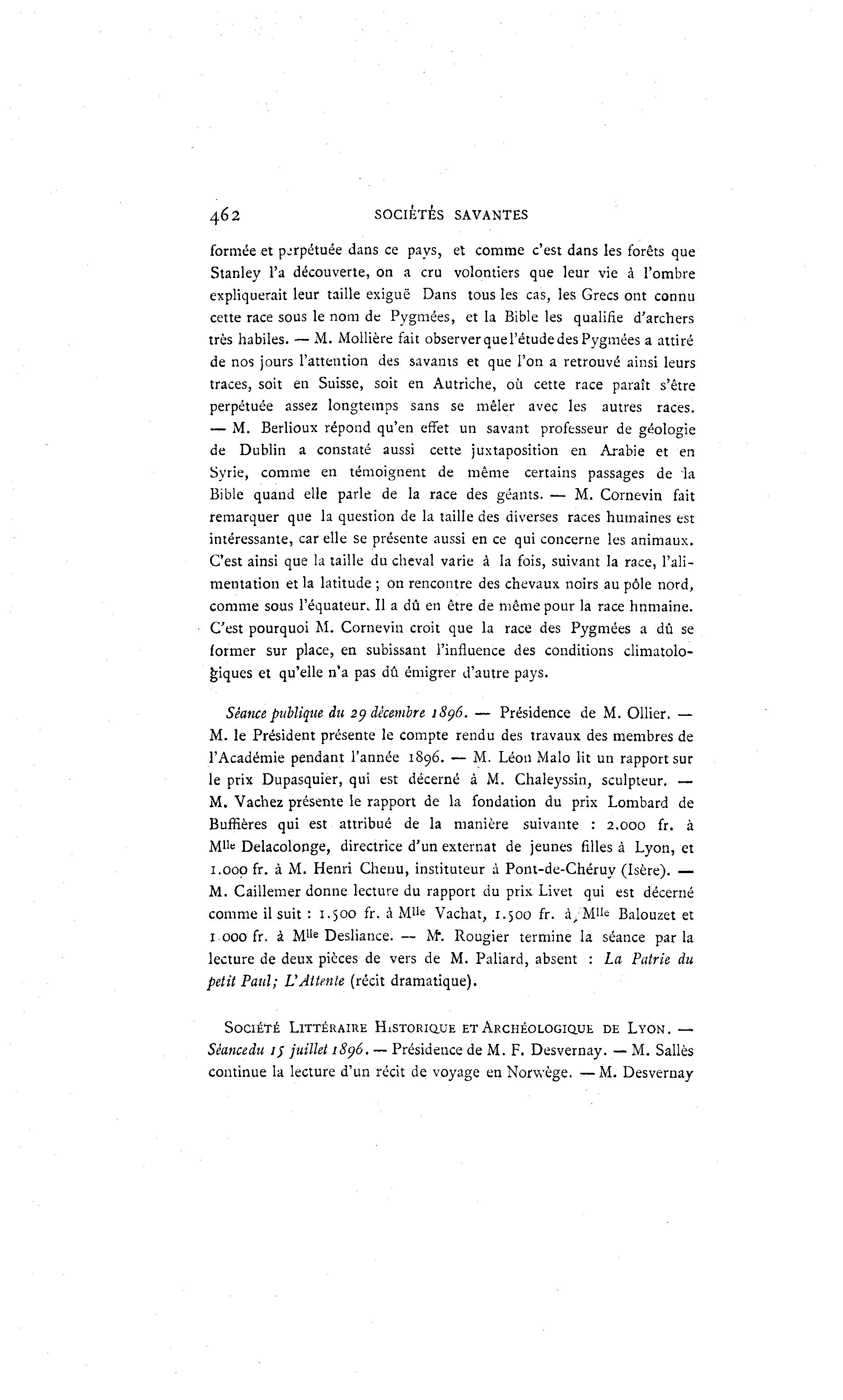 462 SOCIÉTÉS SAVANTES formée et perpétuée dans ce pays, et comme c'est dans les forêts que Stanley l'a découverte, on a cru volontiers que leur vie à l'ombre expliquerait leur taille exiguë Dans tous les cas, les Grecs ont connu cette race sous le nom de Pygmées, et la Bible les qualifie d'archers très habiles. — M. Mollière fait observerquel'étudedesPygmées a attiré de nos jours l'attention des savants et que l'on a retrouvé ainsi leurs traces, soit en Suisse, soit en Autriche, où cette race paraît s'être perpétuée assez longtemps sans se mêler avec les autres races. — M. Berlioux répond qu'en effet un savant professeur de géologie de Dublin a constaté aussi cette juxtaposition en Arabie et en Syrie, comme en témoignent de même certains passages de la Bible quand elle parle de la race des géants. — M. Cornevin fait remarquer que la question de la taille des diverses races humaines est intéressante, car elle se présente aussi en ce qui concerne les animaux. C'est ainsi que la taille du cheval varie à la fois, suivant la race, l'ali- mentation et la latitude ; on rencontre des chevaux noirs au pôle nord, comme sous l'équateur. Il a dû en être de même pour la race hnmaine. C'est pourquoi M. Cornevin croit que la race des Pygmées a dû se former sur place, en subissant l'influence des conditions climatolo- giques et qu'elle n'a pas dû émigrer d'autre pays. Séance publique du 29 décembre 1896. — Présidence de M. Ollier. — M. le Président présente le compte rendu des travaux des membres de l'Académie pendant l'année 1896. — M. Léon Malo lit un rapport sur le prix Dupasquier, qui est décerné à M. Chaleyssin, sculpteur. — M. Vachez présente le rapport de la fondation du prix Lombard de Buffières qui est attribué de la manière suivante : 2.000 fr. à MU* Delacolonge, directrice d'un externat de jeunes filles à Lyon, et 1.000 fr. à M. Henri Chenu, instituteur à Pont-de-Chéruy (Isère). — M. Caillemer donne lecture du rapport du prix Livet qui est décerné comme il suit : 1.500 fr. à MUe Vachat, 1.500 fr. à /MUe Balouzet et 1 000 fr. à M' le Desliance. — M*. Rougier termine la séance p a r l a lecture de deux pièces de vers de M. Paliard, absent : La Patrie du petit Paul; L'Attente (récit dramatique). SOCIÉTÉ LITTÉRAIRE HISTORIQUE ET ARCHÉOLOGIQUE DE L Y O N . — Sèancedu 1$ juillet 1896. — Présidence de M. F. Desvernay. — M. Salles continue la lecture d'un récit de voyage en Norvège. — M. Desvernay