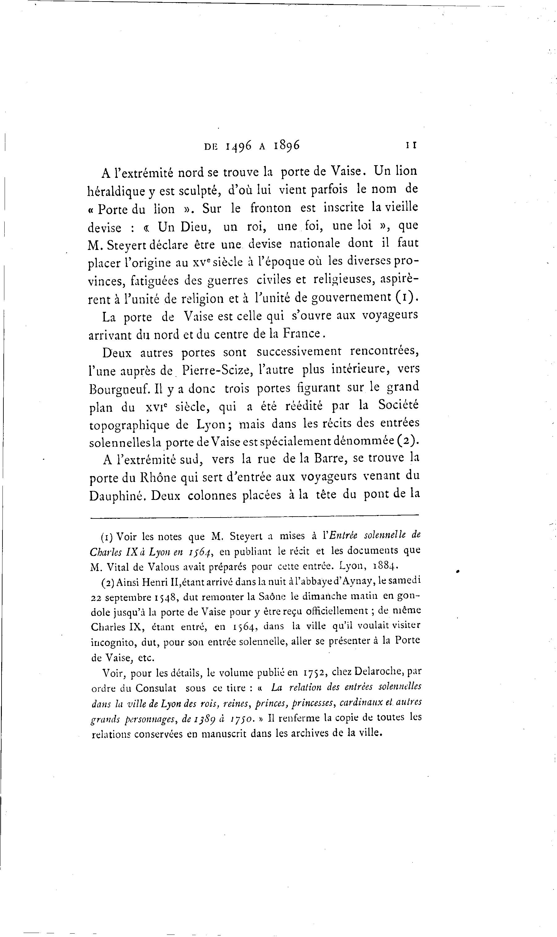DE I 4 9 6 A 1 8 9 6 II A l'extrémité nord se trouve la porte de Vaise. Un lion héraldique y est sculpté, d'où lui vient parfois le nom de « Porte du lion ». Sur le fronton est inscrite la vieille devise : 1 Un Dieu, un roi, une foi, une loi », que M. Steyert déclare être une devise nationale dont il faut placer l'origine au xve siècle à l'époque où les diverses pro- vinces, fatiguées des guerres civiles et religieuses, aspirè- rent à l'unité de religion et à l'unité de gouvernement ( 1 ) . La porte de Vaise est celle qui s'ouvre aux voyageurs arrivant du nord et du centre de la France. Deux autres portes sont successivement rencontrées, l'une auprès de. Pierre-Scize, l'autre plus intérieure, vers Bourgneuf. Il y a donc trois portes figurant sur le grand plan du xvi e siècle, qui a été réédité par la Société topographique de Lyon; mais dans les récits des entrées solennellesla porte de Vaise est spécialement dénommée (2). A l'extrémité sud, vers la rue de la Barre, se trouve la porte du Rhône qui sert d'entrée aux voyageurs venant du Dauphiné. Deux colonnes placées à la tête du pont de la (1) Voir les notes que M. Steyert a mises à VEntrée solennelle de Charles IX à Lyon en 1564, eu publiant le récit et les documents que M. Vital de Valous avait préparés pour celte entrée. Lyon, 1884. (2) Ainsi Henri Il.étant arrivé dans la nuit à l'abbayed'Aynay, lesamedi 22 septembre 1548, dut remonter la Saône le dimanche matin en gon- dole jusqu'à la porte de Vaise pour y être reçu officiellement ; de même Charles IX, étant entré, en 1564, dans la ville qu'il voulait visiter incognito, dut, pour son entrée solennelle, aller se présenter à la Porte de Vaise, etc. Voir, pour les détails, le volume publié en 1752, chez Delaroche, par ordre du Consulat sous ce titre : ci La relation des entrées solennelles dans la ville de Lyon des rois, reines, princes, princesses, cardinaux et. autres grands personnages, de ijSç) à 1J50. » Il renferme la copie de toutes les relations conservées en manuscrit dans les archives de la ville.