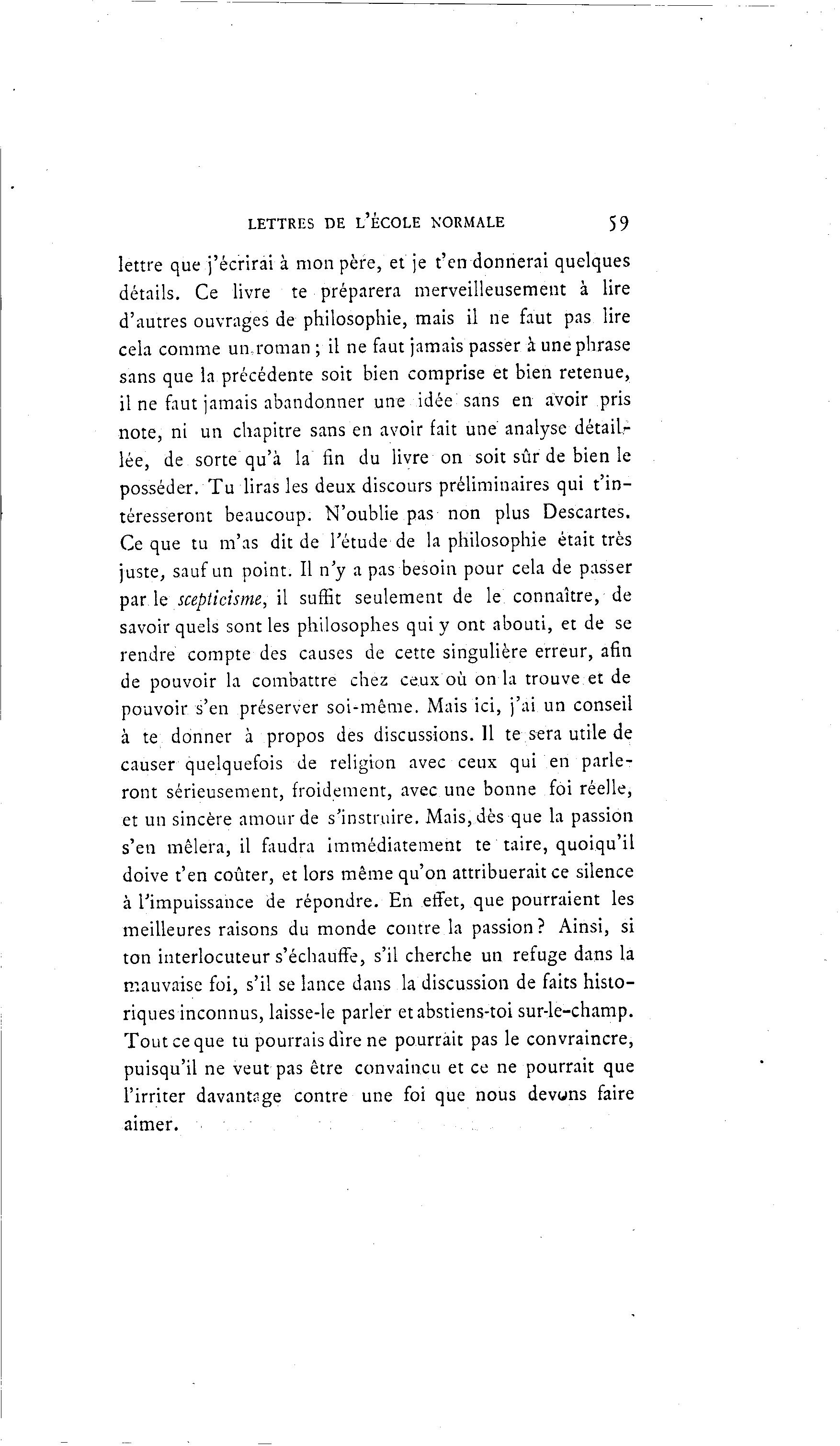 LETTRES DE L'ÉCOLE NORMALE 59 lettre que j'écrirai à mon père, et je t'en donnerai quelques détails. Ce livre te préparera merveilleusement à lire d'autres ouvrages de philosophie, mais il ne faut pas lire cela comme un,roman ; il ne faut jamais passer à une phrase sans que la précédente soit bien comprise et bien retenue, il ne faut jamais abandonner une idée sans en avoir pris note, ni un chapitre sans en avoir fait une analyse détail- lée, de sorte qu'à la fin du livre on soit sûr de bien le posséder. Tu liras les deux discours préliminaires qui t'in- téresseront beaucoup. N'oublie pas non plus Descartes. Ce que tu m'as dit de l'étude de la philosophie était très juste, sauf un point. Il n'y a pas besoin pour cela de passer par le scepticisme, il suffit seulement de le connaître, de savoir quels sont les philosophes qui y ont abouti, et de se rendre compte des causes de cette singulière erreur, afin de pouvoir la combattre chez ceux où on la trouve et de pouvoir s'en préserver soi-même. Mais ici, j'ai un conseil à te donner à propos des discussions. Il te sera utile de causer quelquefois de religion avec ceux qui en parle- ront sérieusement, froidement, avec une bonne foi réelle, et un sincère amour de s'instruire. Mais, dès que la passion s'en mêlera, il faudra immédiatement te taire, quoiqu'il doive t'en coûter, et lors même qu'on attribuerait ce silence à l'impuissance de répondre. En effet, que pourraient les meilleures raisons du monde contre la passion ? Ainsi, si ton interlocuteur s'échauffe, s'il cherche un refuge dans la mauvaise foi, s'il se lance dans la discussion de faits histo- riques inconnus, laisse-le parler et abstiens-toi sur-le-champ. Tout ce que tu pourrais dire ne pourrait pas le convraincre, puisqu'il ne veut pas être convaincu et ce ne pourrait que l'irriter davantage contre une foi que nous devons faire aimer.