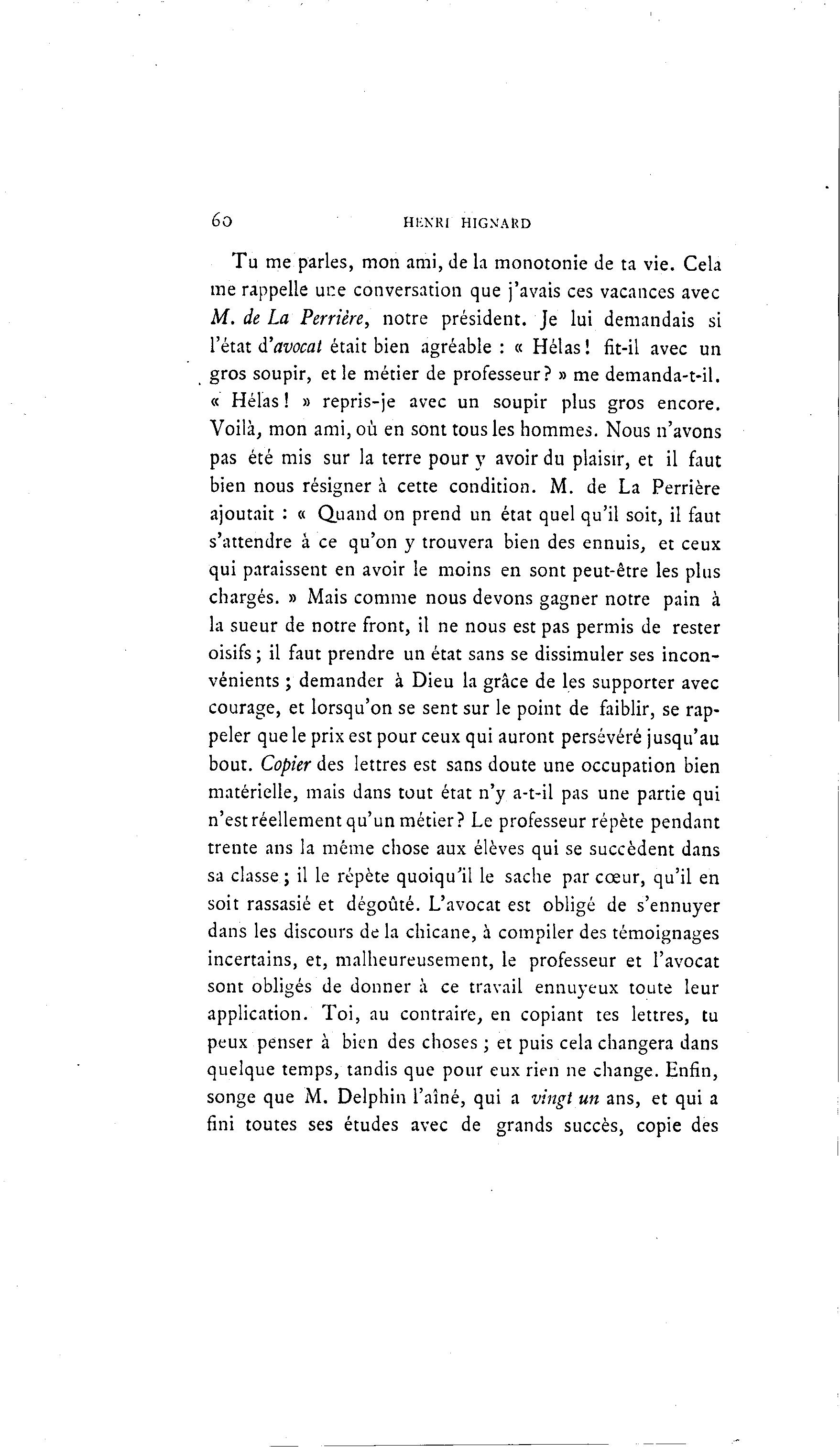 6o HENRI HIGXARD Tu me parles, mon ami, de la monotonie de ta vie. Cela me rappelle une conversation que j'avais ces vacances avec M. de La Perrière, notre président. Je lui demandais si l'état d'avocat était bien agréable : « Hélas ! fit-il avec un gros soupir, et le métier de professeur? » me demanda-t-il. « Hélas ! » repris-je avec un soupir plus gros encore. Voilà , mon ami, où en sont tous les hommes. Nous n'avons pas été mis sur la terre pour y avoir du plaisir, et il faut bien nous résigner à cette condition. M. de La Perrière ajoutait : « Quand on prend un état quel qu'il soit, il faut s'attendre à ce qu'on y trouvera bien des ennuis, et ceux qui paraissent en avoir le moins en sont peut-être les plus chargés. » Mais comme nous devons gagner notre pain à la sueur de notre front, il ne nous est pas permis de rester oisifs ; il faut prendre un état sans se dissimuler ses incon- vénients ; demander à Dieu la grâce de les supporter avec courage, et lorsqu'on se sent sur le point de faiblir, se rap- peler que le prix est pour ceux qui auront persévéré jusqu'au bout. Copier des lettres est sans doute une occupation bien matérielle, mais dans tout état n'y a-t-il pas une partie qui n'est réellement qu'un métier? Le professeur répète pendant trente ans la même chose aux élèves qui se succèdent dans sa classe ; il le répète quoiqu'il le sache par cœur, qu'il en soit rassasié et dégoûté. L'avocat est obligé de s'ennuyer dans les discours de la chicane, à compiler des témoignages incertains, et, malheureusement, le professeur et l'avocat sont obligés de donner à ce travail ennuyeux toute leur application. Toi, au contraire, en copiant tes lettres, tu peux penser à bien des choses ; et puis cela changera dans quelque temps, tandis que pour eux rien ne change. Enfin, songe que M. Delphin l'aîné, qui a vingt un ans, et qui a fini toutes ses études avec de grands succès, copie des