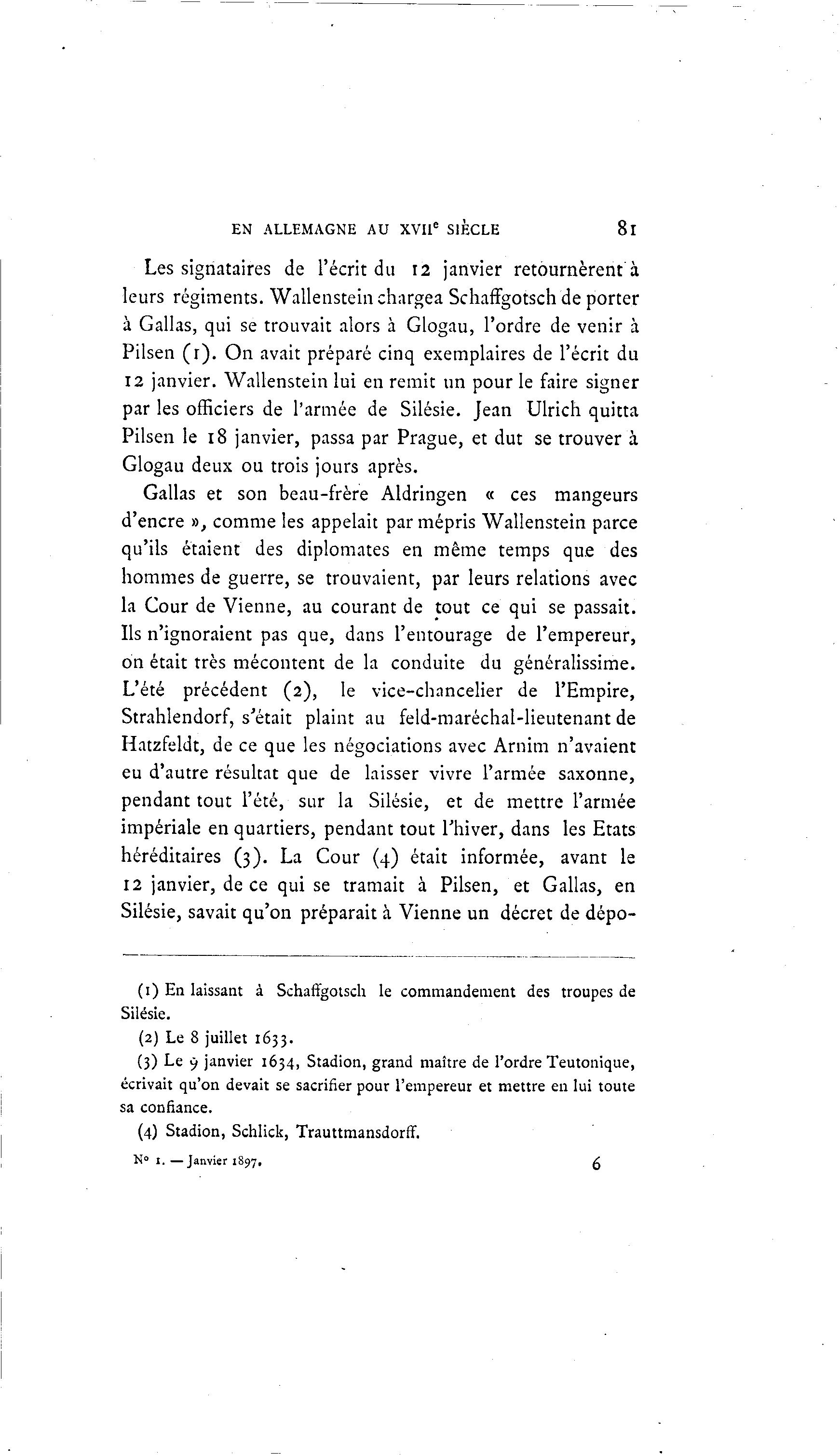 EN ALLEMAGNE AU XVIIe SIECLE 81 Les signataires de l'écrit du 12 janvier retournèrent à leurs régiments. Walleiistein chargea Schaffgotsch de porter à Gallas, qui se trouvait alors à Glogau, l'ordre de venir à Pilsen ( r ) . On avait préparé cinq exemplaires de l'écrit du 12 janvier. Wallenstein lui en remit un pour le faire signer par les officiers de l'armée de Silésie. Jean Ulrich quitta Pilsen le 18 janvier, passa par Prague, et dut se trouver à Glogau deux ou trois jours après. Gallas et son beau-frère Aldringen « ces mangeurs d'encre », comme les appelait par mépris Wallenstein parce qu'ils étaient des diplomates en même temps que des hommes de guerre, se trouvaient, par leurs relations avec la Cour de Vienne, au courant de tout ce qui se passait. Ils n'ignoraient pas que, dans l'entourage de l'empereur, on était très mécontent de la conduite du généralissime. L'été précédent (2), le vice-chancelier de l'Empire, Strahlendorf, s'était plaint au feld-maréchal-lieutenant de Hatzfeldt, de ce que les négociations avec Arnim n'avaient eu d'autre résultat que de laisser vivre l'armée saxonne, pendant tout l'été, sur la Silésie, et de mettre l'armée impériale en quartiers, pendant tout l'hiver, dans les Etats héréditaires (3). La Cour (4) était informée, avant le 12 janvier, de ce qui se tramait à Pilsen, et Gallas, en Silésie, savait qu'on préparait à Vienne un décret de dépo- (1) En laissant à Schaffgotsch le commandement des troupes de Silésie. (2) Le 8 juillet 1633. (3) Le 9 janvier 1634, Stadion, grand maître de l'ordre Teutonique, écrivait qu'on devait se sacrifier pour l'empereur et mettre en lui toute sa confiance. (4) Stadion, Schlick, Trauttmansdorff. N° 1. —Janvier 1897. £