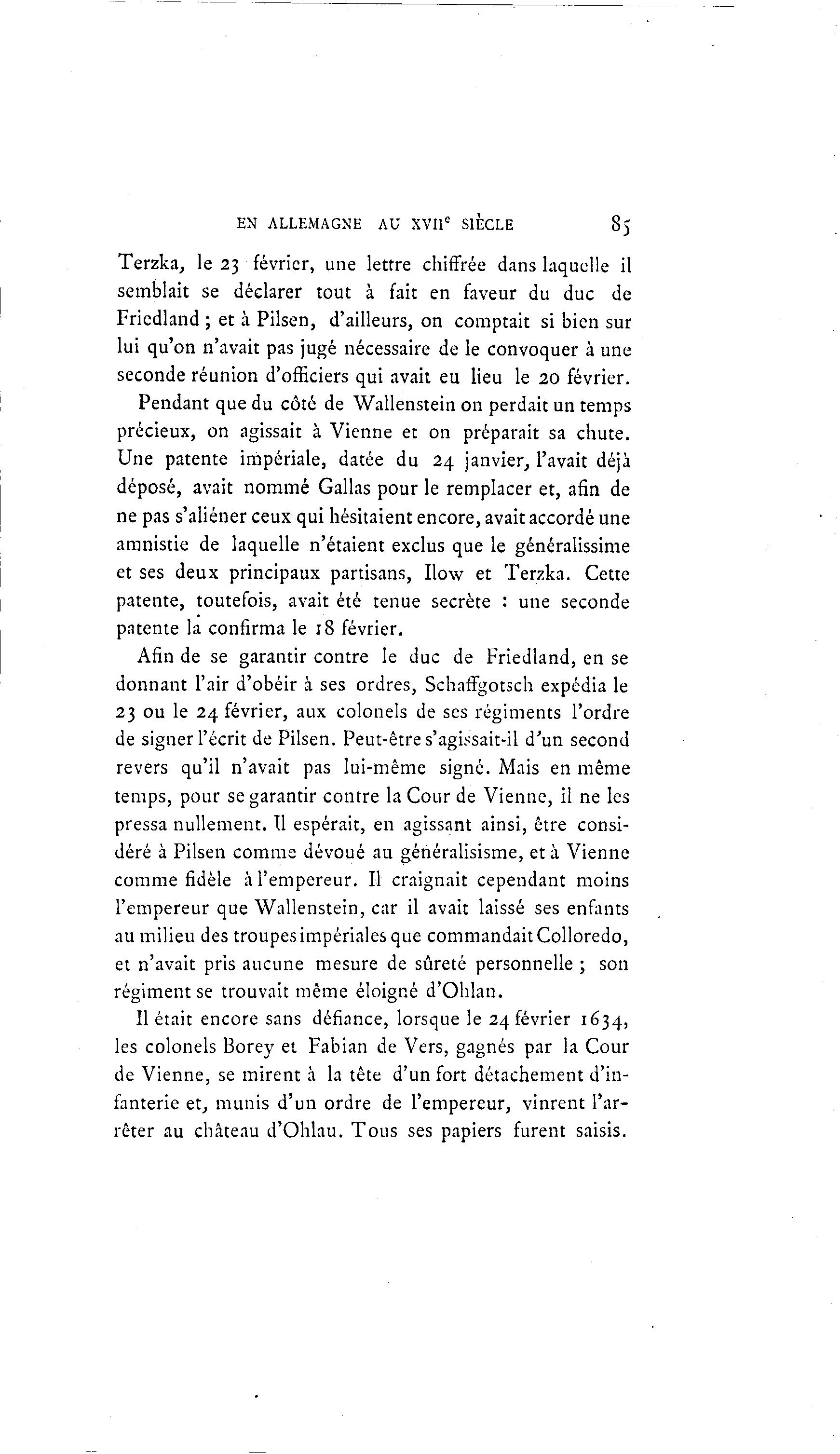 EN ALLEMAGNE AU XVIIe SIÈCLE 85 Terzka, le 23 février, une lettre chiffrée dans laquelle il semblait se déclarer tout à fait en faveur du duc de Friedland ; et à Pilsen, d'ailleurs, on comptait si bien sur lui qu'on n'avait pas jugé nécessaire de le convoquer à une seconde réunion d'officiers qui avait eu lieu le 20 février. Pendant que du côté de Wallenstein on perdait un temps précieux, on agissait à Vienne et on préparait sa chute. Une patente impériale, datée du 24 janvier, l'avait déjà déposé, avait nommé Gallas pour le remplacer et, afin de ne pas s'aliéner ceux qui hésitaient encore, avait accordé une amnistie de laquelle n'étaient exclus que le généralissime et ses deux principaux partisans, Ilow et Terzka. Cette patente, toutefois, avait été tenue secrète : une seconde patente la confirma le 18 février. Afin de se garantir contre le duc de Friedland, en se donnant l'air d'obéir à ses ordres, Schaffgotsch expédia le 23 ou le 24 février, aux colonels de ses régiments l'ordre de signer l'écrit de Pilsen. Peut-être s'agissait-il d'un second revers qu'il n'avait pas lui-même signé. Mais en même temps, pour se garantir contre la Cour de Vienne, il ne les pressa nullement. Il espérait, en agissant ainsi, être consi- déré à Pilsen comme dévoué au généralisisme, et à Vienne comme fidèle à l'empereur. Il craignait cependant moins l'empereur que Wallenstein, car il avait laissé ses enfants au milieu des troupes impériales que commandait Colloredo, et n'avait pris aucune mesure de sûreté personnelle ; son régiment se trouvait même éloigné d'Ohlan. Il était encore sans défiance, lorsque le 24 février 1634, les colonels Borey et Fabian de Vers, gagnés par la Cour de Vienne, se mirent à la tête d'un fort détachement d'in- fanterie et, munis d'un ordre de l'empereur, vinrent l'ar- rêter au château d'Ohlau. Tous ses papiers furent saisis.