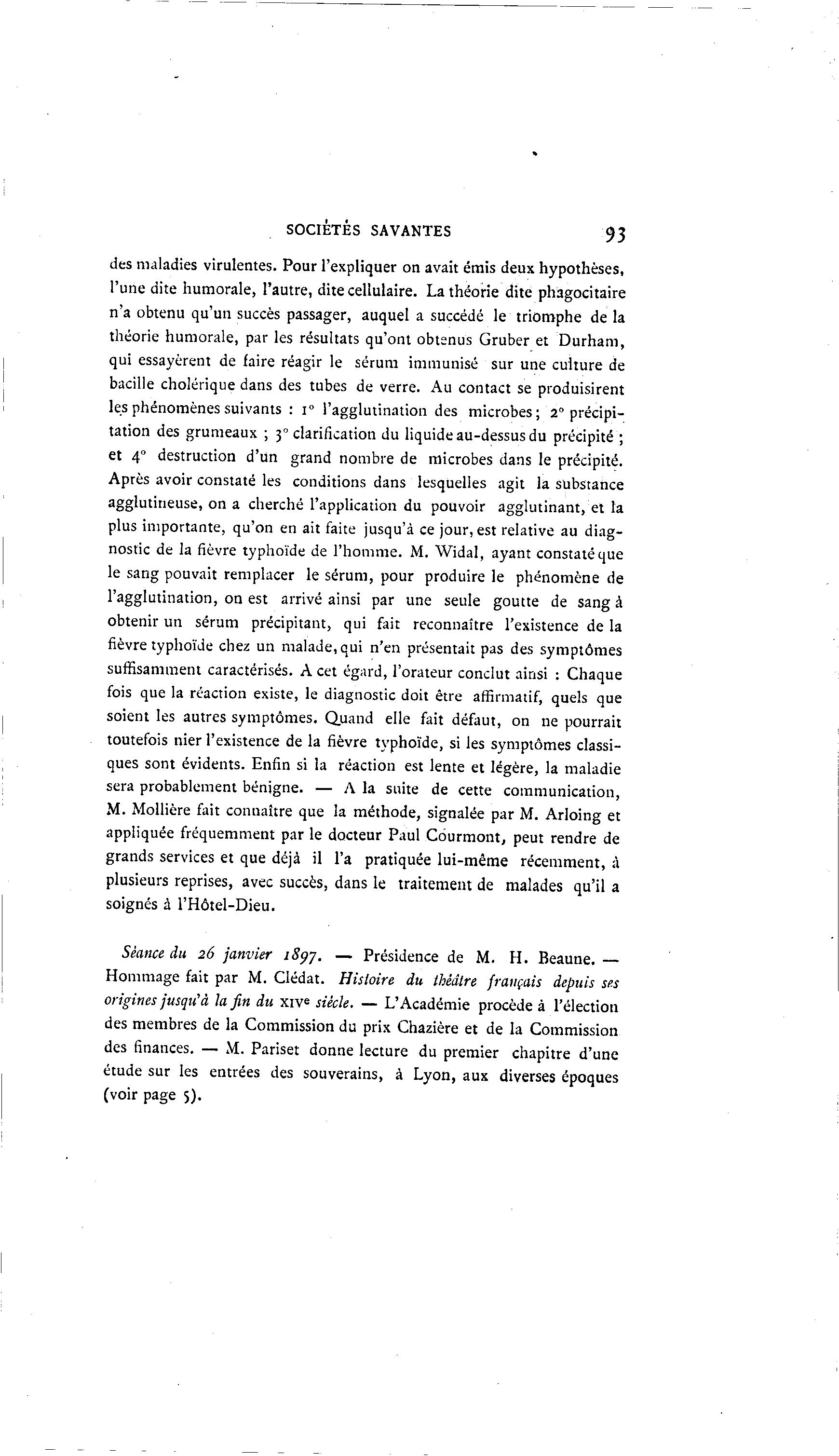 SOCIÉTÉS SAVANTES 93 des maladies virulentes. Pour l'expliquer on avait émis deux hypothèses, l'une dite humorale, l'autre, dite cellulaire. La théorie dite phâgocitaire n'a obtenu qu'un succès passager, auquel a succédé le triomphe de la théorie humorale, par les résultats qu'ont obtenus Gruber et Durham, qui essayèrent de faire réagir le sérum immunisé sur une culture de bacille cholérique dans des tubes de verre. Au contact se produisirent les phénomènes suivants : i° l'agglutination des microbes; 2° précipi- tation des grumeaux ; 30 clarification du liquide au-dessus du précipité ; et 40 destruction d'un grand nombre de microbes dans le précipité. Après avoir constaté les conditions dans lesquelles agit la substance agglutineuse, on a cherché l'application du pouvoir agglutinant, et la plus importante, qu'on en ait faite jusqu'à ce jour, est relative au diag- nostic de la fièvre typhoïde de l'homme. M. Widal, ayant constaté que le sang pouvait remplacer le sérum, pour produire le phénomène de l'agglutination, on est arrivé ainsi par une seule goutte de sang à obtenir un sérum précipitant, qui fait reconnaître l'existence de la fièvre typhoïde chez un malade, qui n'en présentait pas des symptômes suffisamment caractérisés. A cet égard, l'orateur conclut ainsi : Chaque fois que la réaction existe, le diagnostic doit être affîrmatif, quels que soient les autres symptômes. Quand elle fait défaut, on ne pourrait toutefois nier l'existence de la fièvre typhoïde, si les symptômes classi- ques sont évidents. Enfin si la réaction est lente et légère, la maladie sera probablement bénigne. — A la suite de cette communication, M. Mollière fait connaître que la méthode, signalée par M. Arloing et appliquée fréquemment par le docteur Paul Courmont, peut rendre de grands services et que déjà il l'a pratiquée lui-même récemment, à plusieurs reprises, avec succès, dans le traitement de malades qu'il a soignés à l'Hôtel-Dieu. Séance du 26 janvier 1897. — Présidence de M. H. Beaune. — Hommage fait par M. Clédat. Histoire du théâtre français depuis ses origines jusqu'à la fin du xiv« siècle. — L'Académie procède à l'élection des membres de la Commission du prix Chazière et de la Commission des finances. — M. Pariset donne lecture du premier chapitre d'une étude sur les entrées des souverains, à Lyon, aux diverses époques (voir page 5).