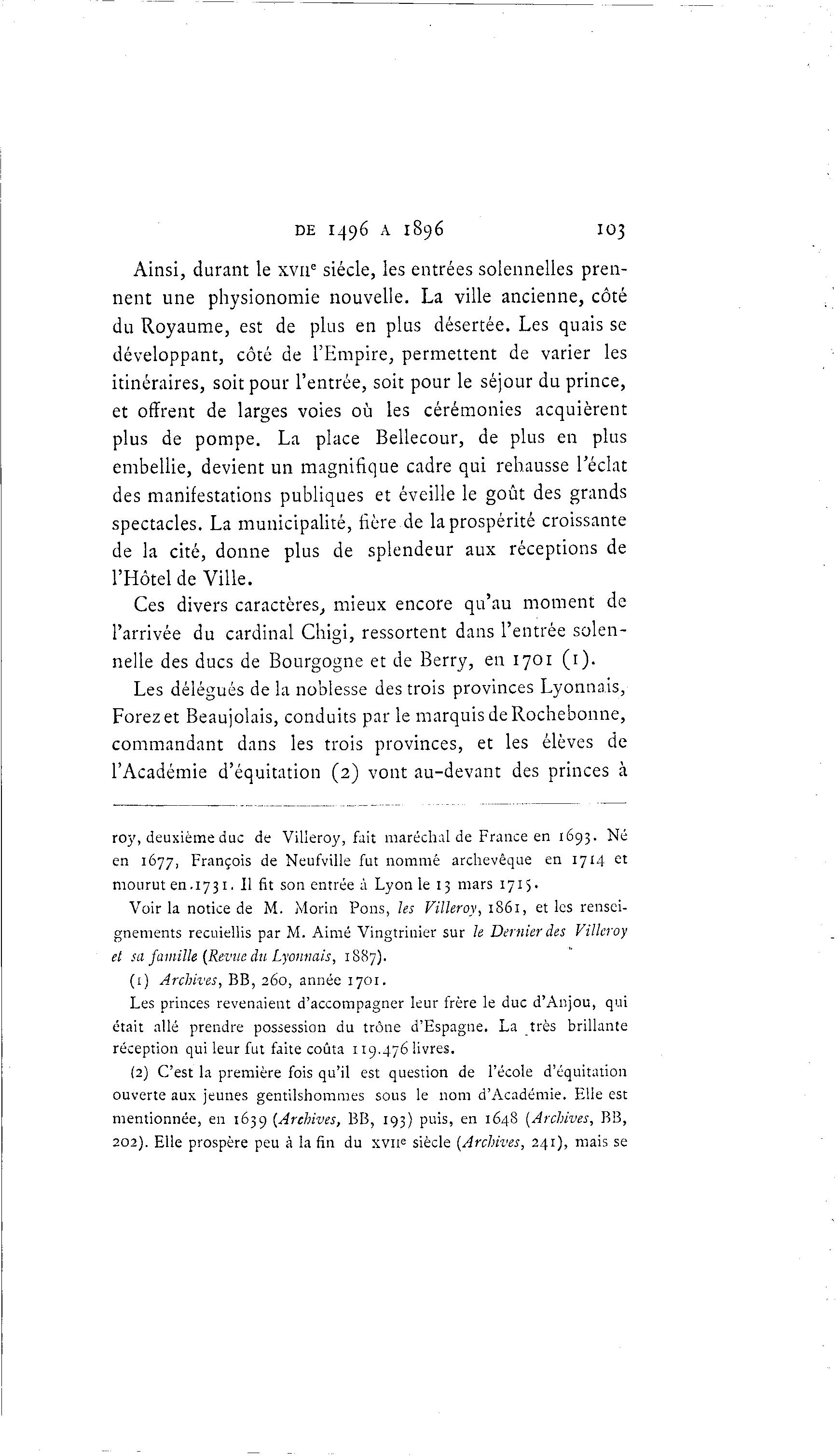 DE I496 A 1896 103 Ainsi, durant le xva e siècle, les entrées solennelles pren- nent une physionomie nouvelle. La ville ancienne, côté du Royaume, est de plus en plus désertée. Les quais se développant, côté de l'Empire, permettent de varier les itinéraires, soit pour l'entrée, soit pour le séjour du prince, et offrent de larges voies où les cérémonies acquièrent plus de pompe. La place Bellecour, de plus en plus embellie, devient un magnifique cadre qui rehausse l'éclat des manifestations publiques et éveille le goût des grands spectacles. La municipalité, fière de la prospérité croissante de la cité, donne plus de splendeur aux réceptions de l'Hôtel de Ville. Ces divers caractères, mieux encore qu'au moment de l'arrivée du cardinal Chigi, ressortent dans l'entrée solen- nelle des ducs de Bourgogne et de Berry, en 1701 (1). Les délégués de la noblesse des trois provinces Lyonnais, Forez et Beaujolais, conduits par le marquis de Rochebonne, commandant dans les trois provinces, et les élèves de l'Académie d'équitation (2) vont au-devant des princes à roy, deuxième duc de Villeroy, fait maréchal de France en 1693. Né en 1677, François de Neufville fut nommé archevêque en 17x4 et mourut en.1731. Il fit son entrée à Lyon le 13 mars 1715. Voir la notice de M. Morin Pons, les Villeroy, 1861, et les rensei- gnements recuiellis par M. Aimé Vingtrinier sur le Dernier des Villeroy et sa famille (Revue du Lyonnais, 1887). ([) Archives, BB, 260, année 1701. Les princes revenaient d'accompagner leur frère le duc d'Anjou, qui était allé prendre possession du trône d'Espagne. La très brillante réception qui leur fut faite coûta 119.476 livres. (2) C'est la première fois qu'il est question de l'école d'équitation ouverte aux jeunes gentilshommes sous le nom d'Académie. Elle est mentionnée, en 1639 (Archives, BB, 193) puis, en 1648 (Archives, BB, 202). Elle prospère peu à la fin du xvii e siècle (Archives, 241), mais se