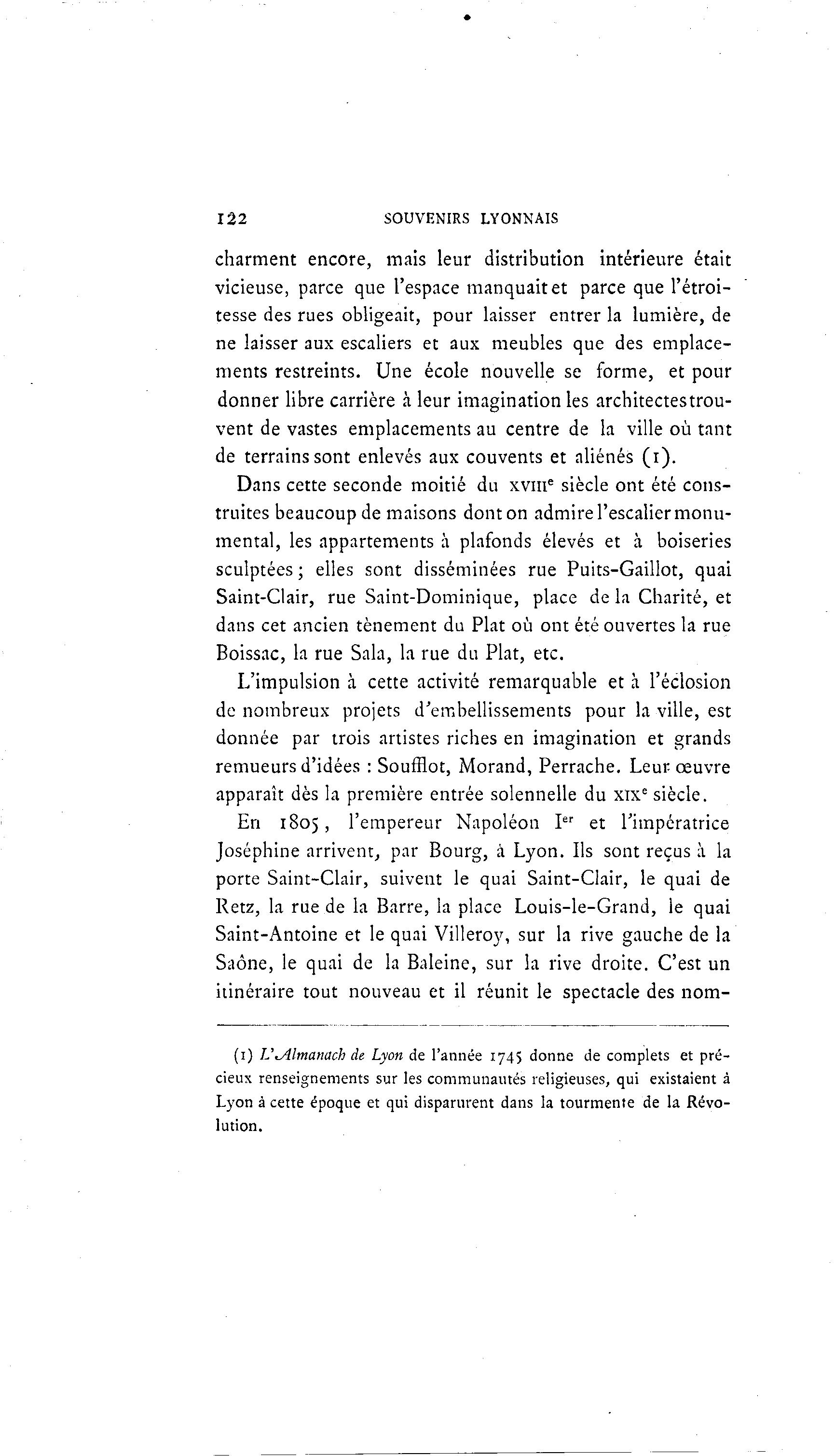 122 SOUVENIRS LYONNAIS charment encore, mais leur distribution intérieure était vicieuse, parce que l'espace manquait et parce que l'étroi- tesse des rues obligeait, pour laisser entrer la lumière, de ne laisser aux escaliers et aux meubles que des emplace- ments restreints. Une école nouvelle se forme, et pour donner libre carrière à leur imagination les architectestrou- vent de vastes emplacements au centre de la ville où tant de terrains sont enlevés aux couvents et aliénés ( i ) . Dans cette seconde moitié du xvm e siècle ont été cons- truites beaucoup de maisons dont on admire l'escalier monu- mental, les appartements à plafonds élevés et à boiseries sculptées ; elles sont disséminées rue Puits-Gaillot, quai Saint-Clair, rue Saint-Dominique, place de la Charité, et dans cet ancien tènement du Plat où ont été ouvertes la rue Boissac, la rue Sala, la rue du Plat, etc. L'impulsion à cette activité remarquable et à l'éclosion de nombreux projets d'embellissements pour la ville, est donnée par trois artistes riches en imagination et grands remueurs d'idées : Soufflot, Morand, Perrache. Leur œuvre apparaît dès la première entrée solennelle du xixe siècle. En 1805, l'empereur Napoléon Ier et l'impératrice Joséphine arrivent, par Bourg, à Lyon. Ils sont reçus à la porte Saint-Clair, suivent le quai Saint-Clair, le quai de Retz, la rue de la Barre, la place Louis-le-Grand, le quai Saint-Antoine et le quai Villeroy, sur la rive gauche de la Saône, le quai de la Baleine, sur la rive droite. C'est un itinéraire tout nouveau et il réunit le spectacle des nom- (1) UtAlmanach de Lyon de l'année 1745 donne de complets et pré- cieux renseignements sur les communautés religieuses, qui existaient à Lyon à cette époque et qui disparurent dans la tourmente de la Révo- lution.