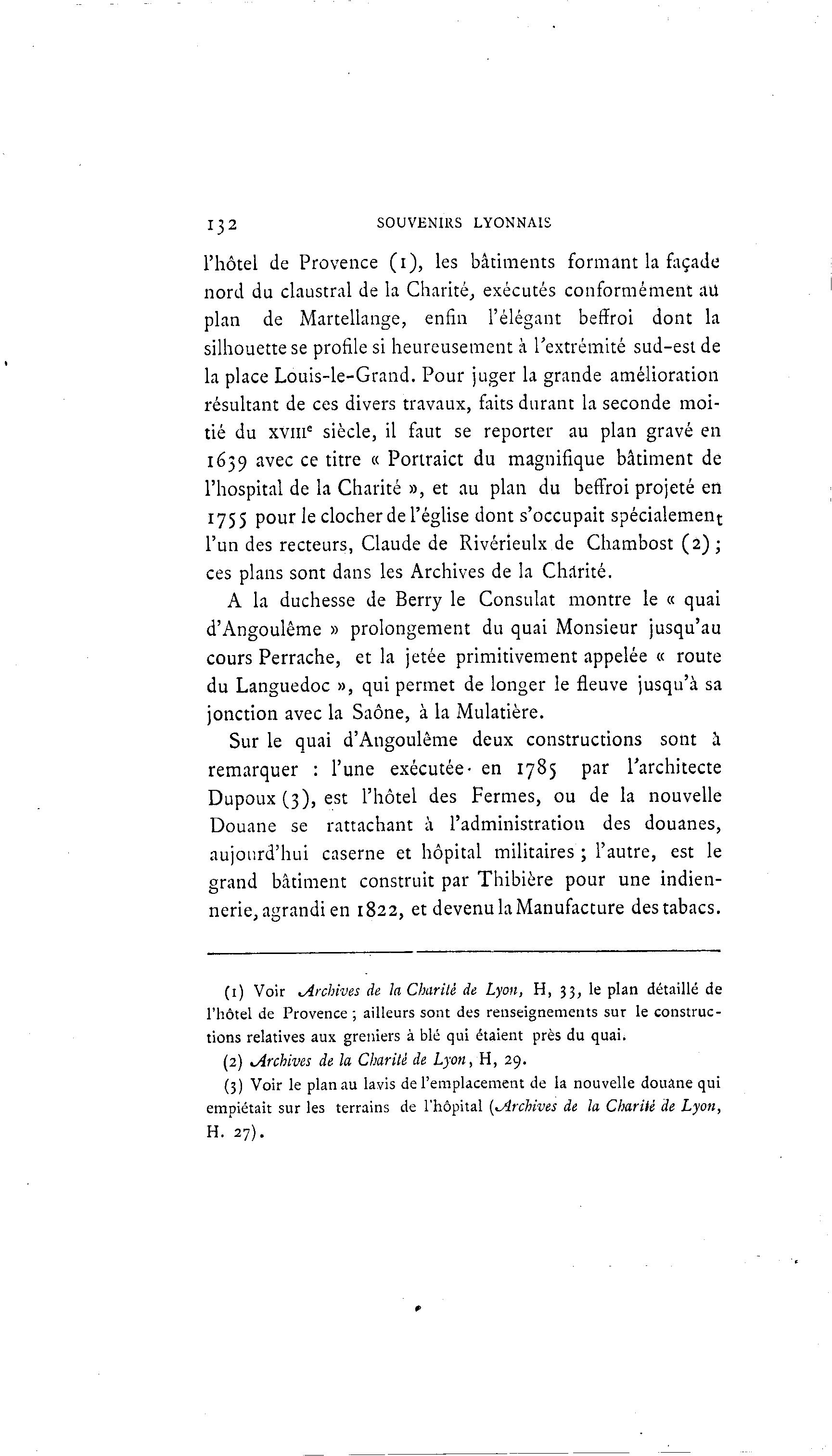 I32 SOUVENIRS LYONNAIS l'hôtel de Provence (1), les bâtiments formant la façade nord du claustral de la Charité, exécutés conformément ail plan de Martellange, enfin l'élégant beffroi dont la silhouette se profile si heureusement à l'extrémité sud-est de la place Louis-le-Grand. Pour juger la grande amélioration résultant de ces divers travaux, faits durant la seconde moi- tié du xvme siècle, il faut se reporter au plan gravé en 1659 avec ce titre « Poriraict du magnifique bâtiment de l'hospital de la Charité », et au plan du beffroi projeté en 1755 pour le clocher de l'église dont s'occupait spécialement l'un des recteurs, Claude de Rivérieulx de Chambost ( 2 ) ; ces plans sont dans les Archives de la Chrtrité. A la duchesse de Berry le Consulat montre le « quai d'Angoulême » prolongement du quai Monsieur jusqu'au cours Perrache, et la jetée primitivement appelée « route du Languedoc », qui permet de longer le fleuve jusqu'à sa jonction avec la Saône, à la Mulatière. Sur le quai d'Angoulême deux constructions sont à remarquer : l'une exécutée- en 1785 par l'architecte Dupoux (3), est l'hôtel des Fermes, ou de la nouvelle Douane se rattachant à l'administration des douanes, aujourd'hui caserne et hôpital militaires ; l'autre, est le grand bâtiment construit par Thibière pour une indien- nerie, agrandi en 1822, et devenu la Manufacture des tabacs. (1) Voir ^Archives de la Charité de Lyon, H, 33, le plan détaillé de l'hôtel de Provence ; ailleurs sont des renseignements sur le construc- tions relatives aux greniers à blé qui étaient près du quai. (2) ^Archives de la Charité de Lyon, H, 29. (3) Voir le plan au lavis de l'emplacement de la nouvelle douane qui empiétait sur les terrains de l'hôpital (^Archives de la Charité de Lyon, H. 27).