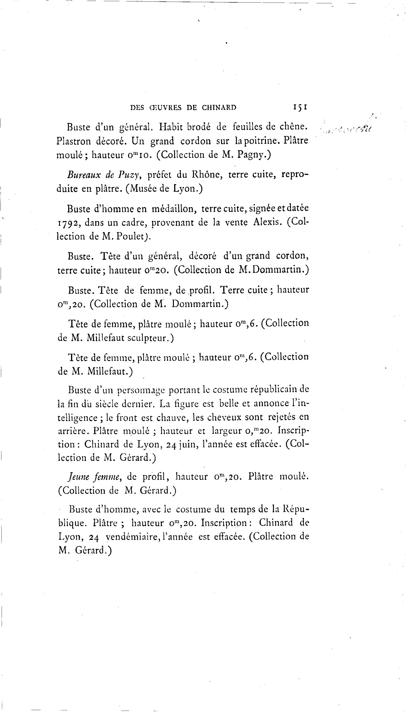DES ŒUVRES DE CHINARD 15 I Buste d'un général. Habit brodé de feuilles de chêne. Plastron décoré. Un grand cordon sur la poitrine. Plâtre moulé; hauteur o m io. (Collection de M. Pagny.) Bureaux de Puzy, préfet du Rhône, terre cuite, repro- duite en plâtre. (Musée de Lyon.) Buste d'homme en médaillon, terre cuite, signée et datée 1792, dans un cadre, provenant de la vente Alexis. (Col- lection de M. Poulet). Buste. Tête d'un général, décoré d'un grand cordon, terre cuite; hauteur o m 20. (Collection de M.Dommartin.) Buste. Tête de femme, de profil. Terre cuite ; hauteur m o j2o. (Collection de M. Dommartin.) Tête de femme, plâtre moulé; hauteur o m ,6. (Collection de M. Millefaut sculpteur.) Tête de femme, plâtre moulé ; hauteur om,6. (Collection de M. Millefaut.) Buste d'un personnage portant le costume républicain de la fin du siècle dernier. La figure est belle et annonce l'in- telligence ; le front est chauve, les cheveux sont rejetés en arrière. Plâtre moulé ; hauteur et largeur o, m 20. Inscrip- tion : Chinard de Lyon, 24 juin, l'année est effacée. (Col- lection de M. Gérard.) Jeune femme, de profil, hauteur o m ,20. Plâtre moulé. (Collection de M. Gérard.) Buste d'homme, avec le costume du temps de la Répu- blique. Plâtre; hauteur o ra ,20. Inscription: Chinard de Lyon, 24 vendémiaire, l'année est effacée. (Collection de M. Gérard.)