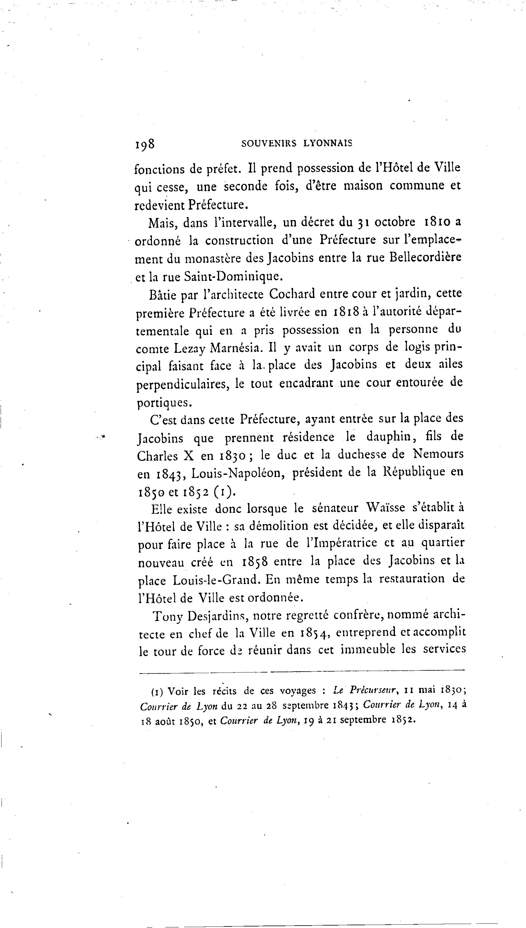 I98 SOUVENIRS LYONNAIS fonctions de préfet. Il prend possession de l'Hôtel de Ville qui cesse, une seconde fois, d'être maison commune et redevient Préfecture. Mais, dans l'intervalle, un décret du 31 octobre 1810 a ordonné la construction d'une Préfecture sur l'emplace^ ment du monastère des Jacobins entre la rue Bellecordière et la rue Saint-Dominique. Bâtie par l'architecte Cochard entre cour et jardin, cette première Préfecture a été livrée en 1818 à l'autorité dépar- tementale qui en a pris possession en la personne du comte Lezay Marnésia. Il y avait un corps de logis prin- cipal faisant face à la. place des Jacobins et deux ailes perpendiculaires, le tout encadrant une cour entourée de portiques. C'est dans cette Préfecture, ayant entrée sur la place des Jacobins que prennent résidence le dauphin, fils de Charles X en 1830; le duc et la duchesse de Nemours en 1843, Louis-Napoléon, président de la République en 1850 et 1852 (1). Elle existe donc lorsque le sénateur Waïsse s'établit à l'Hôtel de Ville : sa démolition est décidée, et elle disparaît pour faire place à la rue de l'Impératrice et au quartier nouveau créé en 1858 entre la place des Jacobins et la place Louis-le-Grand. En même temps la restauration de l'Hôtel de Ville est ordonnée. Tony Desjardins, notre regretté confrère, nommé archi- tecte en chef de la Ville en 1854, entreprend et accomplit le tour de force dî réunir dans cet immeuble les services (1) Voir les récits de ces voyages : Le Précurseur, 11 mai 1830; Courrier de Lyon du 22 au 28 saptembre 1843; Courrier de Lyon, 14 à 18 août 1850, et Courrier de Lyon, 19 à 21 septembre 1852.