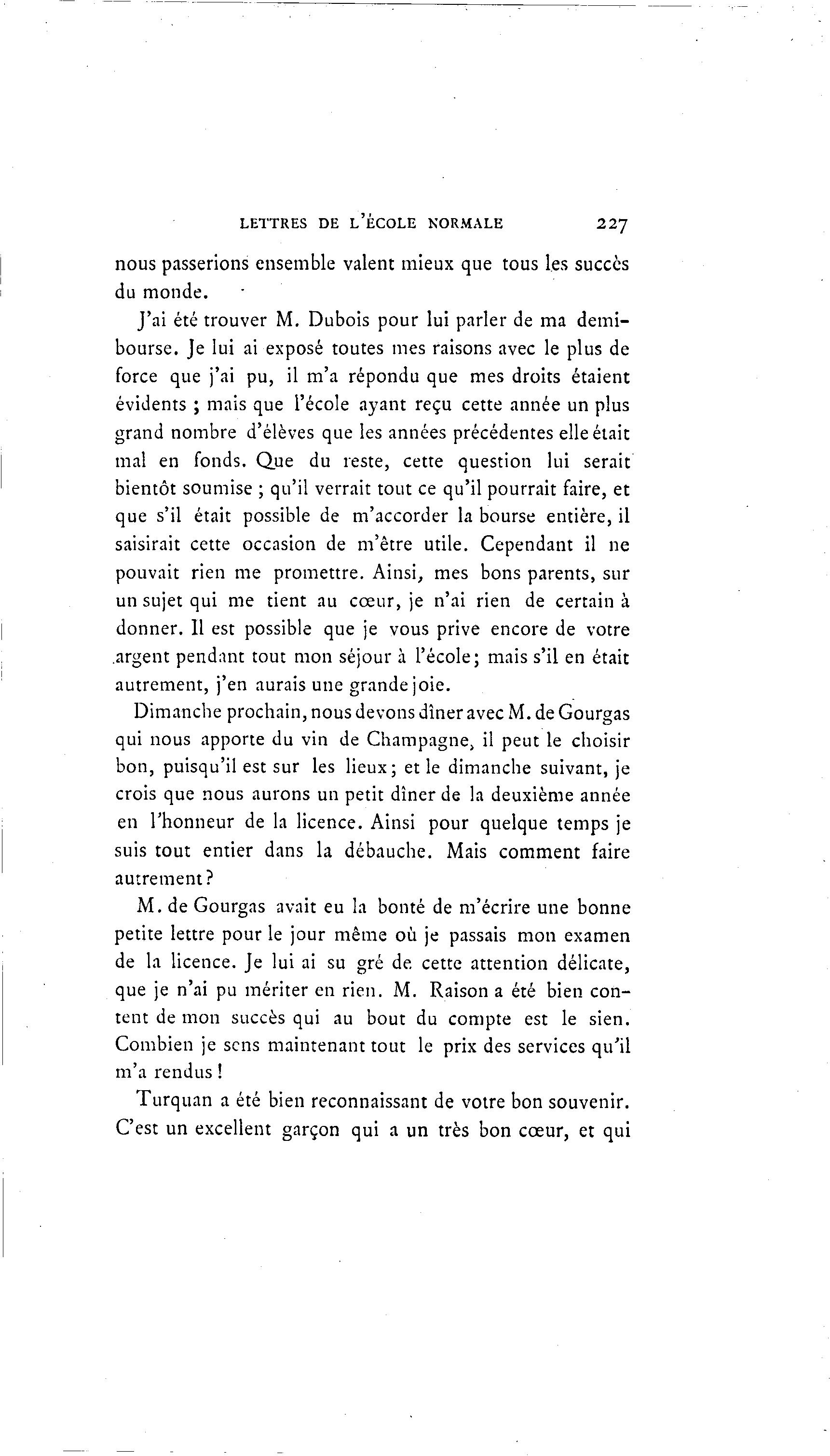 LETTRES DE L'ÉCOLE NORMALE 227 nous passerions ensemble valent mieux que tous les succès du monde. J'ai été trouver M. Dubois pour lui parler de ma demi- bourse. Je lui ai exposé toutes mes raisons avec le plus de force que j'ai pu, il m'a répondu que mes droits étaient évidents ; mais que l'école ayant reçu cette année un plus grand nombre d'élèves que les années précédentes elle était mal en fonds. Que du reste, cette question lui serait bientôt soumise ; qu'il verrait tout ce qu'il pourrait faire, et que s'il était possible de m'accorder la bourse entière, il saisirait cette occasion de m'être utile. Cependant il ne pouvait rien me promettre. Ainsi, mes bons parents, sur un sujet qui me tient au cœur, je n'ai rien de certain à donner. 11 est possible que je vous prive encore de votre argent pendant tout mon séjour à l'école; mais s'il en était autrement, j'en aurais une grande joie. Dimanche prochain, nous devons dîner avec M. de Gourgas qui nous apporte du vin de Champagne, il peut le choisir bon, puisqu'il est sur les lieux; et le dimanche suivant, je crois que nous aurons un petit dîner de la deuxième année en l'honneur de la licence. Ainsi pour quelque temps je suis tout entier dans la débauche. Mais comment faire autrement? M. de Gourgas avait eu la bonté de m'écrire une bonne petite lettre pour le jour même où je passais mon examen de la licence. Je lui ai su gré de. cette attention délicate, que je n'ai pu mériter en rien. M. Raison a été bien con- tent de mon succès qui au bout du compte est le sien. Combien je sens maintenant tout le prix des services qu'il m'a rendus ! Turquan a été bien reconnaissant de votre bon souvenir. C'est un excellent garçon qui a un très bon cœur, et qui