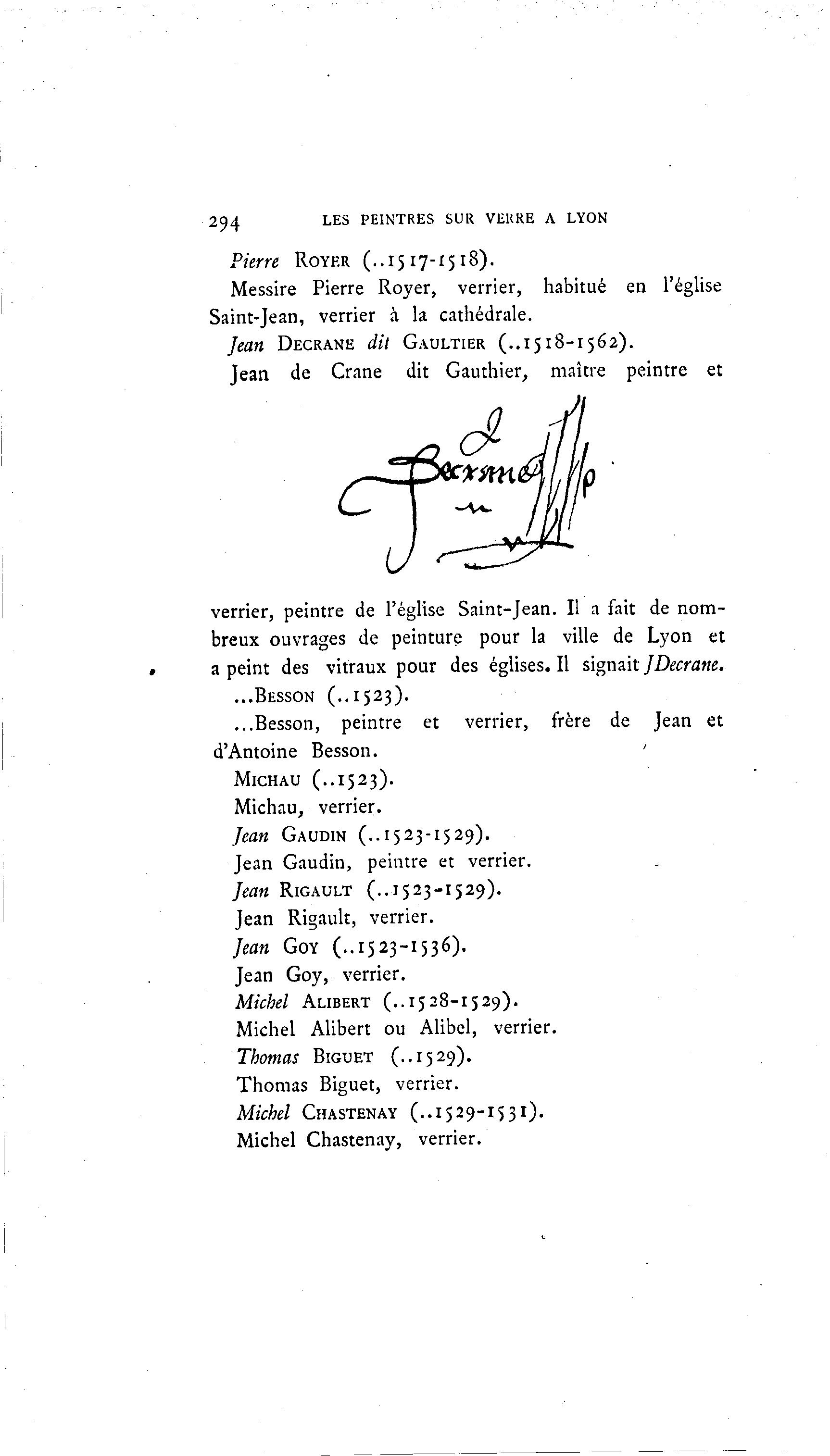 LES 294 PEINTRES SUR VERRE A LYON Pierre ROYER (..1317-1518). Messire Pierre Royer, verrier, habitué en l'église Saint-Jean, verrier à la cathédrale. Jean DECRANE dit GAULTIER (..1518-1562). Jean de Crâne dit Gauthier, maître peintre et verrier, peintre de l'église Saint-Jean. Il a fait de nom- breux ouvrages de peinture pour la ville de Lyon et a peint des vitraux pour des églises. Il signait JDecrane. ...BESSON (..1523). ...Besson, peintre et verrier, frère de Jean et d'Antoine Besson. MICHAU (..1523). Michau, verrier. Jean GAUDIN (..1523-1529). Jean Gaudin, peintre et verrier. Jean RIGAULT (..1523-1529). Jean Rigault, verrier. Jean GOY (..1523-1536). Jean Goy, verrier. Michel ALIBERT (..1528-1529). Michel Alibert ou Alibel, verrier. Thomas BIGUET (..1529). Thomas Biguet, verrier. Michel CHASTENAY (..1529-1531). Michel Chastenay, verrier.