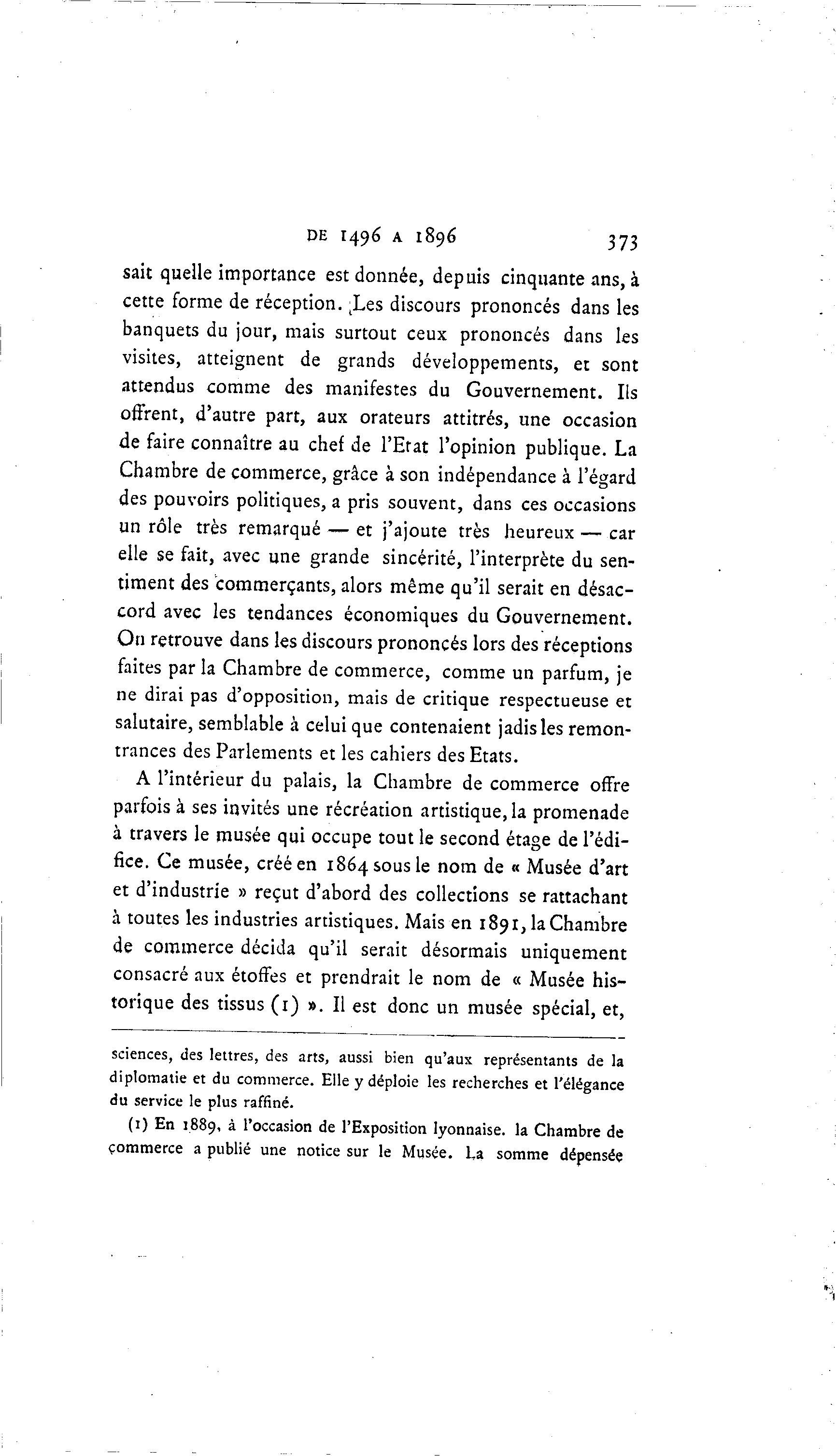 DE I496 A 189e 373 sait quelle importance est donnée, depuis cinquante ans, à cette forme de réception. ,Les discours prononcés dans les banquets du jour, mais surtout ceux prononcés dans les visites, atteignent de grands développements, et sont attendus comme des manifestes du Gouvernement. Ils offrent, d'autre part, aux orateurs attitrés, une occasion de faire connaître au chef de l'Etat l'opinion publique. La Chambre de commerce, grâce à son indépendance à l'égard des pouvoirs politiques, a pris souvent, dans ces occasions un rôle très remarqué — et j'ajoute très heureux — car elle se fait, avec une grande sincérité, l'interprète du sen- timent des commerçants, alors même qu'il serait en désac- cord avec les tendances économiques du Gouvernement. On retrouve dans les discours prononcés lors des réceptions faites par la Chambre de commerce, comme un parfum, je ne dirai pas d'opposition, mais de critique respectueuse et salutaire, semblable à celui que contenaient jadis les remon- trances des Parlements et les cahiers des Etats. A l'intérieur du palais, la Chambre de commerce offre parfois à ses invités une récréation artistique, la promenade à travers le musée qui occupe tout le second étage de l'édi- fice. Ce musée, créé en 1864 sous le nom de « Musée d'art et d'industrie » reçut d'abord des collections se rattachant à toutes les industries artistiques. Mais en 1891, la Chambre de commerce décida qu'il serait désormais uniquement consacré aux étoffes et prendrait le nom de « Musée his- torique des tissus (1) ». Il est donc un musée spécial, et, sciences, des lettres, des arts, aussi bien qu'aux représentants de la diplomatie et du commerce. Elle y déploie les recherches et l'élégance du service le plus raffiné. (1) En 1889, à l'occasion de l'Exposition lyonnaise, la Chambre de commerce a publié une notice sur le Musée. La somme dépensée