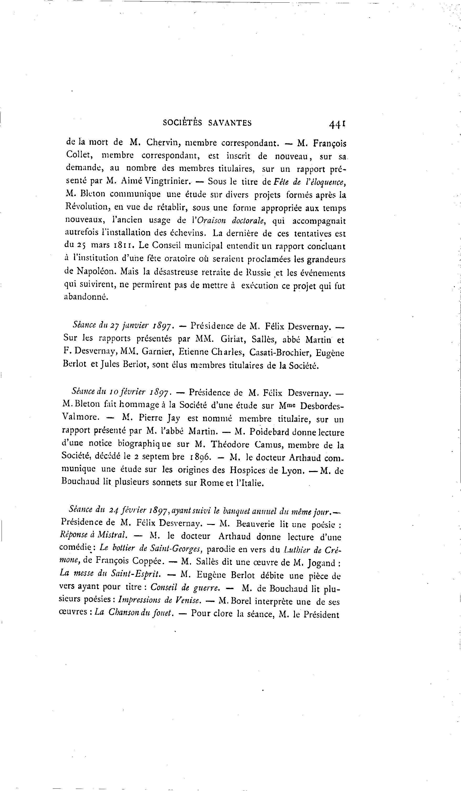 SOCIÉTÉS SAVANTES 441 de la mort de M. Chervin, membre correspondant. — M. François Collet, membre correspondant, est inscrit de nouveau, sur sa. demande, au nombre des membres titulaires, sur un rapport pré- senté par M. Aimé Vingtrinier. — Sous le titre de Fêle de l'éloquence, M. Bleton communique une étude sur divers projets formés après la Révolution, en vue de rétablir, sous une forme appropriée aux temps nouveaux, l'ancien usage de VOraison doctorale, qui accompagnait autrefois l'installation des échevins. La dernière de ces tentatives est du 25 mars 1811. Le Conseil municipal entendit un rapport concluant à l'institution d'une fête oratoire où seraient proclamées les grandeurs de Napoléon. Mais la désastreuse retraite de Russie ,et les événements qui suivirent, ne permirent pas de mettre à exécution ce projet qui fut abandonné. Séance du 27 janvier iSçy. — Présidence de M. Félix Desvernay. — Sur les rapports présentés par MM. Giriat, Salles, abbé Martin et F. Desvernay, MM. Garnier, Etienne Charles, Casati-Brochier, Eugène Berlot et Jules Berlot, sont élus membres titulaires de la Société. Séance du 10 février iSyj. — Présidence de M. Félix Desvernay. — M. Bleton fait hommage à la Société d'une étude sur Mra= Desbordes- Valmore. — M. Pierre Jay est nommé membre titulaire, sur un rapport présenté par M. l'abbé Martin. — M. Poidebard donne lecture d'une notice biographique sur M. Théodore Camus, membre de la Société, décédé le 2 septembre 1896. — M. le docteur Arthaud com- munique une étude sur les origines des Hospices de Lyon. — M . de Bouchaud lit plusieurs sonnets sur Rome et l'Italie. Séance du 24 février 1897, ayant suivi le banquet annuel du même jour.— Présidence de M. Félix Desvernay. — M. Beauverie lit une poésie : Réponse à Mistral. — M. le docteur Arthaud donne lecture d'une comédie: Le bottier de Saint-Georges, parodie en vers du Luthier de Cré- mone, de François Coppée. — M. Salles dit une œuvre de M. Jogand : La messe du Saint-Esprit. — M. Eugène Berlot débite une pièce de vers ayant pour titre : Conseil de guerre. — M. de Bouchaud lit plu- sieurs poésies : Impressions de Venise. — M. Borel interprète une de ses œuvres : La Chanson du fouet. — Pour clore la séance, M. le Président