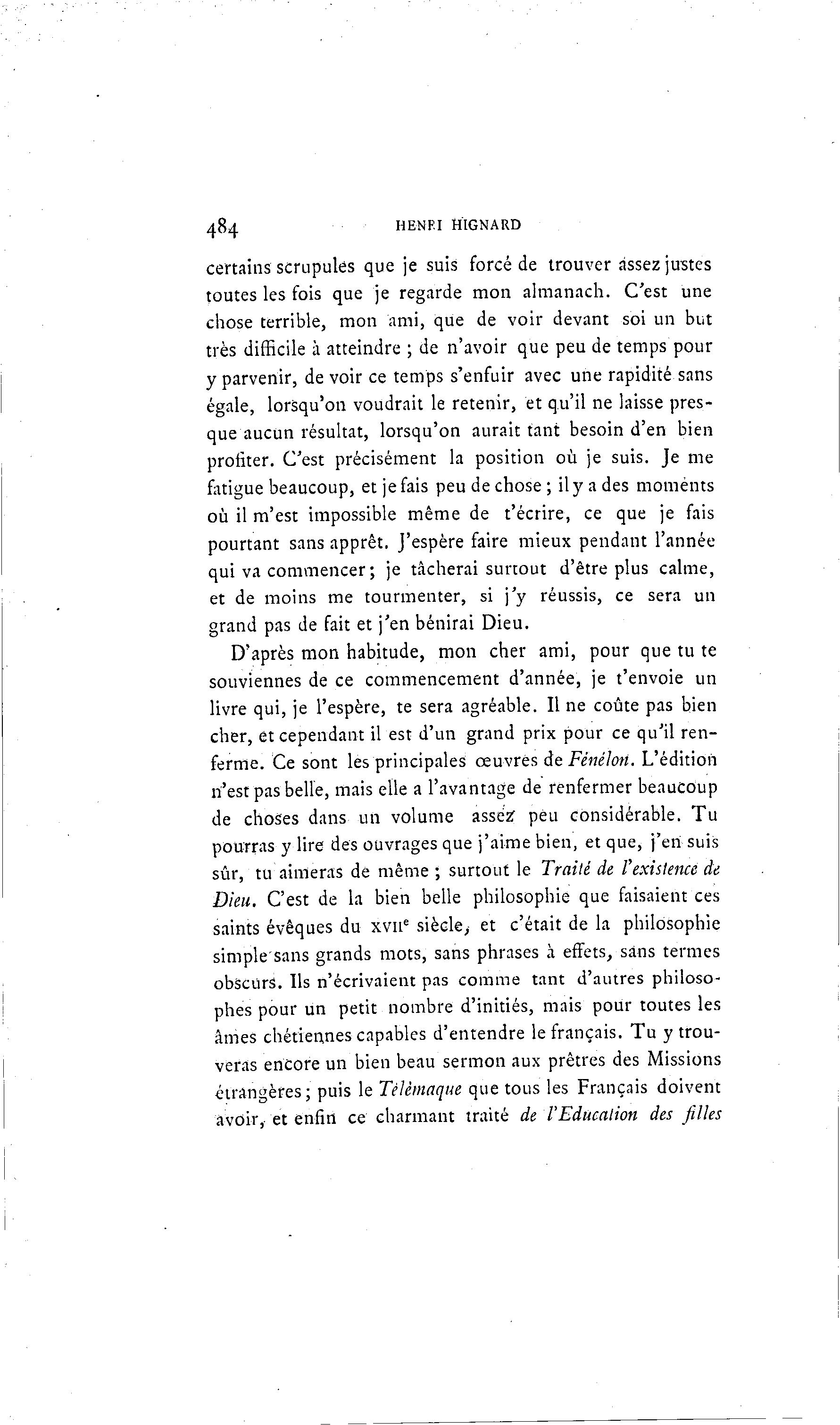 484 H EN El HIGNARD certains scrupules que je suis forcé de trouver assez justes toutes les fois que je regarde mon almanach. C'est une chose terrible, mon ami, que de voir devant soi un but très difficile à atteindre ; de n'avoir que peu de temps pour y parvenir, de voir ce temps s'enfuir avec une rapidité sans égale, lorsqu'on voudrait le retenir, et qu'il ne laisse pres- que aucun résultat, lorsqu'on aurait tant besoin d'en bien profiter. C'est précisément la position où je suis. Je me fatigue beaucoup, et je fais peu de chose ; il y a des moments où il m'est impossible même de t'écrire, ce que je fais pourtant sans apprêt. J'espère faire mieux pendant l'année qui va commencer; je tâcherai surtout d'être plus calme, et de moins me tourmenter, si j'y réussis, ce sera un grand pas de fait et j'en bénirai Dieu. D'après mon habitude, mon cher ami, pour que tu te souviennes de ce commencement d'année, je t'envoie un livre qui, je l'espère, te sera agréable. Il ne coûte pas bien cher, et cependant il est d'un grand prix pour ce qu'il ren- ferme. Ce sont les principales œuvres de Fénélon. L'édition n'est pas belle, mais elle a l'avantage de renfermer beaucoup de choses dans un volume assez' peu considérable. T u pourras y lire des ouvrages que j'aime bien, et que, j'en suis sûr, tu aimeras de même ; surtout le Traité de l'existence de Dieu. C'est de la bien belle philosophie que faisaient ces saints évêques du xvu e siècle, et c'était de la philosophie simplesans grands mots, sans phrases à effets, sans termes obscurs. Ils n'écrivaient pas comme tant d'autres philoso- phes pour un petit nombre d'initiés, mais pour toutes les âmes chétiennes capables d'entendre le français. Tu y trou- veras encore un bien beau sermon aux prêtres des Missions étrangères; puis le TèJèmaque que tous les Français doivent avoir, et enfin ce charmant traité de l'Education des filles