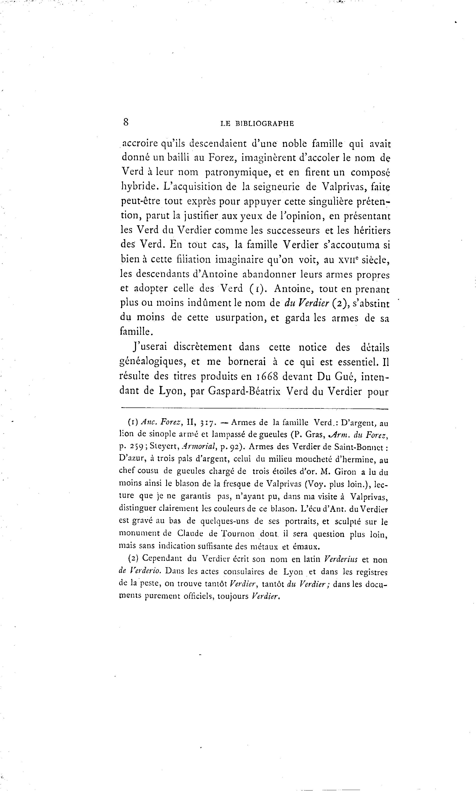8 LE BIBLIOGRAPHE accroire qu'ils descendaient d'une noble famille qui avait donné un bailli au Forez, imaginèrent d'accoler le nom de Verd à leur nom patronymique, et en firent un composé hybride. L'acquisition de la seigneurie de Valprivas, faite peut-être tout exprès pour appuyer cette singulière préten- tion, parut la justifier aux yeux de l'opinion, en présentant les Verd du Verdier comme les successeurs et les héritiers des Verd. En tout cas, la famille Verdier s'accoutuma si bien à cette filiation imaginaire qu'on voit, au xvne siècle, les descendants d'Antoine abandonner leurs armes propres et adopter celle des Verd ( i ) . Antoine, tout en prenant plus ou moins indûment le nom de du Verdier (2), s'abstint du moins de cette usurpation, et garda les armes de sa famille. J'userai discrètement dans cette notice des détails généalogiques, et me bornerai à ce qui est essentiel. Il résulte des titres produits en 1668 devant Du Gué, inten- dant de Lyon, par Gaspard-Béatrix Verd du Verdier pour (1) Ane. Forez, II, 3:7. — Armes de la famille Verd.: D'argent, au lion de sinople armé et lampassé de gueules (P. Gras, *Arm. du Forez, p. 259 ; Steyert, Armoriai, p. 92). Armes des Verdier de Saint-Bonnet : D'azur, à trois pals d'argent, celui du milieu moucheté d'hermine, au chef cousu de gueules chargé de trois étoiles d'or. M. Giron a lu du moins ainsi le blason de la fresque de Valprivas (Voy. plus loin.), lec- ture que je ne garantis pas, n'ayant pu, dans ma visite à Valprivas, distinguer clairement les couleurs de ce blason. L'écu d'Ain, du Verdier est gravé au bas de quelques-uns de ses portraits, et sculpté sur le monument de Claude de Tournon dont, il sera question plus loin, mais sans indication suffisante des métaux et émaux. (2) Cependant du Verdier écrit son nom en latin Verderius et non de Verderio. Dans les actes consulaires de Lyon et dans les registres de la peste, on trouve tantôt Verdier, tantôt du Verdier ; dans les docu- ments purement officiels, toujours Verdier.