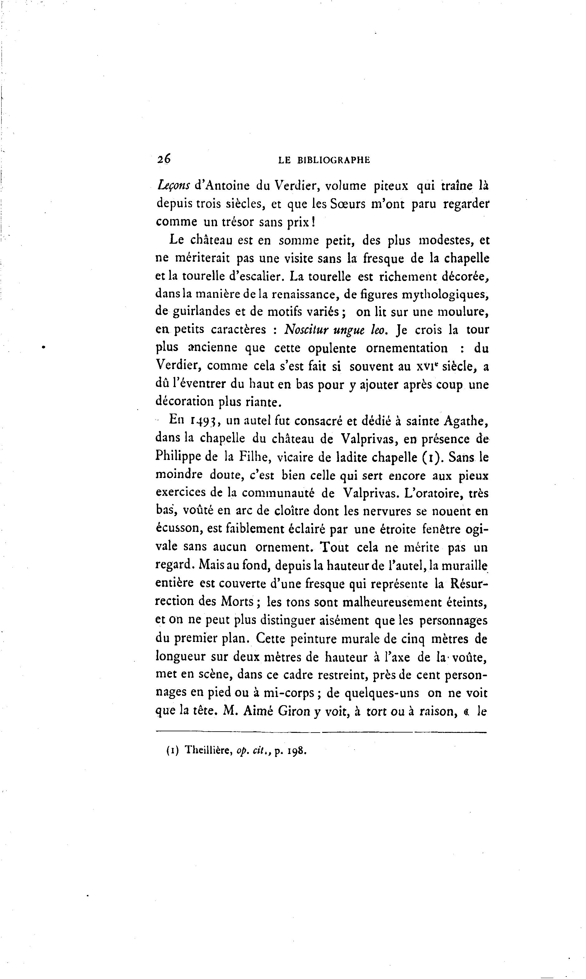 26 LE BIBLIOGRAPHE Leçons d'Antoine du Verdier, volume piteux qui traîne là depuis trois siècles, et que les Soeurs m'ont paru regarder comme un trésor sans prix ! Le château est en somme petit, des plus modestes, et ne mériterait pas une visite sans la fresque de la chapelle et la tourelle d'escalier. La tourelle est richement décorée, dans la manière de la renaissance, défigures mythologiques, de guirlandes et de motifs variés ; on lit sur une moulure, en petits caractères : Noscitur ungue leo. Je crois la tour plus ancienne que cette opulente ornementation : du Verdier, comme cela s'est fait si souvent au xvi* siècle, a dû l'éventrer du haut en bas pour y ajouter après coup une décoration plus riante. En 1493, u n a u t e ' fu£ consacré et dédié à sainte Agathe, dans la chapelle du château de Valprivas, en présence de Philippe de la Filhe, vicaire de ladite chapelle ( i ) . Sans le moindre doute, c'est bien celle qui sert encore aux pieux exercices de la communauté de Valprivas. L'oratoire, très bas, voûté en arc de cloître dont les nervures se nouent en écusson, est faiblement éclairé par une étroite fenêtre ogi- vale sans aucun ornement. Tout cela ne mérite pas un regard. Mais au fond, depuis la hauteur de l'autel, la muraille entière est couverte d'une fresque qui représente la Résur- rection des Morts ; les tons sont malheureusement éteints, et on ne peut plus distinguer aisément que les personnages du premier plan. Cette peinture murale de cinq mètres de longueur sur deux mètres de hauteur à l'axe de la ' voûte, met en scène, dans ce cadre restreint, près de cent person- nages en pied ou à mi-corps ; de quelques-uns on ne voit que la tête. M. Aimé Giron y voit, à tort ou à raison, « le (i) Theillière, op. cit., p. 198.