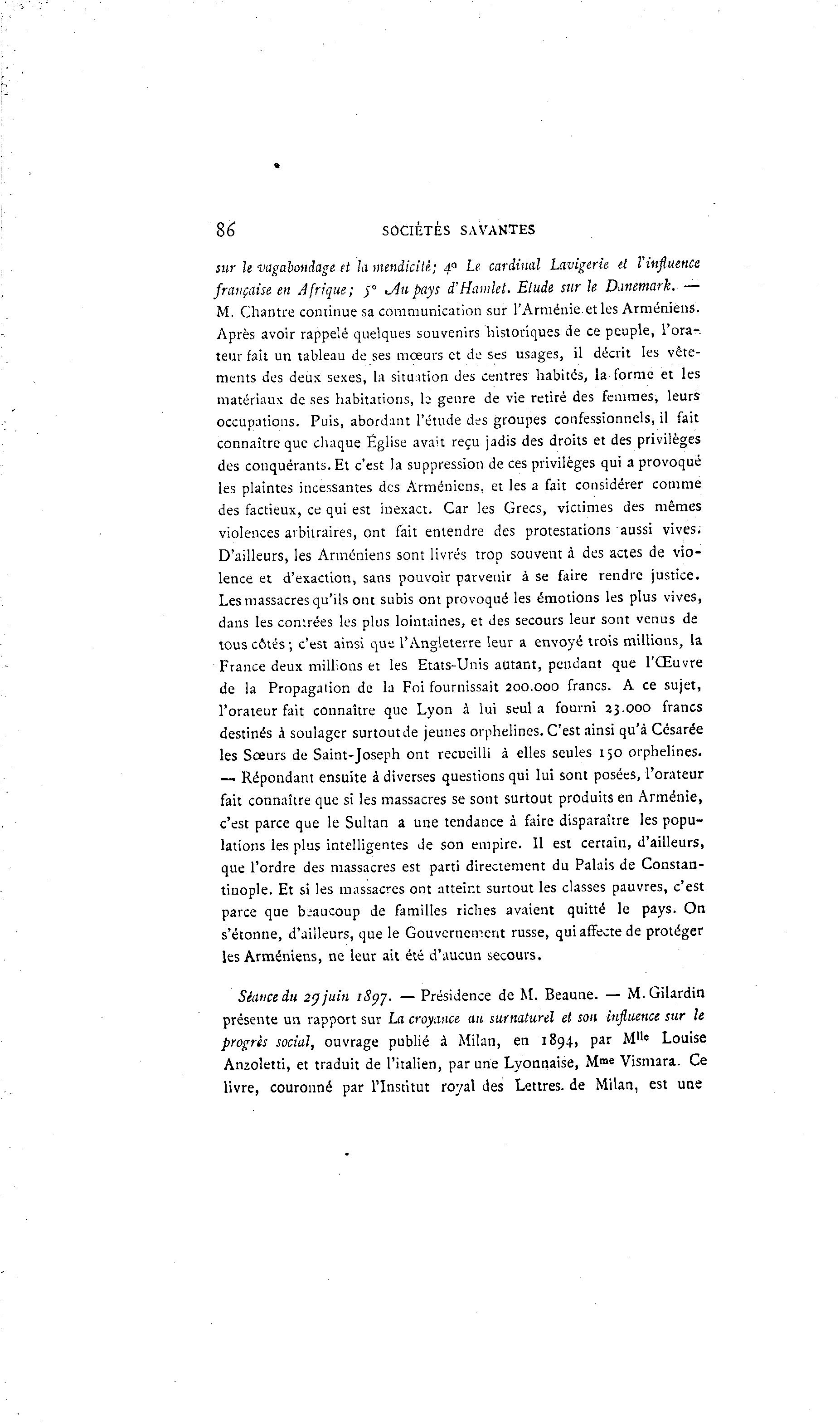 86 SOCIÉTÉS SAVAKTES sur le vagabondage et la mendicité.; 4a Le. cardinal Lavigerie et l'influence française en Afrique; $" du pays d'Hamlet. Etude sur le Danemark. — M. Chantre continue sa communication sur l'Arménie.et les Arméniens. Après avoir rappelé quelques souvenirs historiques de ce peuple, l'ora-- teur fait un tableau de ses mœurs et de ses usages, il décrit les vête- ments des deux sexes, la situation des centres habités, la forme et les matériaux de ses habitations, ls genre de vie retiré des femmes, leurs- occupations. Puis, abordant l'étude des groupes confessionnels, il fait connaître que chaque Église avait reçu jadis des droits et des privilèges des conquérants. Et c'est la suppression de ces privilèges qui a provoqué les plaintes incessantes des Arméniens, et les a fait considérer comme des factieux, ce qui est inexact. Car les Grecs, victimes des mêmes violences arbitraires, ont fait entendre des protestations aussi vives. D'ailleurs, les Arméniens sont livrés trop souvent à des actes de vio- lence et d'exaction, sans pouvoir parvenir à se faire rendre justice. Les massacres qu'ils ont subis ont provoqué les émotions les plus vives, dans les contrées les plus lointaines, et des secours leur sont venus de tous côtés; c'est ainsi que l'Angleterre leur a envoyé trois millions, la France deux millions et les Etats-Unis autant, pendant que l'Œuvre de la Propagalion de la Foi fournissait 200.000 francs. A ce sujet, l'orateur fait connaître que Lyon à lui seul a fourni 23.000 francs destinés à soulager surtout de jeunes orphelines. C'est ainsi qu'à Césarée les Sœurs de Saint-Joseph ont recueilli à elles seules 150 orphelines. — Répondant ensuite à diverses questions qui lui sont posées, l'orateur fait connaître que si les massacres se sont surtout produits en Arménie, c'est parce que le Sultan a une tendance à faire disparaître les popu- lations les plus intelligentes de son empire. Il est certain, d'ailleurs, que l'ordre des massacres est parti directement du Palais de Constan- tinople. Et si les massacres ont atteint surtout les classes pauvres, c'est parce que beaucoup de familles riches avaient quitté le pays. On s'étonne, d'ailleurs, que le Gouvernement russe, qui affecte de protéger les Arméniens, ne leur ait été d'aucun secours. Séance du 29 juin iSyy. — Présidence de M. Beaune. — M.Gilardin présente un rapport sur La croyance au surnaturel et son influence sur le progrès social, ouvrage publié à Milan, en 1894, par M llc Louise Anzoletti, et traduit de l'italien, par une Lyonnaise, M"" Vismara. Ce livre, couronné par l'Institut royal des Lettres, de Milan, est une