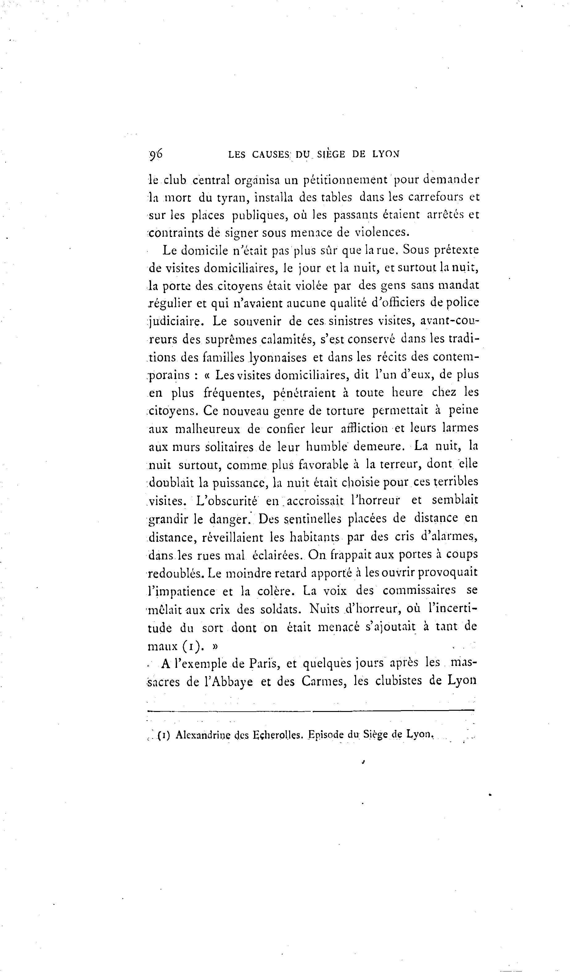 9'6 LES CAUSES DU SIÈGE DE LYOM le club central organisa un pétitionnement pour demander la mort du tyran, installa des tables dans les carrefours et sur les places publiques, où les passants étaient arrêtés et contraints de signer sous menace de violences. Le domicile n'était pas plus sûr que la rue. Sous prétexte de visites domiciliaires, le jour et la nuit, et surtout la nuit, la porte des citoyens était violée par des gens sans mandat régulier et qui n'avaient aucune qualité d'officiers de police judiciaire. Le souvenir de ces sinistres visites, avant-cou- reurs des suprêmes calamités, s'est conservé dans les tradi- tions des familles lyonnaises et dans les récits des contem- porains : « Les visites domiciliaires, dit l'un d'eux, de plus en plus fréquentes, pénétraient à toute heure chez les citoyens. Ce nouveau genre de torture permettait à peine aux malheureux de confier leur affliction et leurs larmes aux murs solitaires de leur humble demeure. La nuit, la nuit surtout, comme plus favorable à la terreur, dont elle doublait la puissance, la nuit était choisie pour ces terribles .visites. L'obscurité en .accroissait l'horreur et semblait grandir le danger. Des sentinelles placées de distance en distance, réveillaient les habitants par des cris d'alarmes, dans les rues mal éclairées. On frappait aux portes à coups redoublés. Le moindre retard apporté à les ouvrir provoquait l'impatience et la colère. La voix des commissaires se •mêlait aux crix des soldats. Nuits d'horreur, où l'incerti- tude du sort dont on était menacé s'ajoutait à tant de maux ( i ) . » . - A l'exemple de Paris, et quelques jours après les mas- sacres de l'Abbaye et des Carmes, les clubistes de Lyon ,. (i) Alexandrine des Eçherpl.les. Episode du Siège de Lyon.
