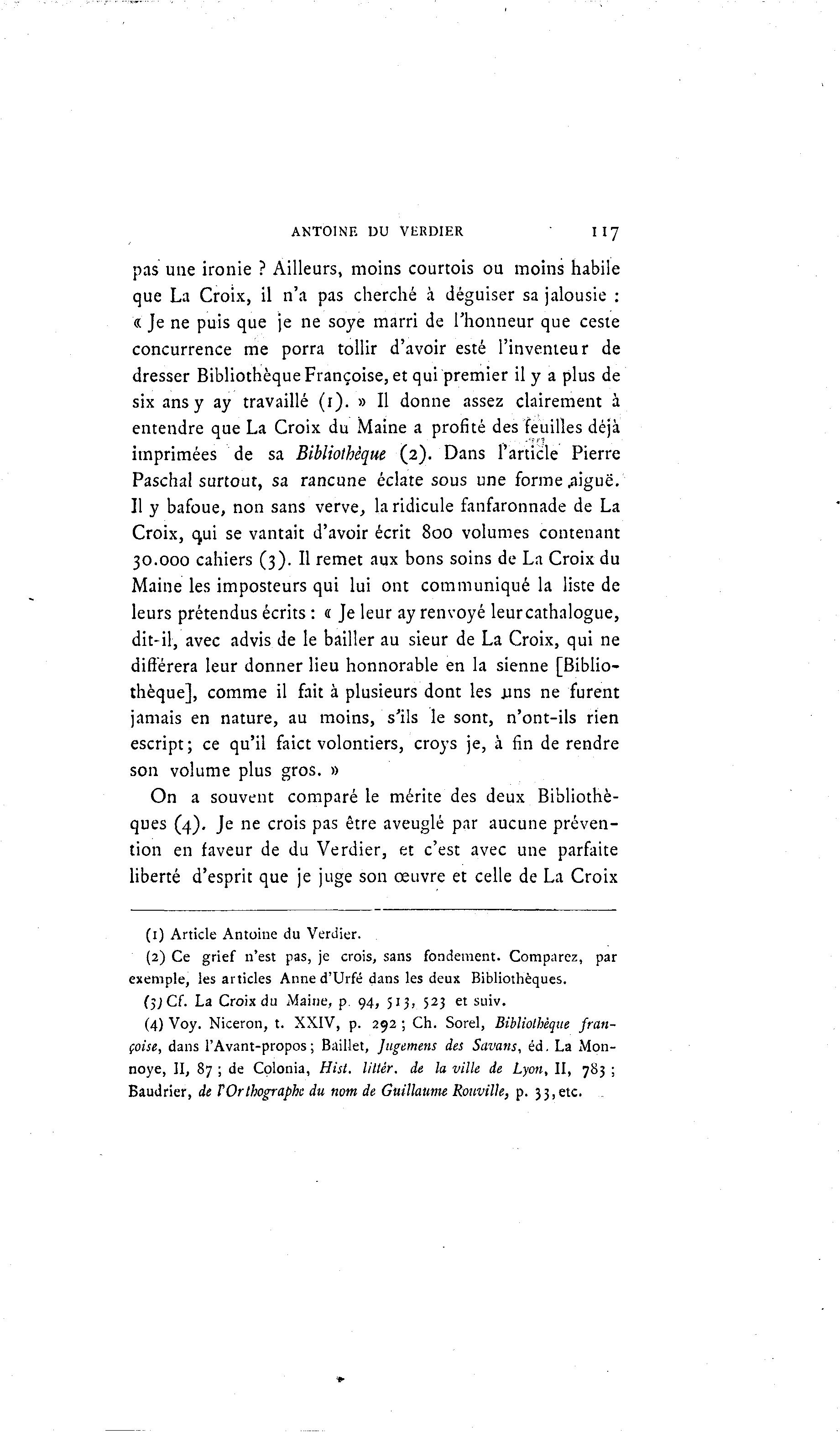 ANTOINE DU VERDIER II7 pas une ironie ? Ailleurs, moins courtois ou moins habile que La Croix, il n'a pas cherché à déguiser sa jalousie : « Je ne puis que je ne soye marri de l'honneur que ceste concurrence me porra tollir d'avoir esté l'inventeur de dresser Bibliothèque Françoise, et qui premier il y a plus de six ans y ay travaillé ( i ) . » Il donne assez clairement à entendre que La Croix du Maine a profité des feuilles déjà imprimées de sa Bibliothèque (2). Dans Particle Pierre Paschal surtout, sa rancune éclate sous une forme .aiguë. Il y bafoue, non sans verve, la ridicule fanfaronnade de La Croix, qui se vantait d'avoir écrit 800 volumes contenant 30.000 cahiers (3). Il remet aux bons soins de La Croix du Maine les imposteurs qui lui ont communiqué la liste de leurs prétendus écrits : « Je leur ay renvoyé leurcathalogue, dit-il, avec advis de le bailler au sieur de La Croix, qui ne différera leur donner lieu honnorable en la sienne [Biblio- thèque], comme il fait à plusieurs dont les uns ne furent jamais en nature, au moins, s'ils le sont, n'ont-ils rien escript; ce qu'il faict volontiers, croys je, à fin de rendre son volume plus gros. » On a souvent comparé le mérite des deux Bibliothè- ques (4). Je ne crois pas être aveuglé par aucune préven- tion en faveur de du Verdier, et c'est avec une parfaite liberté d'esprit que je juge son œuvre et celle de La Croix (1) Article Antoine du Verdier. (2) Ce grief n'est pas, je crois, sans fondement. Comparez, par exemple, les articles Anne d'Urfé dans les deux Bibliothèques. (jjCf. La Croix du iMaine, p. 94, 513, 523 et suiv. (4) Voy. Niceron, t. XXIV, p. 292 ; Ch. Sorel, Bibliothèque fran- çaise, dans l'Avant-propos ; Baillet, Jugemens des Savans, éd. La Mon- noye, II, 87 ; de Colonia, Hist. littér. de la ville de Lyon, II, 783 ; Baudrier, de ÎOrthographc du nom de Guillaume Rouville, p. 33,etc.