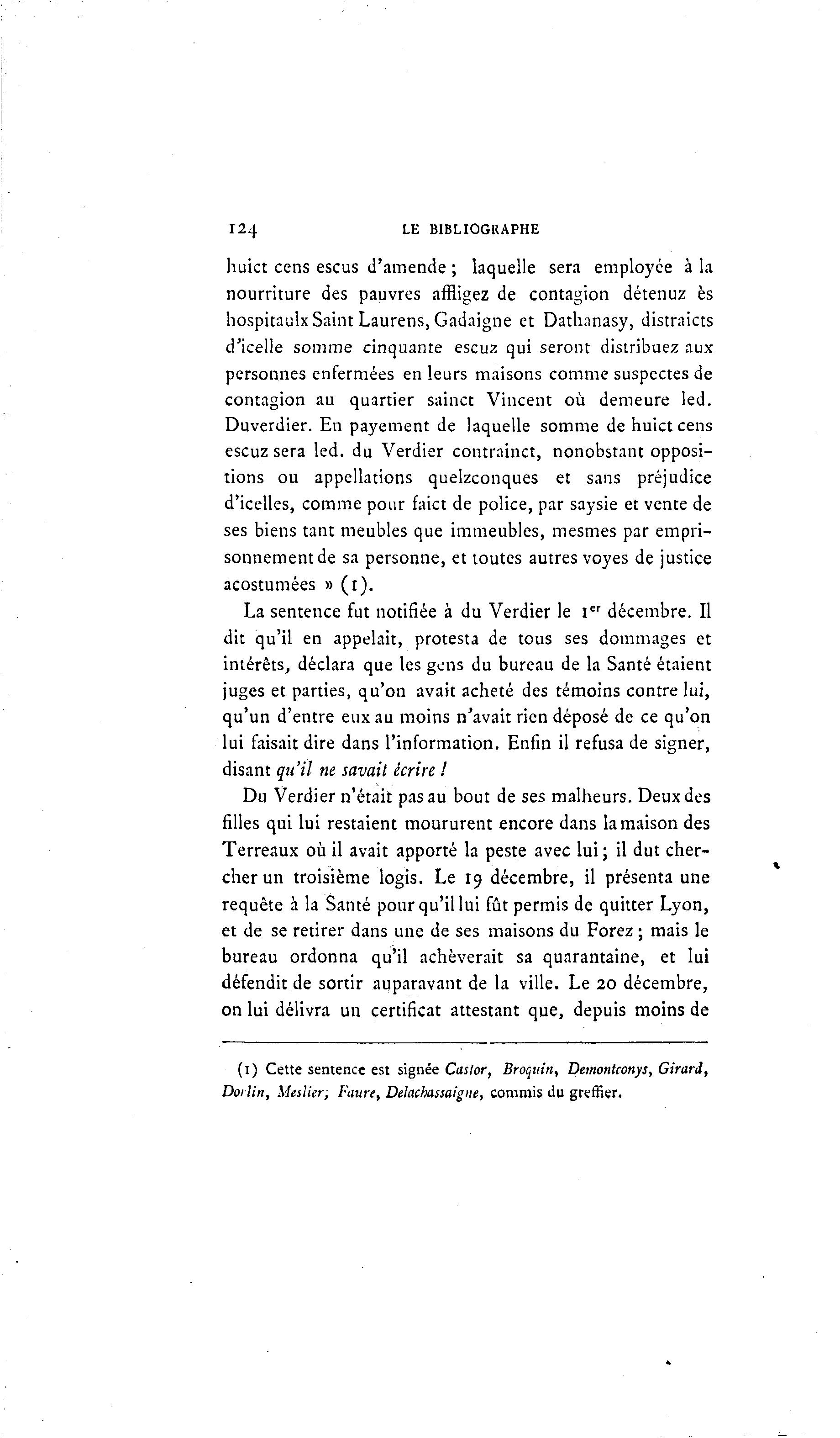 LE 124 BIBLIOGRAPHE huict cens escus d'amende ; laquelle sera employée à la nourriture des pauvres affligez de contagion détenuz es hospitaulx Saint Laurens, Gadaigne et Dathanasy, distraicts d'icelle somme cinquante escuz qui seront distribuez aux personnes enfermées en leurs maisons comme suspectes de contagion au quartier sainct Vincent où demeure led. Duverdier. En payement de laquelle somme de huict cens escuz sera led. du Verdier contrainct, nonobstant opposi- tions ou appellations quelzconques et sans préjudice d'icelles, comme pour faict de police, par saysie et vente de ses biens tant meubles que immeubles, mesmes par empri- sonnement de sa personne, et toutes autres voyes de justice acostumées » ( r ) . La sentence fut notifiée à du Verdier le i " décembre. Il dit qu'il en appelait, protesta de tous ses dommages et intérêts, déclara que les gens du bureau de la Santé étaient juges et parties, qu'on avait acheté des témoins contre lui, qu'un d'entre eux au moins n'avait rien déposé de ce qu'on lui faisait dire dans l'information. Enfin il refusa de signer, disant qu'il ne savait écrire ! Du Verdier n'était pas au bout de ses malheurs. Deux des filles qui lui restaient moururent encore dans la maison des Terreaux où il avait apporté la peste avec lui ; il dut cher- cher un troisième logis. Le 19 décembre, il présenta une requête à la Santé pour qu'il lui fût permis de quitter Lyon, et de se retirer dans une de ses maisons du Forez ; mais le bureau ordonna qu'il achèverait sa quarantaine, et lui défendit de sortir auparavant de la ville. Le 20 décembre, on lui délivra un certificat attestant que, depuis moins de (1) Cette sentence est signée Castor, Broquin, Demonkonys, Girard, Doilin, Meslier, Faure, Delachassaigue, commis du greffier.