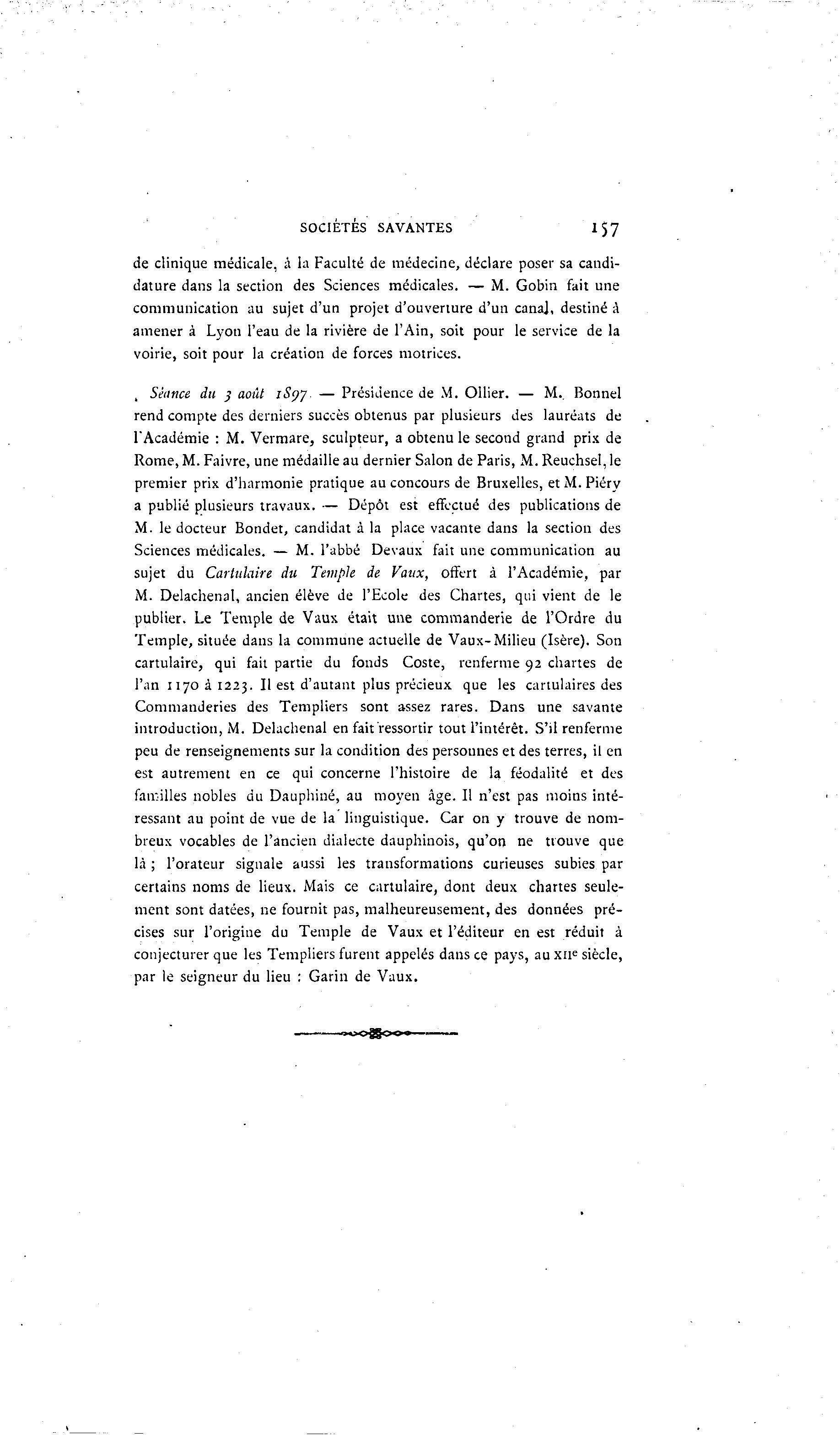 SOCIETES SAVANTES 157 de clinique médicale, à la Faculté de médecine, déclare poser sa candi- dature dans la section des Sciences médicales. — M. Gobin fait une communication au sujet d'un projet d'ouverture d'un canaj, destiné à amener à Lyon l'eau de la rivière de l'Ain, soit pour le service de la voirie, soit pour la création de forces motrices. , Séance du 3 août 1S97. — Présidence de M. Ollier. — M.. Bonnel rend compte des derniers succès obtenus par plusieurs des lauréats de l'Académie : M. Vermare, sculpteur, a obtenu le second grand prix de Rome, M. Faivre, une médaille au dernier Salon de Paris, M. Reuchsel, le premier prix d'harmonie pratique au concours de Bruxelles, et M. Piéry a publié plusieurs travaux. — Dépôt est effectué des publications de M. le docteur Bondet, candidat à la place vacante dans la section des Sciences médicales. — M. l'abbé Devaux fait une communication au sujet du Cartulaire du Temple de Vaux, offert à l'Académie, par M. Delachenal, ancien élève de l'Ecole des Chartes, qui vient de le publier. Le Temple de Vaux était une commanderie de l'Ordre du Temple, située dans la commune actuelle de Vaux-Milieu (Isère). Son cartulaire, qui fait partie du fonds Coste, renferme 92 chartes de l'an 1170 à 1223. Il est d'autant plus précieux que les cartulaires des Commanderies des Templiers sont assez rares. Dans une savante introduction, M. Delachenal en fait ressortir tout l'intérêt. S'il renferme peu de renseignements sur la condition des personnes et des terres, il en est autrement en ce qui concerne l'histoire de la féodalité et des familles nobles du Dauphiné, au moyen âge. Il n'est pas moins inté- ressant au point de vue de la linguistique. Car on y trouve de nom- breux vocables de l'ancien dialecte dauphinois, qu'on ne tiouve que là ; l'orateur signale aussi les transformations curieuses subies par certains noms de lieux. Mais ce cartulaire, dont deux chartes seule- ment sont datées, ne fournit pas, malheureusement, des données pré- cises sur l'origine du Temple de Vaux et l'éditeur en est réduit à conjecturer que les Templiers furent appelés dans ce pays, au xn e siècle, par le seigneur du lieu : Garin de Vaux.