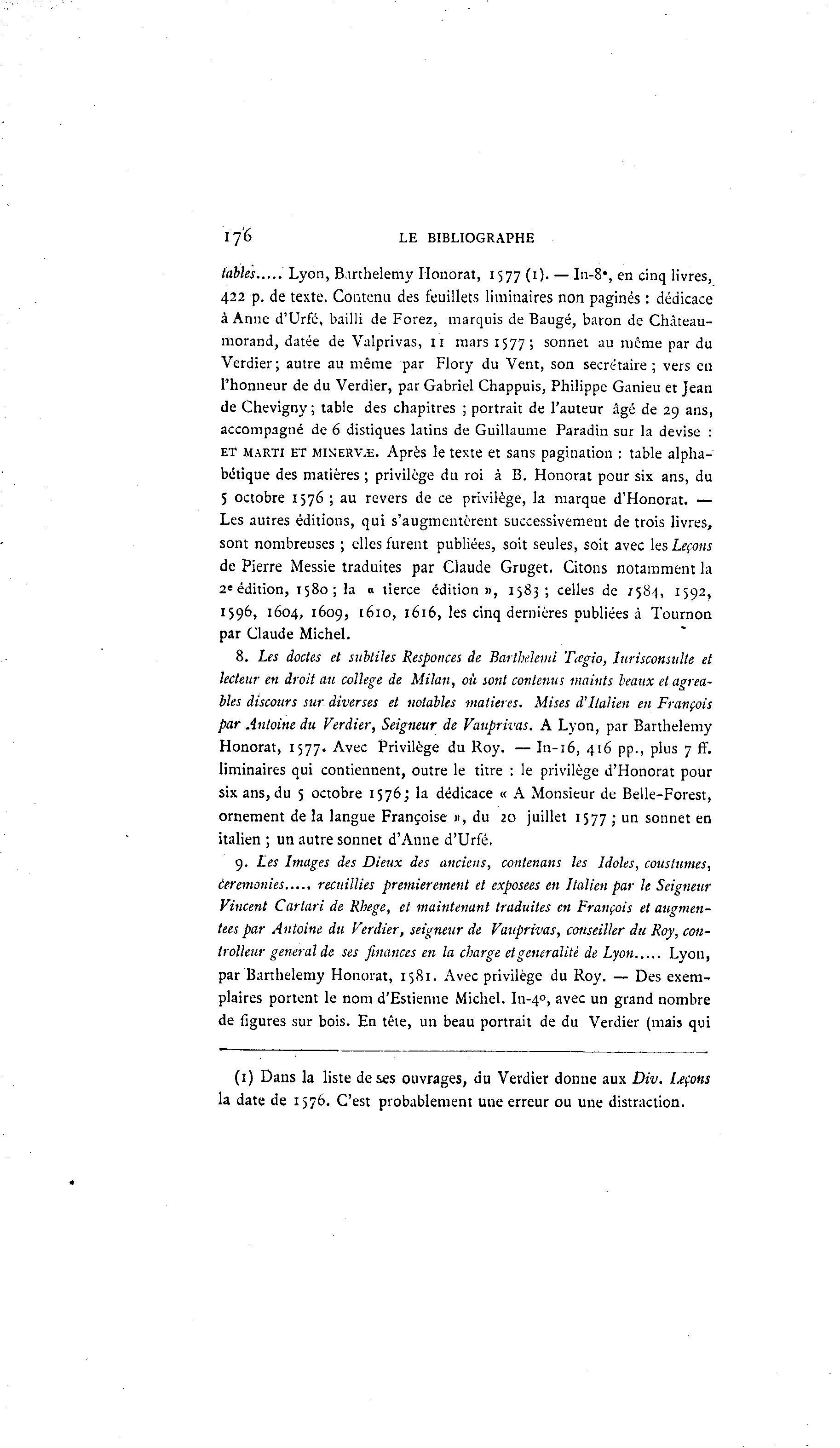 176 LE BIBLIOGRAPHE tables Lyon, B.mhelemy Honorât, 1577 (1). — In-8*, en cinq livres, 422 p. de texte. Contenu des feuillets liminaires non paginés : dédicace à Anne d'Urfé, bailli de Forez, marquis de Baugé, baron de Chà teau- morand, datée de Valprivas, 11 mars 1577; sonnet au même par du Verdier; autre au même par Flory du Vent, son secrétaire ; vers en l'honneur de du Verdier, par Gabriel Chappuis, Philippe Ganieu et Jean de Chevigny ; table des chapitres ; portrait de l'auteur âgé de 29 ans, accompagné de 6 distiques latins de Guillaume Paradin sur la devise : ET MARTI ET MINERVE. Après le texte et sans pagination : table alpha- bétique des matières ; privilège du roi à B. Honorât pour six ans, du 5 octobre 1576 ; au revers de ce privilège, la marque d'Honorat. — Les autres éditions, qui s'augmentèrent successivement de trois livres, sont nombreuses ; elles furent publiées, soit seules, soit avec les Leçons de Pierre Messie traduites par Claude Gruget. Citons notamment la 2' édition, 1580; la « tierce édition », 1583 ; celles de 7584, 1592, 1596, 1604, 1609, 1610, 1616, les cinq dernières publiées à Tournon par Claude Michel. 8. Les doctes et subtiles Responces de Barthelemi Tœgio, lurisconsulte et lecteur en droit au collège de Milan, où sont contenus maints beaux et agréa- bles discours sur. diverses et notables matières. Mises d'Italien en François par Antoine du Verdier, Seigneur de Vauprivas. A Lyon, par Barthélémy Honorât, 1577. Avec Privilège du Roy. — In-16, 416 pp., plus 7 ff. liminaires qui contiennent, outre le titre : le privilège d'Honorat pour six ans, du 5 octobre 1576; la dédicace « A Monsieur de Belle-Forest, ornement de la langue Françoise », du 20 juillet 1577 ; un sonnet en italien ; un autre sonnet d'Anne d'Urfé. 9. Les Images des Dieux des anciens, contenans les Idoles, couslumes, cérémonies recuillies premièrement et exposées en Italien par le Seigneur Vincent Cartari de Rhege, et maintenant traduites en François et augmen- tées par Antoine du Verdier, seigneur de Vauprivas, conseiller du Roy, con- trolleur gênerai de ses finances en la charge et généralité de Lyon Lyon, par Barthélémy Honorât, 1581. Avec privilège du Roy. — Des exem- plaires portent le nom d'Estienne Michel. In-4 0 , avec un grand nombre de figures sur bois. En tête, un beau portrait de du Verdier (mais qui (1) Dans la liste des£S ouvrages, du Verdier donne aux Div. Leçons la date de 1576. C'est probablement une erreur ou une distraction.