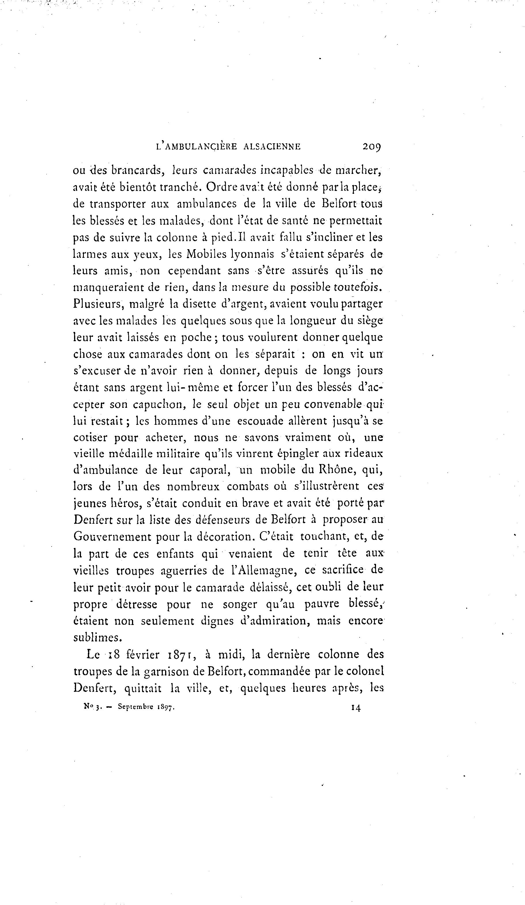 L'AMBULANCIÈRE ALSACIENNE 209 ou ties brancards, leurs camarades incapables de marcher, avait été bientôt tranché. Ordre ava:t été donné parla place;- de transporter aux ambulances de la ville de Belfort tous les blessés et les malades, dont l'état de santé ne permettait pas de suivre la colonne à pied.Il avait fallu s'incliner et les larmes aux yeux, les Mobiles lyonnais s'étaient séparés de leurs amis, non cependant sans s'être assurés qu'ils ne manqueraient de rien, dans la mesure du possible toutefois. Plusieurs, malgré la disette d'argent, avaient voulu partager avec les malades les quelques sous que la longueur du siège leur avait laissés en poche; tous voulurent donner quelque chose aux camarades dont on les séparait : on en vit un s'excuser de n'avoir rien à donner, depuis de longs jours étant sans argent lui-même et forcer l'un des blessés d'ac- cepter son capuchon, le seul objet un peu convenable qui lui restait ; les hommes d'une escouade allèrent jusqu'à se cotiser pour acheter, nous ne savons vraiment où, une vieille médaille militaire qu'ils vinrent épingler aux rideaux d'ambulance de leur caporal, un mobile du Rhône, qui, lors de l'un des nombreux combats où s'illustrèrent ces jeunes héros, s'était conduit en brave et avait été porté par Denfert sur la liste des défenseurs de Belfort à proposer au Gouvernement pour la décoration. C'était touchant, et, de la part de ces enfants qui venaient de tenir tête aux vieilles troupes aguerries de l'Allemagne, ce sacrifice de leur petit avoir pour le camarade délaissé, cet oubli de leur propre détresse pour ne songer qu'au pauvre blessé,j étaient non seulement dignes d'admiration, mais encore sublimes. Le 18 février 1871, à midi, la dernière colonne des troupes de la garnison de Belfort, commandée par le colonel Denfert, quittait la ville, et, quelques heures après, les N ° 3. — Septembre 1897. 14.