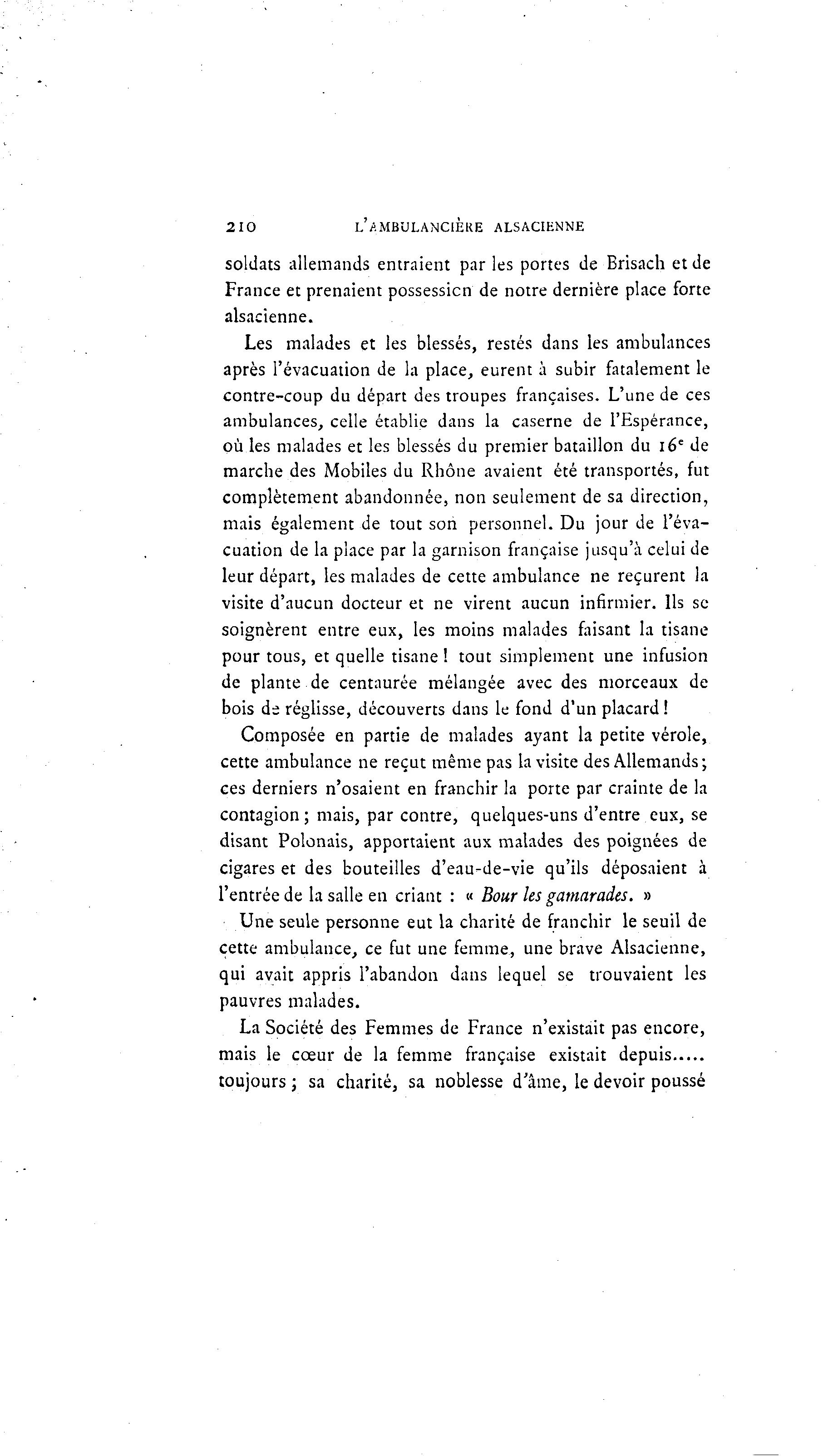 210 L'AMBULANCIÈRE ALSACIENNE soldats allemands entraient par les portes de Brisach et de France et prenaient possession de notre dernière place forte alsacienne. Les malades et les blessés, restés dans les ambulances après l'évacuation de la place, eurent à subir fatalement le contre-coup du départ des troupes françaises. L'une de ces ambulances, celle établie dans la caserne de l'Espérance, où les malades et les blessés du premier bataillon du 16e de marche des Mobiles du Rhône avaient été transportés, fut complètement abandonnée, non seulement de sa direction, mais également de tout son personnel. Du jour de l'éva- cuation de la place par la garnison française jusqu'à celui de leur départ, les malades de cette ambulance ne reçurent la visite d'aucun docteur et ne virent aucun infirmier. Ils se soignèrent entre eux, les moins malades faisant la tisane pour tous, et quelle tisane ! tout simplement une infusion de plante de centaurée mélangée avec des morceaux de bois de réglisse, découverts dans le fond d'un placard ! Composée en partie de malades ayant la petite vérole, cette ambulance ne reçut même pas la visite des Allemands ; ces derniers n'osaient en franchir la porte par crainte de la contagion; mais, par contre, quelques-uns d'entre eux, se disant Polonais, apportaient aux malades des poignées de cigares et des bouteilles d'eau-de-vie qu'ils déposaient à l'entrée de la salle en criant : « Bour les gamarades. » Une seule personne eut la charité de franchir le seuil de cette ambulance, ce fut une femme, une brave Alsacienne, qui avait appris l'abandon dans lequel se trouvaient les pauvres malades. La Société des Femmes de France n'existait pas encore, mais le cœur de la femme française existait depuis toujours ; sa charité, sa noblesse d'âme, le devoir poussé