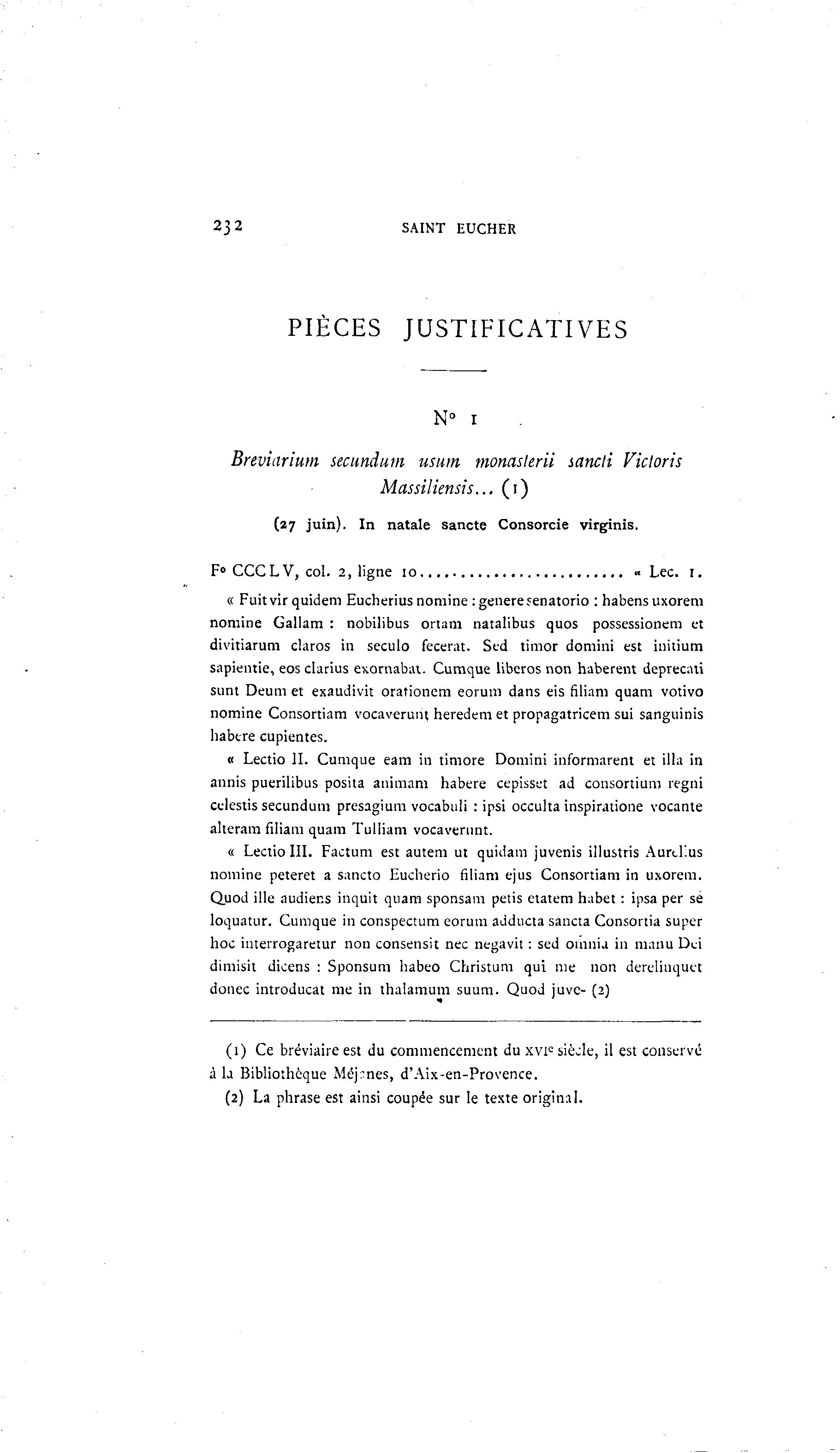 232 SAINT EUCHER PIÈCES JUSTIFICATIVES N° 1 Breviarium secundum usurn monaslerii sancli Vicloris Massiliensis... (1) (27 juin). In natale sancte Consorcie virginis. F» CCCLV, col. 2, ligne 10 « Lee. 1. « Fuitvir quidem Eucherius noraine : génère senatorio : habens uxorera noniine Gallam : nobilibus ortani natalibus quos possessionem et divitiarum claros in seculo fecerat. Sed timor domini est initium sapientie, eos clarius exornabat. Cumque liberos non haberent deprecati sunt Deum et exaudivit orationem eorum dans eis filiam quam votivo nomine Consortiam vocaverunt heredem et propagatricem sui sanguinis habtre cupientes. « Lectio IL Cumque eam in timoré Domini informarent et illa in annis puerilibus posita animam habere cepisset ad consortium regni celestis secundum presagium vocabuli : ipsi occulta inspiratione vocante alteram filiam quam Tulliam vocaverunt. « Lectio III. Factum est autem ut quidam juvenis illustris Aurd'us nomine peteret a sancto Eucherio filiam ejus Consortiam in uxorem. Quod ille audiens inquit quam sponsam petis etatem habet : ipsa per se loquatur. Cumque in conspectum eorum adducta sancta Consortia super hoc interrogaretur non consensit nec negavit : sed omnia in manu Du dimisit dicens : Sponsum habeo Christum qui me non derelinquct donec introducat me in thalamum suum. Quod juve- (2) (1) Ce bréviaire est du commencement du xvic siècle, il est conservé à la Bibliothèque Méjnnes, d'Aix-en-Provence. (2) La phrase est ainsi coupée sur le texte original.