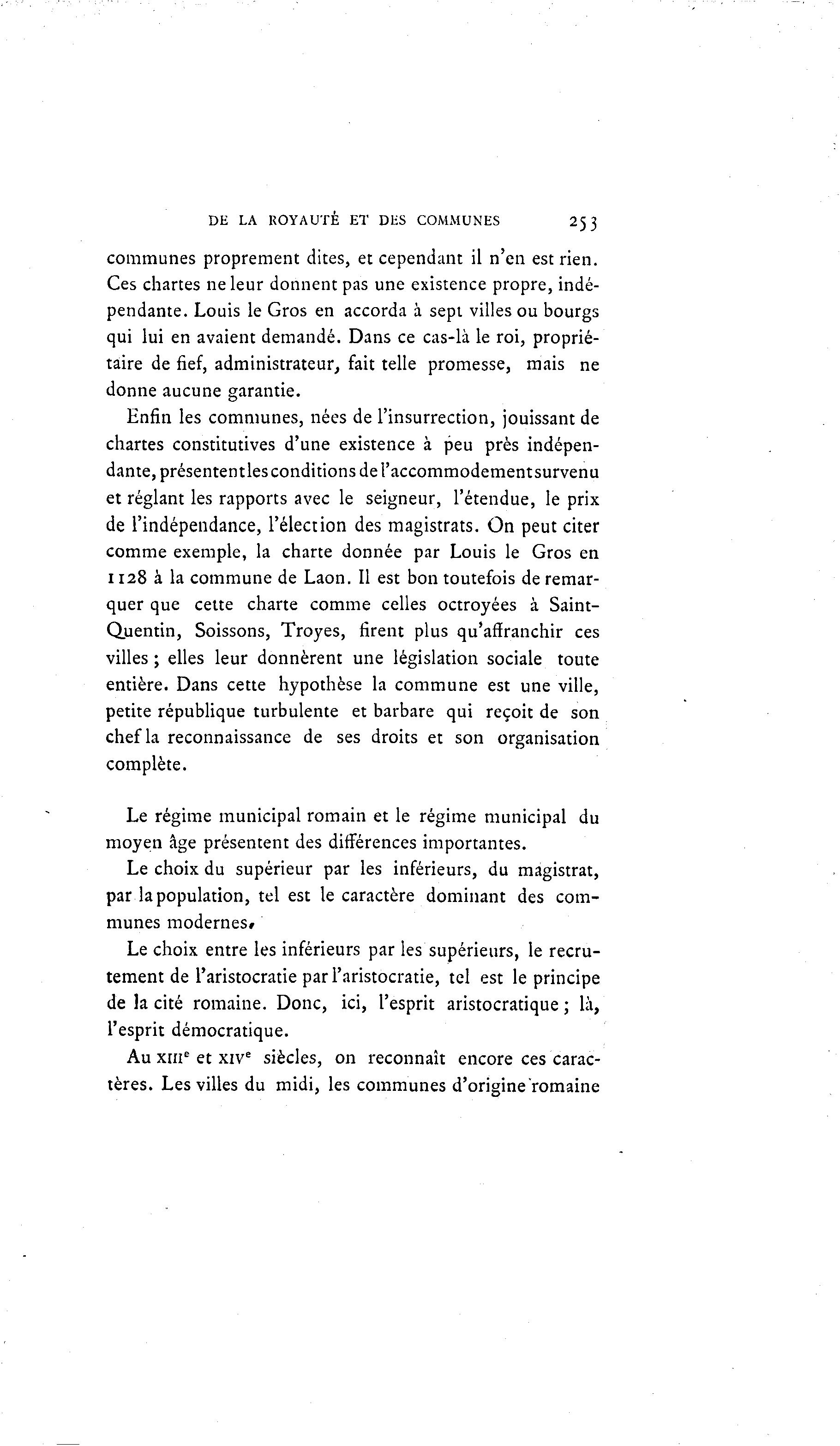 DE LA ROYAUTÉ ET DES COMMUNES 253 communes proprement dites, et cependant il n'en est rien. Ces chartes ne leur donnent pas une existence propre, indé- pendante. Louis le Gros en accorda à sept villes ou bourgs qui lui en avaient demandé. Dans ce cas-là le roi, proprié- taire de fief, administrateur, fait telle promesse, mais ne donne aucune garantie. Enfin les communes, nées de l'insurrection, jouissant de chartes constitutives d'une existence à peu près indépen- dante, présententles conditions de l'accommodementsurvenu et réglant les rapports avec le seigneur, l'étendue, le prix de l'indépendance, l'élection des magistrats. On peut citer comme exemple, la charte donnée par Louis le Gros en 1128 à la commune de Laon. Il est bon toutefois de remar- quer que cette charte comme celles octroyées à Saint- Quentin, Soissons, Troyes, firent plus qu'affranchir ces villes ; elles leur donnèrent une législation sociale toute entière. Dans cette hypothèse la commune est une ville, petite république turbulente et barbare qui reçoit de son chef la reconnaissance de ses droits et son organisation complète. Le régime municipal romain et le régime municipal du moyen âge présentent des différences importantes. Le choix du supérieur par les inférieurs, du magistrat, par la population, tel est le caractère dominant des com- munes modernes» Le choix entre les inférieurs par les supérieurs, le recru- tement de l'aristocratie par l'aristocratie, tel est le principe de la cité romaine. Donc, ici, l'esprit aristocratique ; là , l'esprit démocratique. Au xrne et xive siècles, on reconnaît encore ces carac- tères. Les villes du midi, les communes d'origine romaine