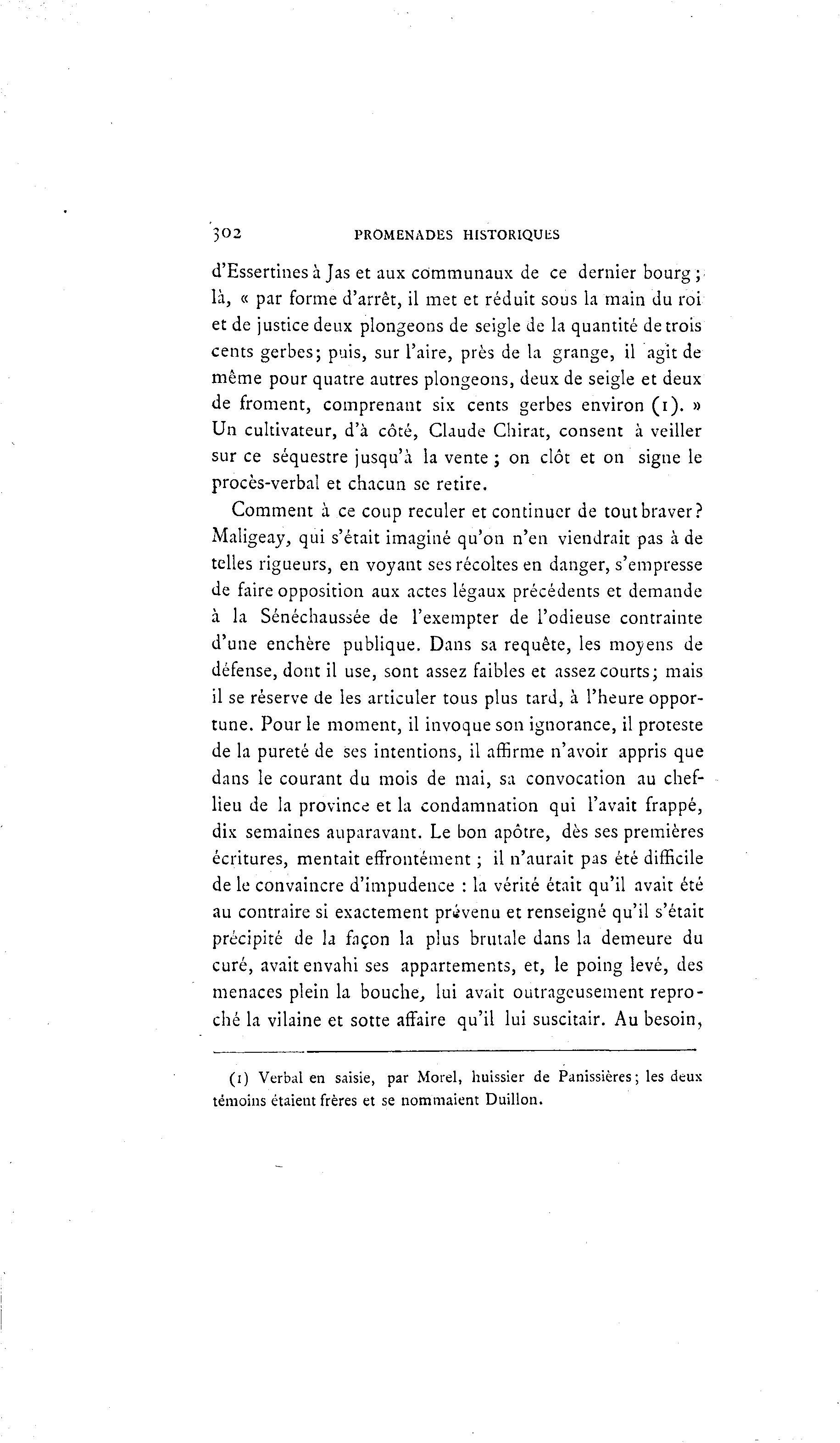 302 PROMENADES HISTORIQUES d'Essertines à Jas et aux communaux de ce dernier bourg ; là , « par forme d'arrêt, il met et réduit sous la main du roi et de justice deux plongeons de seigle de la quantité de trois cents gerbes; puis, sur l'aire, près de la grange, il agit de même pour quatre autres plongeons, deux de seigle et deux de froment, comprenant six cents gerbes environ ( i ) . » Un cultivateur, d'à côté, Claude Chirat, consent à veiller sur ce séquestre jusqu'à la vente; on clôt et on signe le procès-verbal et chacun se retire. Comment à ce coup reculer et continuer de tout braver? Maligeay, qui s'était imaginé qu'on n'en viendrait pas à de telles rigueurs, en voyant ses récoltes en danger, s'empresse de faire opposition aux actes légaux précédents et demande à la Sénéchaussée de l'exempter de l'odieuse contrainte d'une enchère publique. Dans sa requête, les moyens de défense, dont il use, sont assez faibles et assez courts; mais il se réserve de les articuler tous plus tard, à l'heure oppor- tune. Pour le moment, il invoque son ignorance, il proteste de la pureté de ses intentions, il affirme n'avoir appris que dans le courant du mois de mai, sa convocation au chef- lieu de la province et la condamnation qui l'avait frappé, dix semaines auparavant. Le bon apôtre, dès ses premières écritures, mentait effrontément ; il n'aurait pas été difficile de le convaincre d'impudence : la vérité était qu'il avait été au contraire si exactement provenu et renseigné qu'il s'était précipité de la façon la plus brutale dans la demeure du curé, avait envahi ses appartements, et, le poing levé, des menaces plein la bouche, lui avait outrageusement repro- ché la vilaine et sotte affaire qu'il lui suscitair. Au besoin, (i) Verbal en saisie, par Morel, huissier de Panissières; les deux témoins étaient frères et se nommaient Duillon.