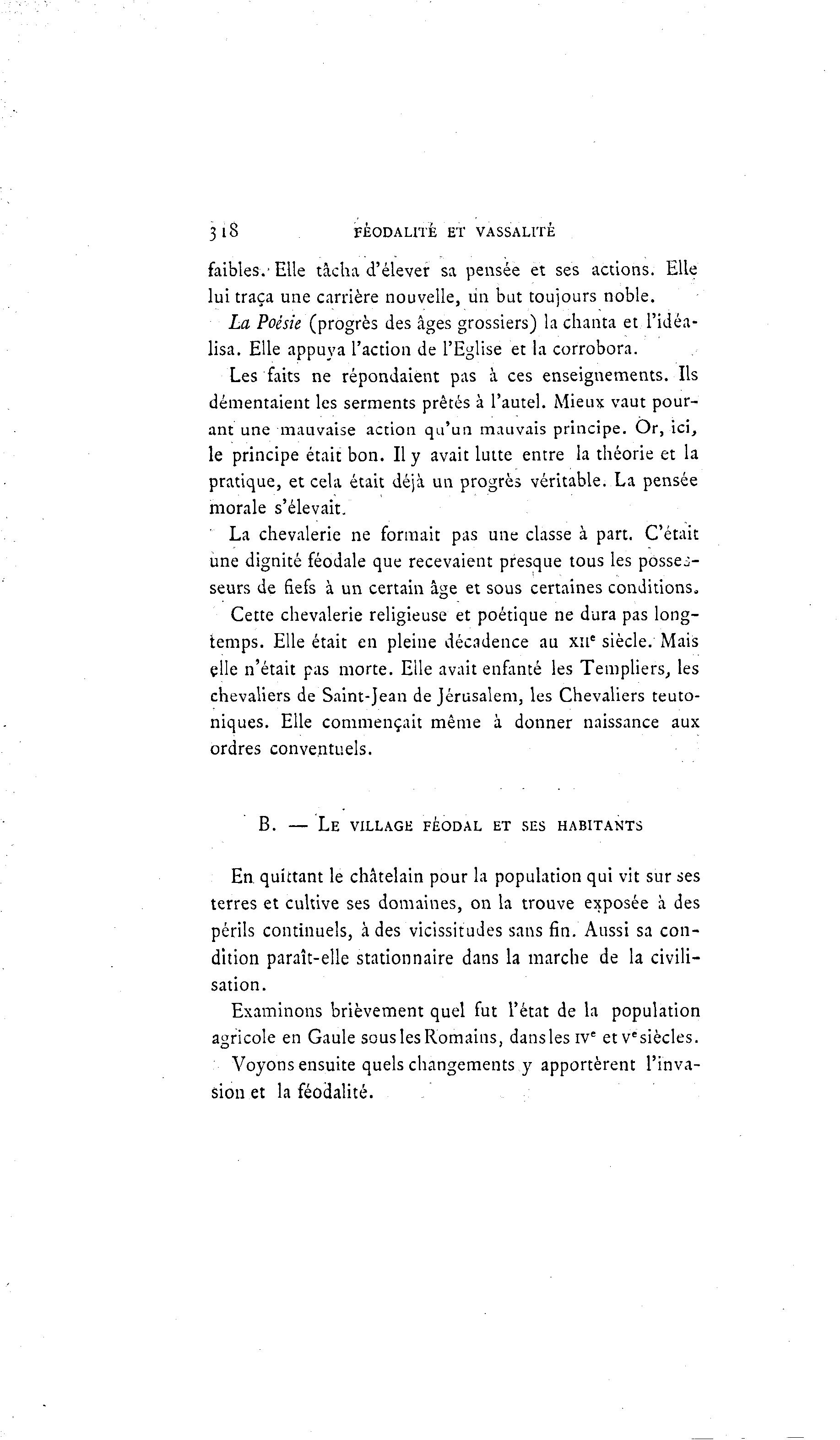 3l8 FÉODALITÉ ET VASSALITÉ faibles.- Elle tâcha d'élever sa pensée et ses actions. Elle lui traça une carrière nouvelle, un but toujours noble. La Poésie (progrès des âges grossiers) la chanta et l'idéa- lisa. Elle appuya l'action de l'Eglise et la corrobora. Les faits ne répondaient pas à ces enseignements. Ils démentaient les serments prêtés à l'autel. Mieux vaut pour- ant une mauvaise action qu'un mauvais principe. Or, ici, le principe était bon. Il y avait lutte entre la théorie et la pratique, et cela était déjà un progrès véritable. La pensée morale s'élevait. ' La chevalerie ne formait pas une classe à part. C'était une dignité féodale que recevaient presque tous les posses- seurs de fiefs à un certain âge et sous certaines conditions. Cette chevalerie religieuse et poétique ne dura pas long- temps. Elle était en pleine décadence au xue siècle. Mais elle n'était pas morte. Elle avait enfanté les Templiers, les chevaliers de Saint-Jean de Jérusalem, les Chevaliers teuto- niques. Elle commençait même à donner naissance aux ordres conventuels. B. — LE VILLAGE FÉODAL ET SES HABITANTS En quittant le châtelain pour la population qui vit sur ses terres et cultive ses domaines, on la trouve exposée à des périls continuels, à des vicissitudes sans fin. Aussi sa con- dition paraît-elle stationnaire dans la marche de la civili- sation. Examinons brièvement quel fut l'état de la population agricole en Gaule souslesRomains, danslesiv e etv'siècles. Voyons ensuite quels changements y apportèrent l'inva- sion et la féodalité.