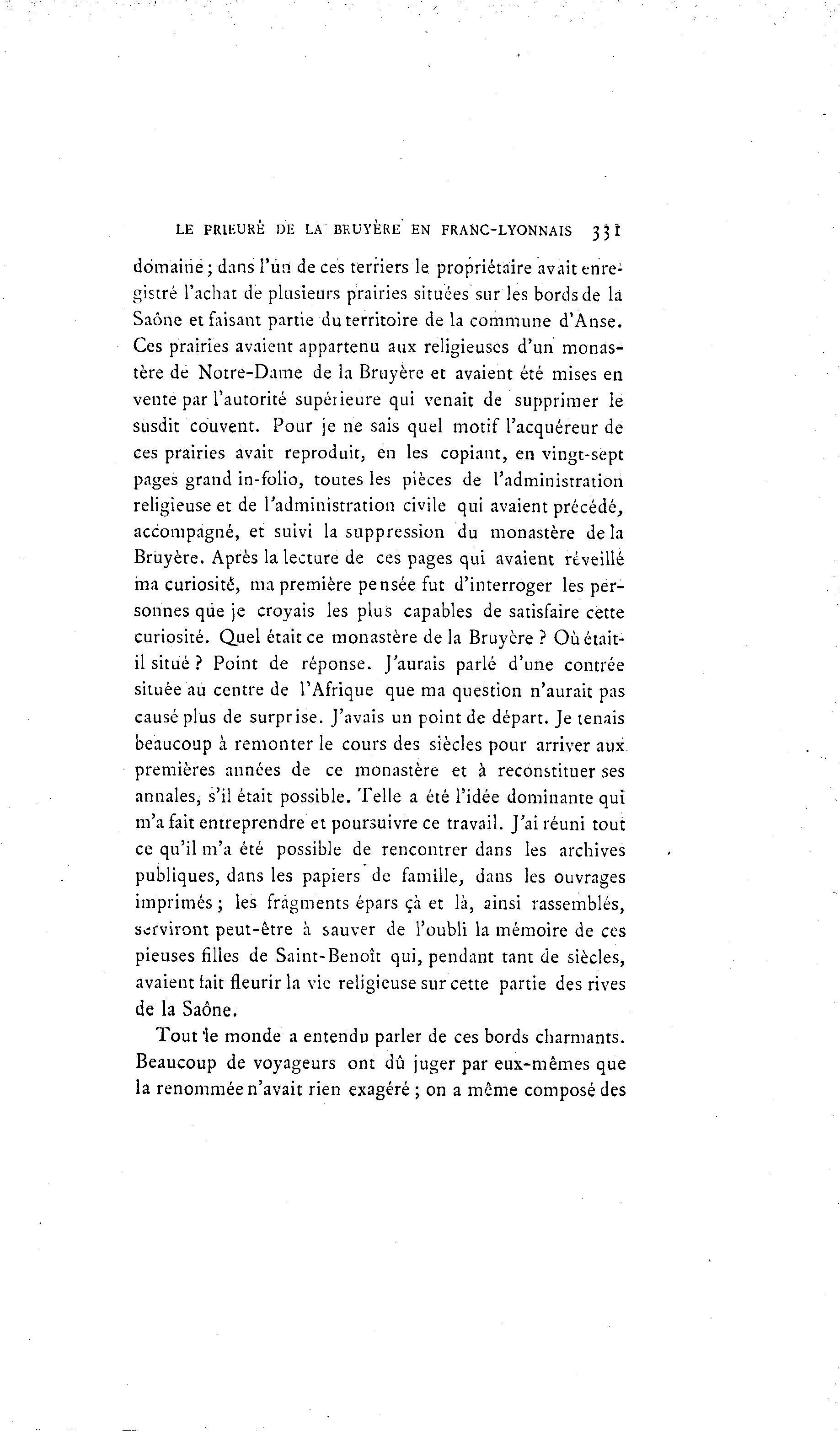LE PRIEURÉ DE LA BRUYÈRE EN FRANC-LYONNAIS 33I domaine ; dans l'un de ces terriers le propriétaire avait enre- gistré l'achat de plusieurs prairies situées sur les bords de là Saône et faisant partie du territoire de la commune d'Anse. Ces prairies avaient appartenu aux religieuses d'un monas- tère de Notre-Dame de la Bruyère et avaient été mises en vente par l'autorité supérieure qui venait de supprimer le susdit couvent. Pour je ne sais quel motif l'acquéreur de ces prairies avait reproduit, en les copiant, en vingt-sept pages grand in-folio, toutes les pièces de l'administration religieuse et de l'administration civile qui avaient précédé, accompagné, et suivi la suppression du monastère delà Bruyère. Après la lecture de ces pages qui avaient réveillé ma curiosité, ma première pensée fut d'interroger les per- sonnes que je croyais les plus capables de satisfaire cette curiosité. Quel était ce monastère de la Bruyère ? Où était- il situé ? Point de réponse. J'aurais parlé d'une contrée située au centre de l'Afrique que ma question n'aurait pas causé plus de surprise. J'avais un point de départ. Je tenais beaucoup à remonter le cours des siècles pour arriver aux premières années de ce monastère et à reconstituer ses annales, s'il était possible. Telle a été l'idée dominante qui m'a fait entreprendre et poursuivre ce travail. J'ai réuni tout ce qu'il m'a été possible de rencontrer dans les archives publiques, dans les papiers de famille, dans les ouvrages imprimés ; les fragments épars çà et là , ainsi rassemblés, serviront peut-être à sauver de l'oubli la mémoire de ces pieuses filles de Saint-Benoît qui, pendant tant de siècles, avaient tait fleurir la vie religieuse sur cette partie des rives de la Saône. Tout 'le monde a entendu parler de ces bords charmants. Beaucoup de voyageurs ont dû juger par eux-mêmes que la renommée n'avait rien exagéré ; on a même composé des
