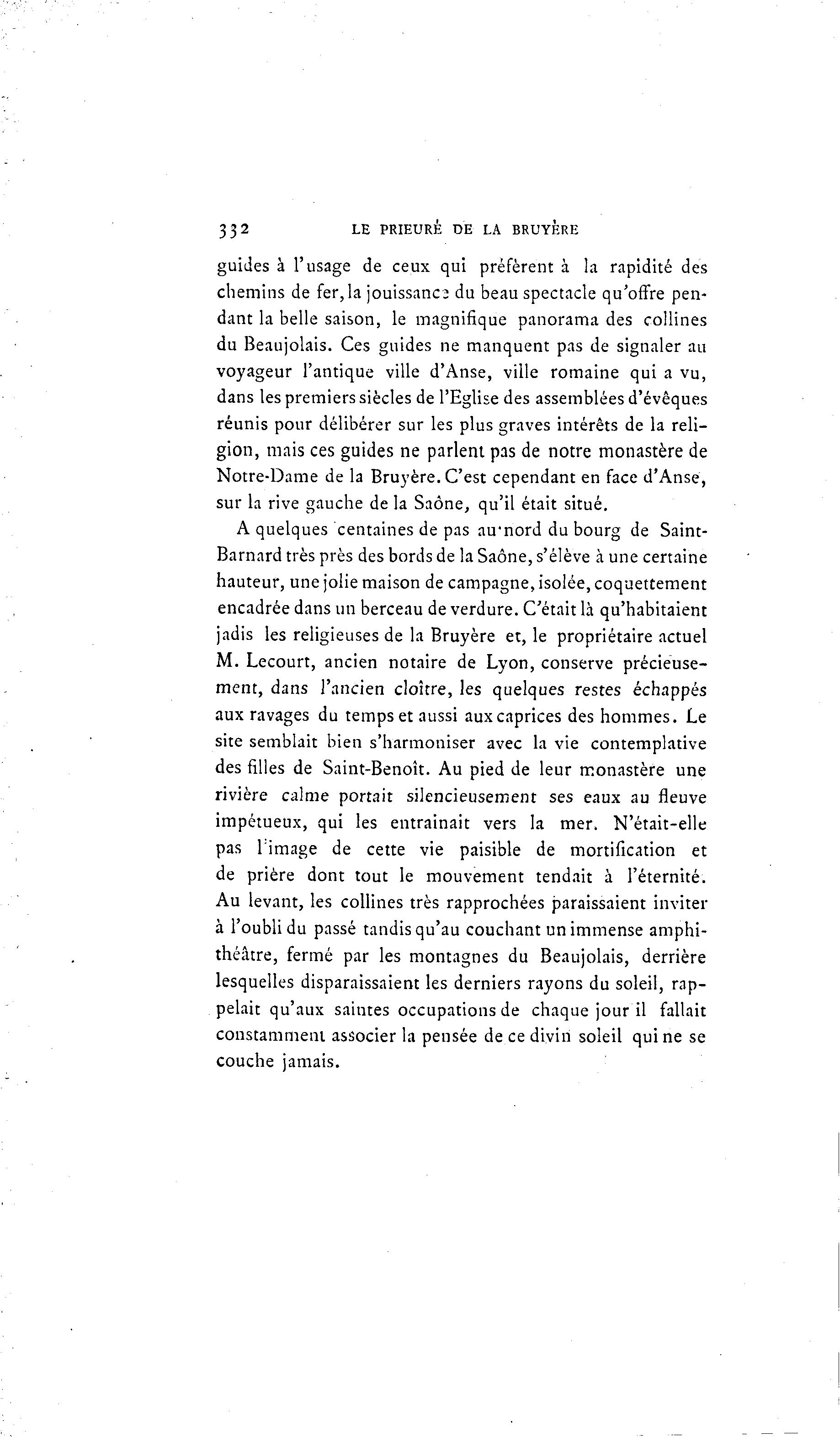 332 LE PRIEURÉ DE LA BRUYERE guides à l'usage de ceux qui préfèrent à la rapidité des chemins de fer,la jouissanc; du beau spectacle qu'offre pen- dant la belle saison, le magnifique panorama des collines du Beaujolais. Ces guides ne manquent pas de signaler au voyageur l'antique ville d'Anse, ville romaine qui a vu, dans les premiers siècles de l'Eglise des assemblées d'évêques réunis pour délibérer sur les plus graves intérêts de la reli- gion, mais ces guides ne parlent pas de notre monastère de Notre-Dame de la Bruyère. C'est cependant en face d'Anse, sur la rive gauche de la Saône, qu'il était situé. A quelques centaines de pas au'nord du bourg de Saint- Barnard très près des bords de la Saône, s'élève à une certaine hauteur, une jolie maison de campagne, isolée, coquettement encadrée dans un berceau de verdure. C'était là qu'habitaient jadis les religieuses de la Bruyère et, le propriétaire actuel M. Lecourt, ancien notaire de Lyon, conserve précieuse- ment, dans l'ancien cloître, les quelques restes échappés aux ravages du temps et aussi aux caprices des hommes. Le site semblait bien s'harmoniser avec la vie contemplative des filles de Saint-Benoît. Au pied de leur monastère une rivière calme portait silencieusement ses eaux au fleuve impétueux, qui les entraînait vers la mer. N'était-elle pas l'image de cette vie paisible de mortification et de prière dont tout le mouvement tendait à l'éternité. Au levant, les collines très rapprochées paraissaient inviter à l'oubli du passé tandis qu'au couchant un immense amphi- théâtre, fermé par les montagnes du Beaujolais, derrière lesquelles disparaissaient les derniers rayons du soleil, rap- pelait qu'aux saintes occupations de chaque jour il fallait constamment associer la pensée de ce divin soleil qui ne se couche jamais.