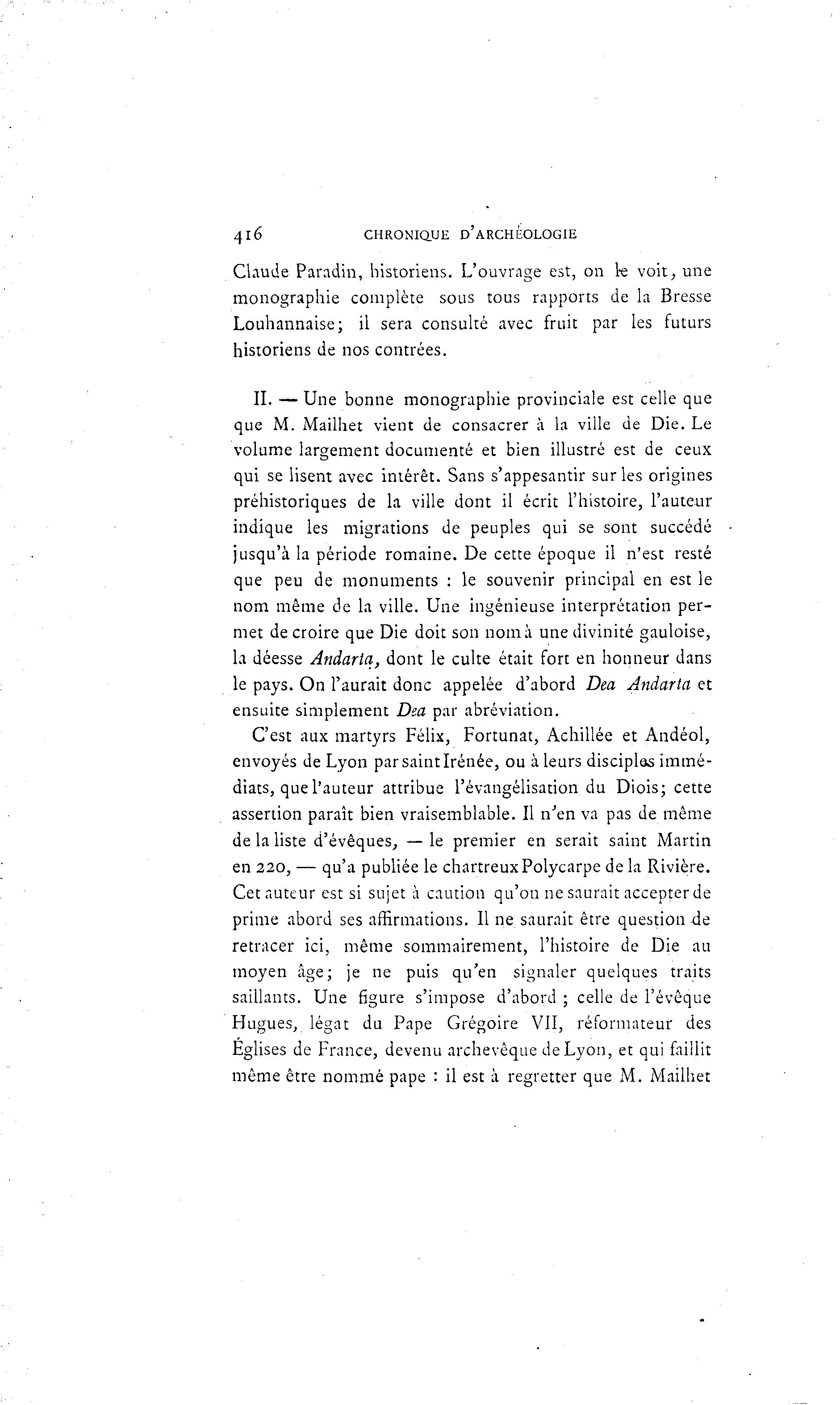 4 lé CHRONIQUE D'ARCHÉOLOGIE Claude Paradin, historiens. L'ouvrage est, on k voit, une monographie complète sous tous rapports de la Bresse Louhannaise; il sera consulté avec fruit par les futurs historiens de nos contrées. II. — Une bonne monographie provinciale est celle que que M. Mailhet vient de consacrer à la ville de Die. Le volume largement documenté et bien illustré est de ceux qui se lisent avec intérêt. Sans s'appesantir sur les origines préhistoriques de la ville dont il écrit l'histoire, l'auteur indique les migrations de peuples qui se sont succédé jusqu'à la période romaine. De cette époque il n'est resté que peu de monuments : le souvenir principal en est le nom même de la ville. Une ingénieuse interprétation per- met de croire que Die doit son nom à une divinité gauloise, la déesse Andarta, dont le culte était fort en honneur dans le pays. On l'aurait donc appelée d'abord Dea Andarta et ensuite simplement Dea par abréviation. C'est aux martyrs Félix, Fortunat, Achillée et Andéol, envoyés de Lyon par saint Irénée, ou à leurs disciplas immé- diats, que l'auteur attribue l'évangélisation du Diois; cette assertion paraît bien vraisemblable. Il n'en va pas de même de la liste d'évêques, — le premier en serait saint Martin en 220, — qu'a publiée le chartreuxPolycarpe de la Rivière. Cet auteur est si sujet à caution qu'on ne saurait accepter de prime abord ses affirmations. Il ne saurait être question de retracer ici, même sommairement, l'histoire de Die au moyen âge; je ne puis qu'en signaler quelques traits saillants. Une Bgure s'impose d'abord ; celle de l'évêque Hugues, légat du Pape Grégoire VII, réformateur des Eglises de France, devenu archevêque de Lyon, et qui faillit même être nommé pape : il est à regretter que M. Mailhet