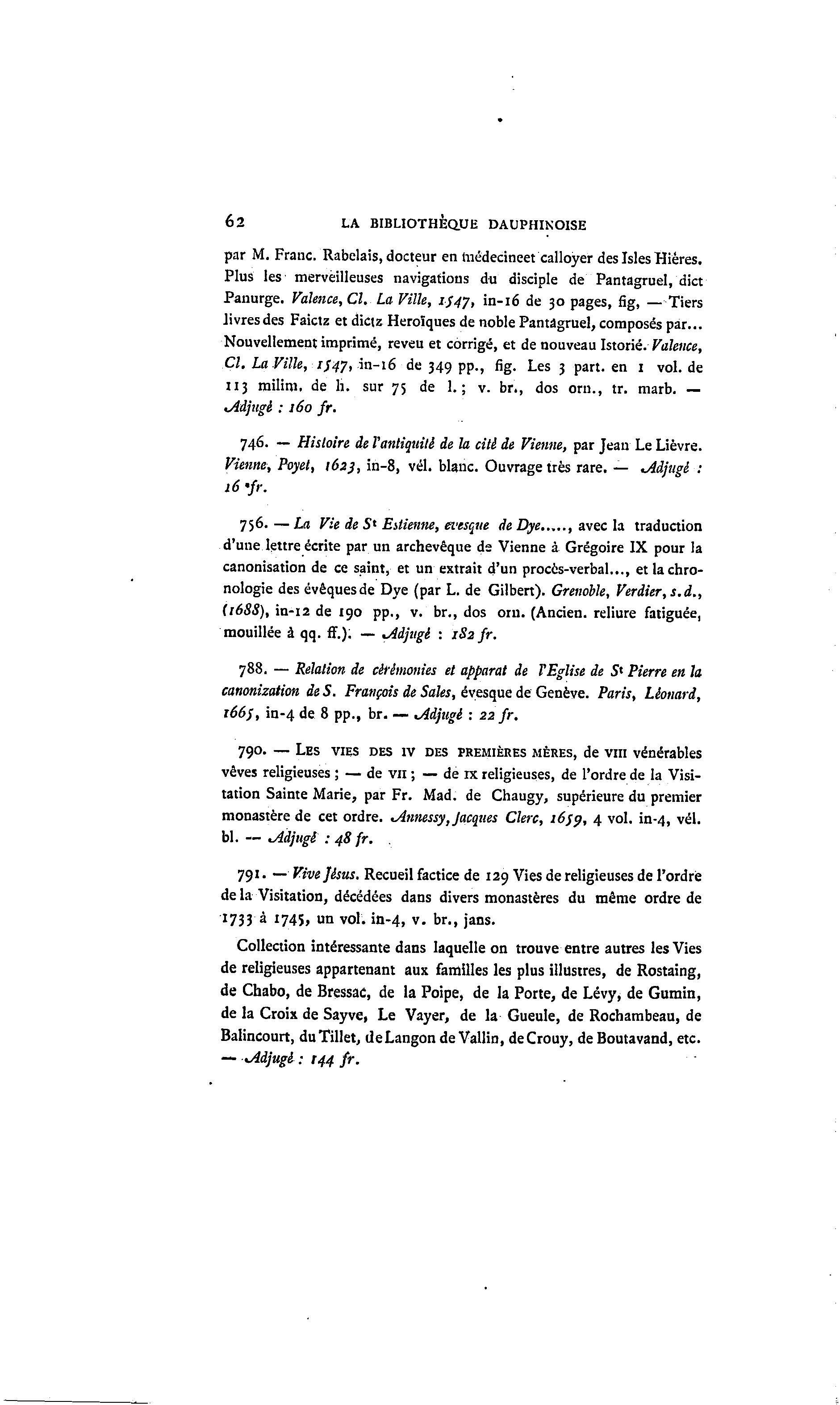 62 LA BIBLIOTHÈQJJE DAUPHINOISE par M. Franc. Rabelais, docteur en médecineet calloyer des Isles Hières. Plus les merveilleuses navigations du disciple de Pantagruel, dict Panurge. Valence, Cl. La Ville, 1J47, in-16 de 30 pages, fig, — Tiers livres des Faictz et diciz Héroïques de noble Pantagruel, composés par... Nouvellement imprimé, reveu et corrigé, et de nouveau Istorié. Valence, Cl. La Ville, 1/47, in-16 de 349 pp., fig. Les 3 part, en 1 vol.de 113 milim. de h. sur 75 de 1.; v. br., dos orn., tr. marb. — ^Adjugé : 160 fr. 746. — Histoire de l'antiquité de la cité de Vienne, par Jean Le Lièvre. Vienne, Poyet, 1623, in-8, vél. blanc. Ouvrage très rare, — ^Adjugé : 16 'fr. 756. — La Vie de 5« Etiietme, evesque de Dye avec la traduction d'une lettre écrite par un archevêque de Vienne à Grégoire IX pour la canonisation de ce saint, et un extrait d'un procès-verbal..., et la chro- nologie des évêquesde Dye (par L. de Gilbert). Grenoble, Verdier,s.d., (1688), in-12 de 190 pp., v. br., dos orn. (Ancien, reliure fatiguée, mouillée à qq. ff.); — adjugé : 182 fr. 788. — Relation de cérémonies et apparat de VEglise de 5< Pierre en la canonizaiion de S. François de Sales, évesque de Genève. Paris, Léonard, 166J, in-4 de 8 pp., br. — adjugé : 22 fr. 790. — LES VIES DES IV DES PREMIÈRES MÈRES, de vin vénérables vêves religieuses ; — de vu ; — de ix religieuses, de l'ordre de la Visi- tation Sainte Marie, par Fr. Mad. de Chaugy, supérieure du premier monastère de cet ordre, ^Amiessy, Jacques Clerc, 16J9, 4 vol. in-4, vél. bl. - - ^Adjugé : 48 fr. . 791. — Vive Jésus. Recueil factice de 129 Vies de religieuses de l'ordre de la Visitation, décédées dans divers monastères du même ordre de 1733 à 1745, un vol. in-4, v. br., jans. Collection intéressante dans laquelle on trouve entre autres les Vies de religieuses appartenant aux familles les plus illustres, de Rostaing, de Chabo, de Bressac, de la Poipe, de la Porte, de Lévy, de Gumin, de la Croix de Sayve, Le Vayer, de la Gueule, de Rochambeau, de Balincourt, duTillet, deLangonde Vallin, deCrouy, deBoutavand, etc. — ^Adjugé : 144 fr.