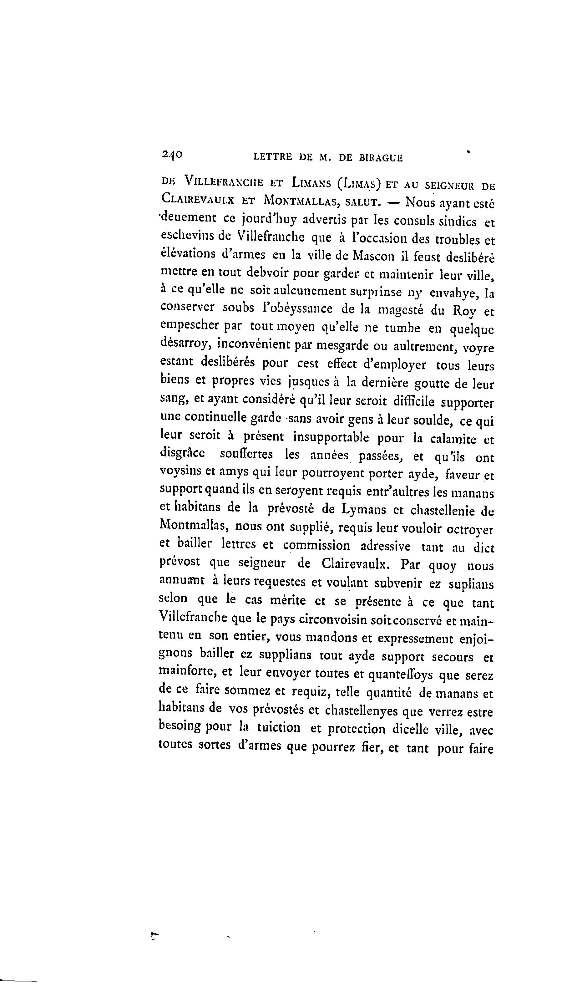 2^0 LETTRE DE M. DE BIRAGUE DE VlLLEFRANCHE ET LlMANS (LlMAS) ET AU SEIGNEUR DE CLAIREVAULX ET MONTMALLAS, SALUT. — Nous ayant esté •deuement ce jourd'huy advertis par les consuls sindics et eschevins de Villefranche que à l'occasion des troubles et élévations d'armes en la ville de Mascon il feust deslibéré mettre en tout debvoir pour garder et maintenir leur ville, à ce qu'elle ne soit aulcunement surpiinse ny envahye, la conserver soubs l'obéyssance de la magesté du Roy et empescher par tout moyen qu'elle ne tumbe en quelque désarroy, inconvénient par mesgarde ou aultrement, voyre estant deslibérés pour cest effect d'employer tous leurs biens et propres vies jusques à la dernière goutte de leur sang, et ayant considéré qu'il leur seroit difficile supporter une continuelle garde sans avoir gens à leur soulde, ce qui leur seroit à présent insupportable pour la calamité et disgrâce souffertes les années passées, et qu'ils ont voysins et amys qui leur pourroyent porter ayde, faveur et support quand ils en seroyent requis entr'aultres les manans et habitans de la prévosté de Lymans et chastellenie de Montmallas, nous ont supplié, requis leur vouloir octroyer et bailler lettres et commission adressive tant au dict prévost que seigneur de Clairevaulx. Par quoy nous annuant à leurs requestes et voulant subvenir ez suplians selon que le cas mérite et se présente à ce que tant Villefranche que le pays circonvoisin soit conservé et main- tenu en son entier, vous mandons et expressément enjoi- gnons bailler ez supplians tout ayde support secours et mainforte, et leur envoyer toutes et quanteffoys que serez de ce faire sommez et requiz, telle quantité de manans et habitans de vos prévostés et chastellenyes que verrez estre besoing pour la tuiction et protection dicelle ville, avec toutes sortes d'armes que pourrez fier, et tant pour faire