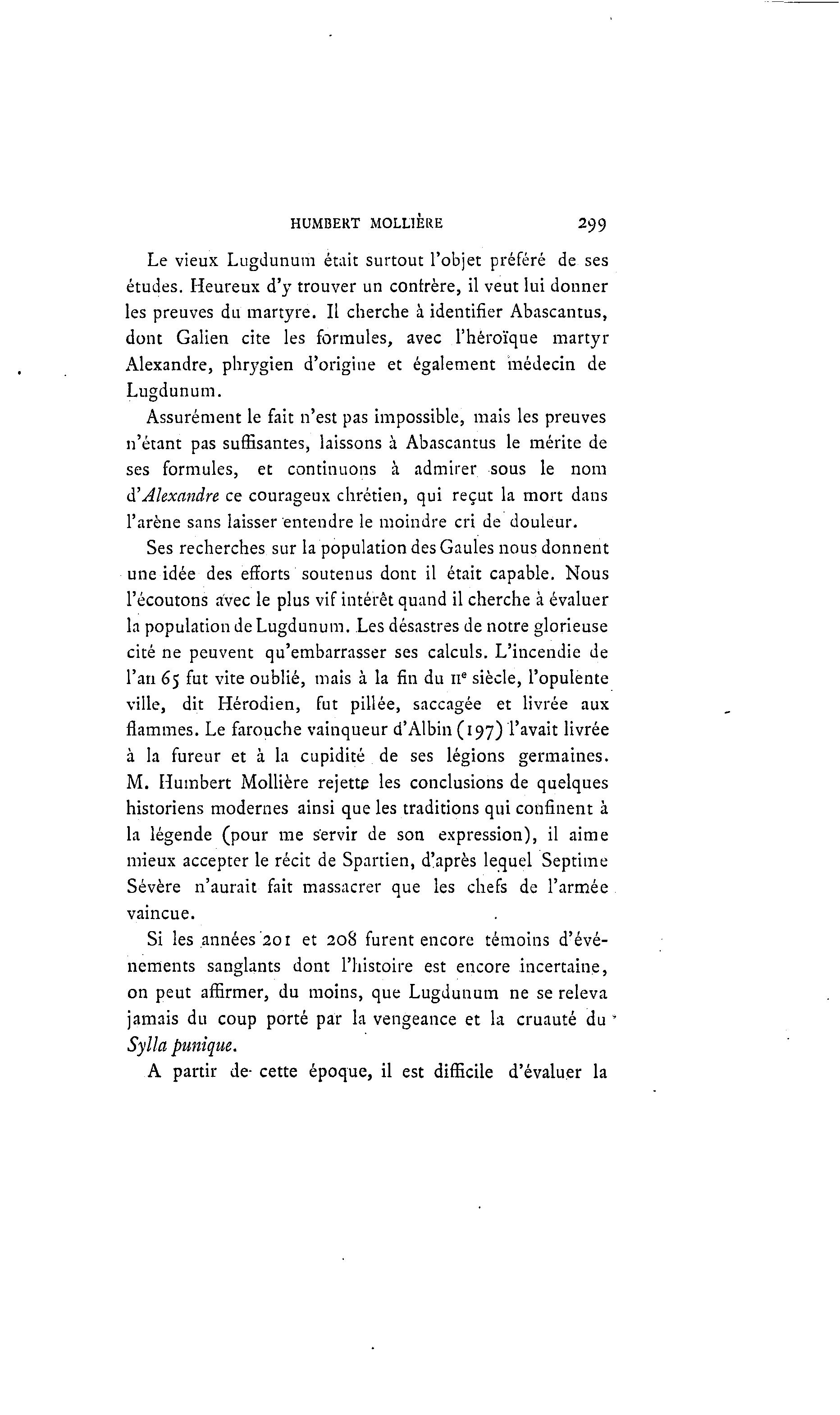 HUMBERT M0LL1ÈRE 299 Le vieux Lugdunum était surtout l'objet préféré de ses études. Heureux d'y trouver un confrère, il veut lui donner les preuves du martyre. Il cherche à identifier Abascantus, dont Galien cite les formules, avec l'héroïque martyr Alexandre, phrygien d'origine et également médecin de Lugdunum. Assurément le fait n'est pas impossible, mais les preuves n'étant pas suffisantes, laissons à Abascantus le mérite de ses formules, et continuons à admirer sous le nom d'Alexandre ce courageux chrétien, qui reçut la mort dans l'arène sans laisser entendre le moindre cri de douleur. Ses recherches sur la population des Gaules nous donnent une idée des efforts soutenus dont il était capable. Nous l'écoutons avec le plus vif intérêt quand il cherche à évaluer la population de Lugdunum. Les désastres de notre glorieuse cité ne peuvent qu'embarrasser ses calculs. L'incendie de l'an 65 fut vite oublié, mais à la fin du 11e siècle, l'opulente ville, dit Hérodien, fut pillée, saccagée et livrée aux flammes. Le farouche vainqueur d'Albin (197) l'avait livrée à la fureur et à la cupidité de ses légions germaines. M. Humbert Mollière rejette les conclusions de quelques historiens modernes ainsi que les traditions qui confinent à la légende (pour me servir de son expression), il aime mieux accepter le récit de Spartien, d'après lequel Septime Sévère n'aurait fait massacrer que les chefs de l'armée vaincue. Si les années 201 et 208 furent encore témoins d'évé- nements sanglants dont l'histoire est encore incertaine, on peut affirmer, du moins, que Lugdunum ne se releva jamais du coup porté par la vengeance et la cruauté du Sylla punique. A partir de- cette époque, il est difficile d'évaluer la