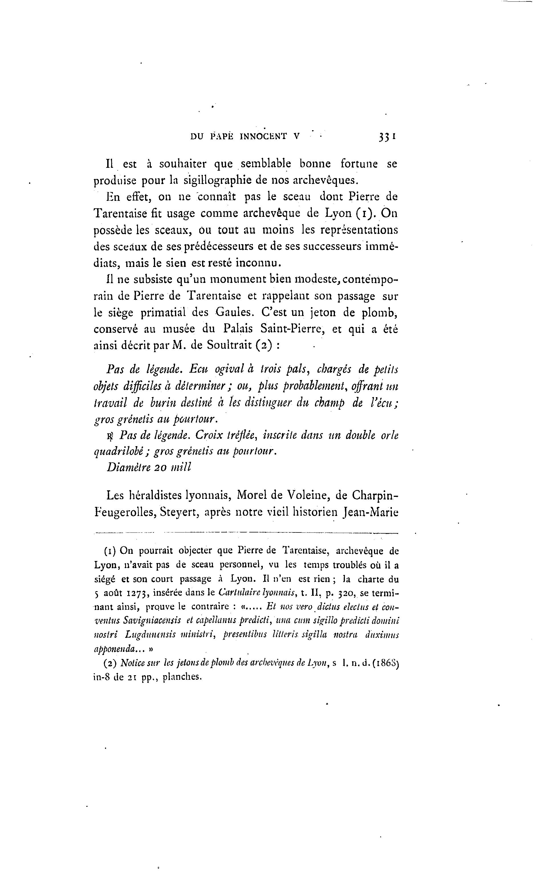 DU PAPE INNOCENT V • • 33I Il est à souhaiter que semblable bonne fortune se produise pour la sigillographie de nos archevêques. En effet, on ne "connaît pas le sceau dont Pierre de Tarentaise fit usage comme archevêque de Lyon ( i ) . On possède les sceaux, ou tout au moins les représentations des sceaux de ses prédécesseurs et de ses successeurs immé- diats, mais le sien est resté inconnu. Il ne subsiste qu'un monument bien modeste, contempo- rain de Pierre de Tarentaise et rappelant son passage sur le siège primatial des Gaules. C'est un jeton de plomb, conservé au musée du Palais Saint-Pierre, et qui a été ainsi décrit par M. de Soultrait (2) : Pas de légende. Ecu ogival à trois pals, chargés de petits objets difficiles à déterminer ; ou, plus probablement, offrant un travail de burin destiné à Us distinguer du champ de Vécu; gros grénetis au pourtour. ij! Pas de légende. Croix iréflée, inscrite dans un double orle quadrilobè ; gros grénetis au pourtour. Diamètre 20 mill Les héraldistes lyonnais, Morel de Voleine, de Charpin- Feugerolles, Steyert, après notre vieil historien Jean-Marie (1) On pourrait objecter que Pierre de Tarentaise, archevêque de Lyon, n'avait pas de sceau personnel, vu les temps troublés où il a siégé et son court passage à Lyon. Il n'en est rien ; la charte du 5 août 1273, insérée dans le Cartulairelyonnais, t. II, p. 320, se termi- nant ainsi, prouve le contraire : < Et nos ve.ro diclus eleclus et con- ventus Savigniacensis et capellanus predicti, una cum sigillo predicti domini nosiri Lugditncnsis ministri, presentibus litleris sigilla nostra âuximus apponenda... » (2) Notice sur tes jetons de plomb des archevêques de Lyon, s 1. n. d. (186S) in-8 de 21 pp., planches.
