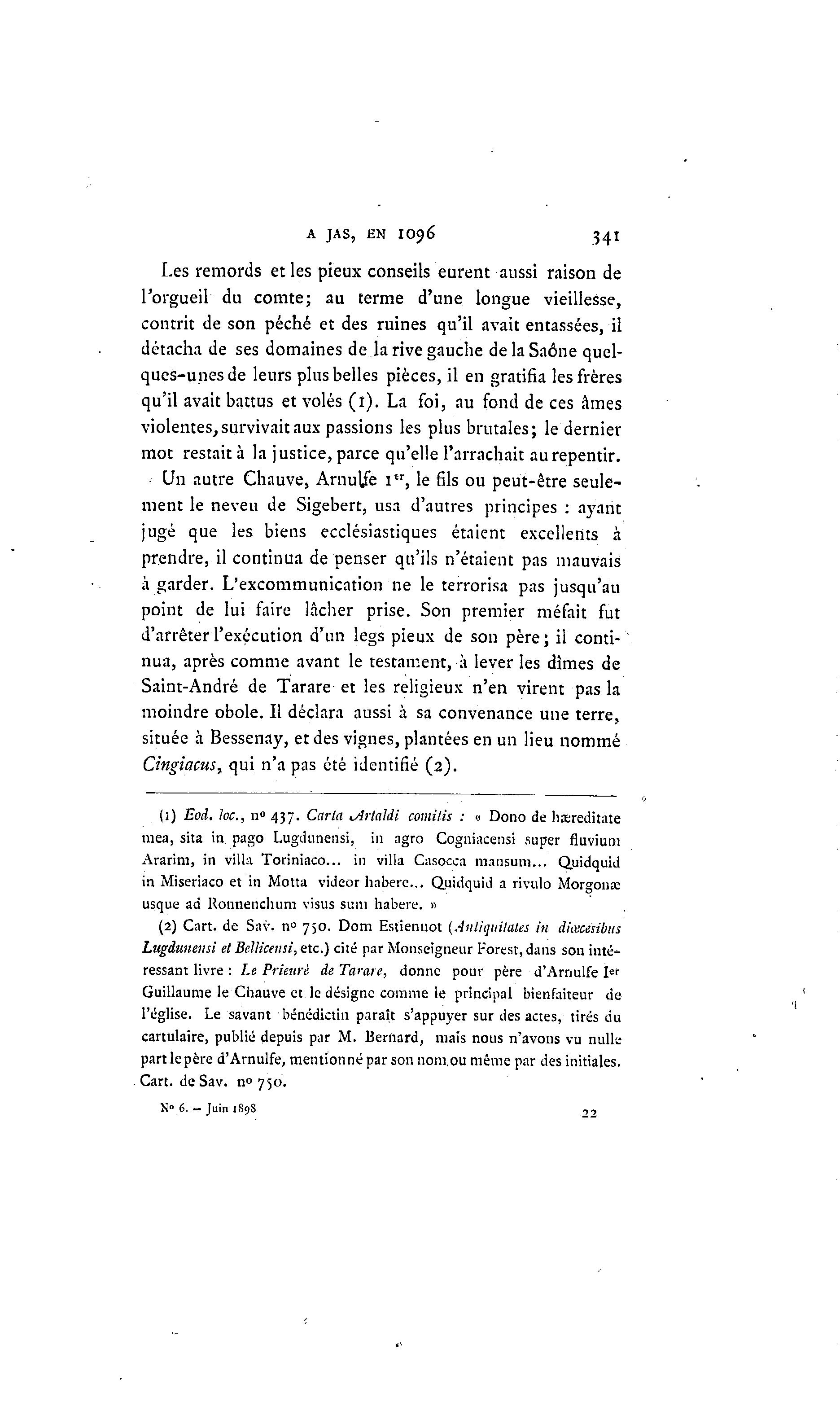 A JAS, EN IO96 34I Les remords et les pieux conseils eurent aussi raison de l'orgueil du comte; au terme d'une longue vieillesse, contrit de son péché et des ruines qu'il avait entassées, il détacha de ses domaines d e l à rive gauche de la Saône quel- ques-unes de leurs plus belles pièces, il en gratifia les frères qu'il avait battus et volés (1). La foi, au fond de ces âmes violentes, survivait aux passions les plus brutales; le dernier mot restait à la justice, parce qu'elle l'arrachait au repentir. Un autre Chauve, Arnutfe I er , le fils ou peut-être seule- ment le neveu de Sigebert, usa d'autres principes : ayant jugé que les biens ecclésiastiques étaient excellents à prendre, il continua de penser qu'ils n'étaient pas mauvais à garder. L'excommunication ne le terrorisa pas jusqu'au point de lui faire lâcher prise. Son premier méfait fut d'arrêter l'exécution d'un legs pieux de son père; il conti- nua, après comme avant le testament, à lever les dîmes de Saint-André de Tarare- et les religieux n'en virent pas la moindre obole. Il déclara aussi à sa convenance une terre, située à Bessenay, et des vignes, plantées en un lieu nommé Cingiacus, qui n'a pas été identifié (2). (1) Eod. loc, n° 437. Caria lArtaldi comilis : « Dono de hxreditâte mea, sita in pago Lugdunensi, in agro Cogniacensi super fluvium Ararim, in villa Toriniaco... in villa Casocca mansum... Quidquid in Miseriaco et in Motta videor haberc... Quidquid a rivulo Morgonœ usque ad Ronnenchum visus sum habere. » (2) Cart. de Sav. n° 750. Dom Estiennot (Antiquilales in diœcesibus Lugdunensi et Bellicensi, etc.) cité par Monseigneur Forest, dans son inté- ressant livre : Le Prieuré de Tarare, donne pour père d'Arnulfe Ief Guillaume le Chauve et le désigne comme le principal bienfaiteur de l'église. Le savant bénédictin paraît s'appuyer sur des actes, tirés du cartulaire, publié depuis par M. Bernard, mais nous n'avons vu nulle part le père d'Arnulfe, mentionné par son nom.ou même par des initiales. Cart. de Sav. no 750. X° 6. — Juin 189S 22