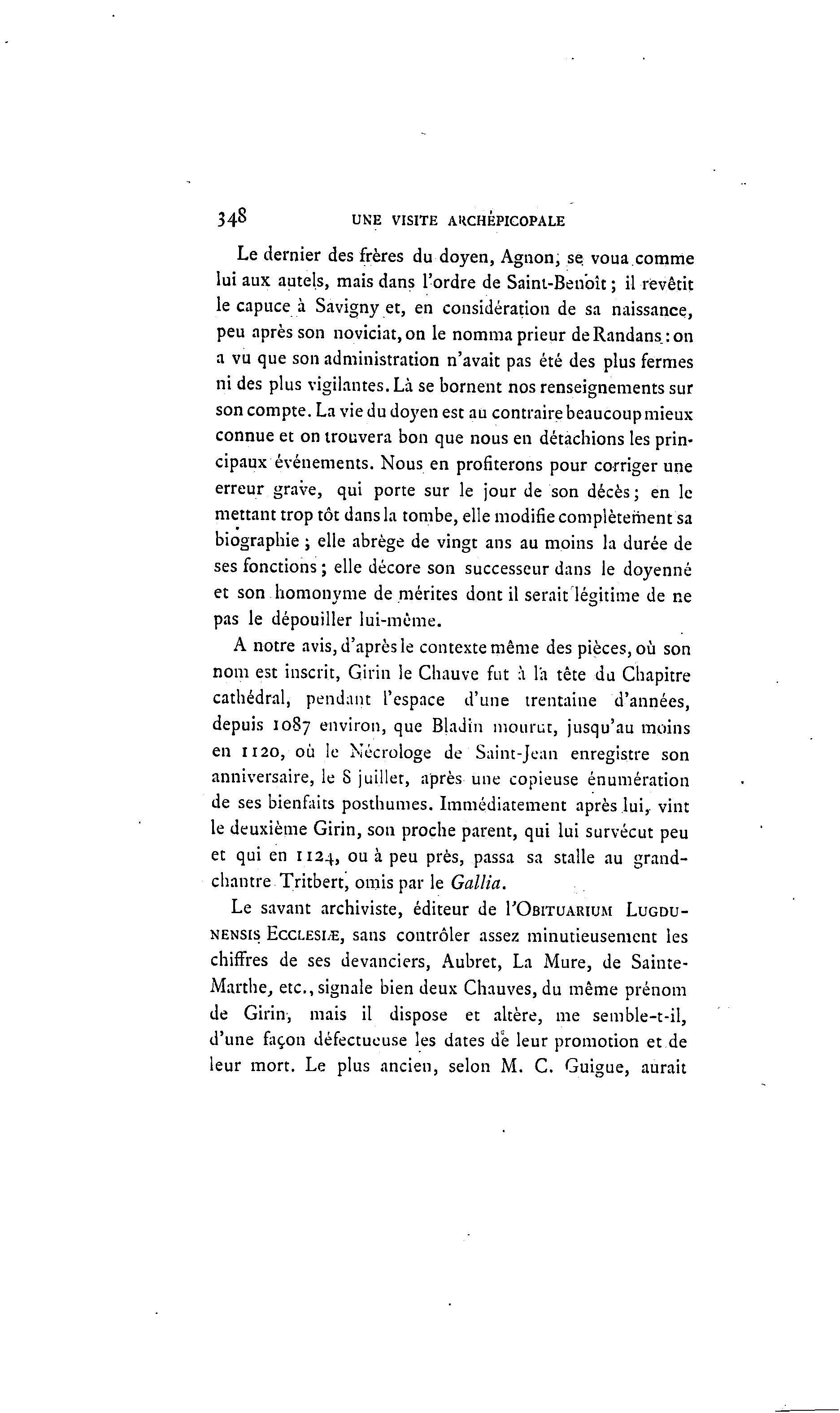 34^ UNE VISITE ARCHEPICOPALE Le dernier des frères du doyen, Agnon, se voua.comme lui aux autels, mais dans l'ordre de Saint-Benoît ; il revêtit le capuce à Savigny et, en considération de sa naissance, peu après son noviciat, on le nomma prieur deRandans:on a vu que son administration n'avait pas été des plus fermes ni des plus vigilantes. Là se bornent nos renseignements sur son compte. La vie du doyen est au contraire beaucoup mieux connue et on trouvera bon que nous en détachions les prin- cipaux événements. Nous en profiterons pour corriger une erreur grave, qui porte sur le jour de son décès ; en le mettant trop tôt dans la tombe, elle modifie complètement sa biographie ; elle abrège de vingt ans au moins la durée de ses fonctions ; elle décore son successeur dans le doyenné et son homonvme de mérites dont il serait légitime de ne pas le dépouiller lui-même. A notre avis, d'après le contexte même des pièces, où son nom est inscrit, Girin le Chauve fut à l'a tête du Chapitre cathédral, pendant l'espace d'une trentaine d'années, depuis 1087 environ, que BlaJin mourut, jusqu'au moins en 1120, où le Nécrologe de Saint-Jean enregistre son anniversaire, le S juillet, après une copieuse énumération de ses bienfaits posthumes. Immédiatement après lui, vint le deuxième Girin, son proche parent, qui lui survécut peu et qui en 1124, ou à peu près, passa sa stalle au grand- chantre Tritbert, omis par le Gallia. Le savant archiviste, éditeur de I'OBITUARIUM LUGDU- NENSIS ECCLESI^, sans contrôler assez minutieusement les chiffres de ses devanciers, Aubret, La Mure, de Sainte- Marthe, etc., signale bien deux Chauves, du même prénom de Girin, mais il dispose et altère, me semble-t-il, d'une façon défectueuse les dates de leur promotion et de leur mort. Le plus ancien, selon M. C. Guigue, aurait